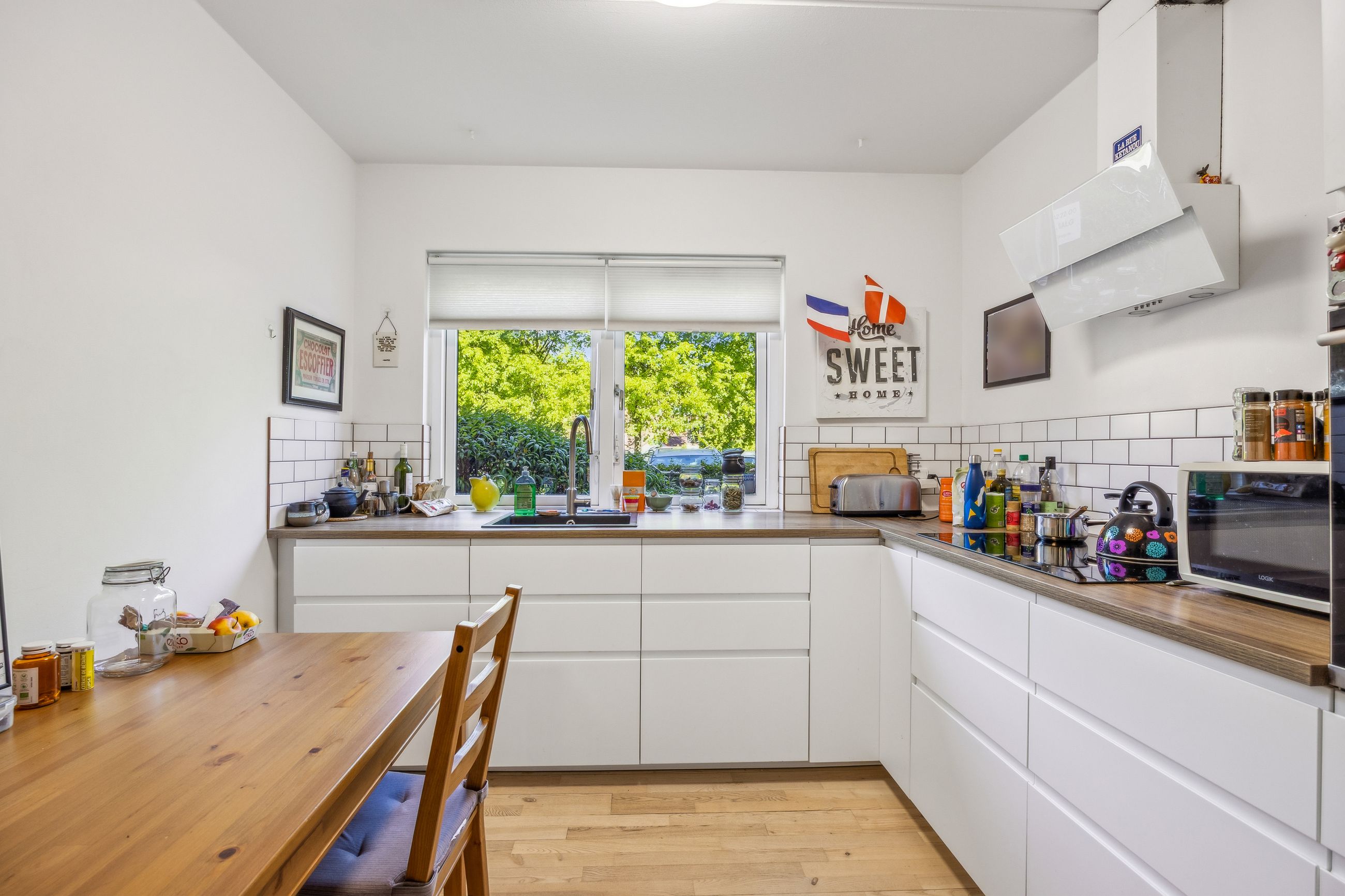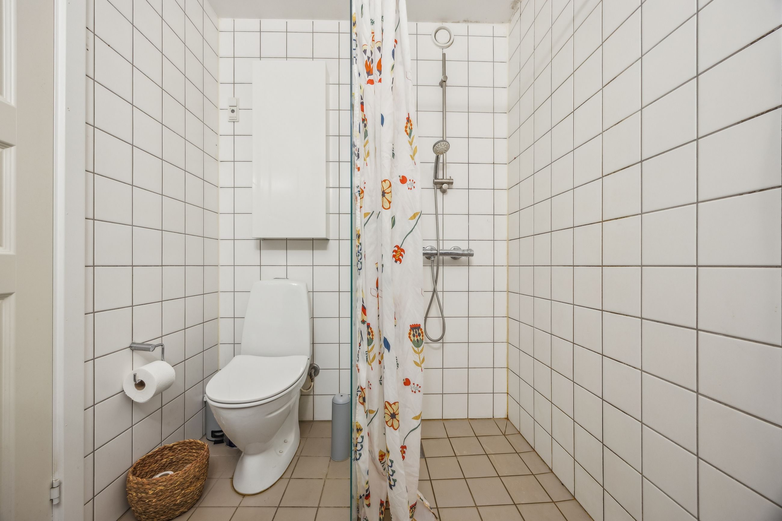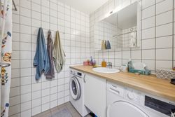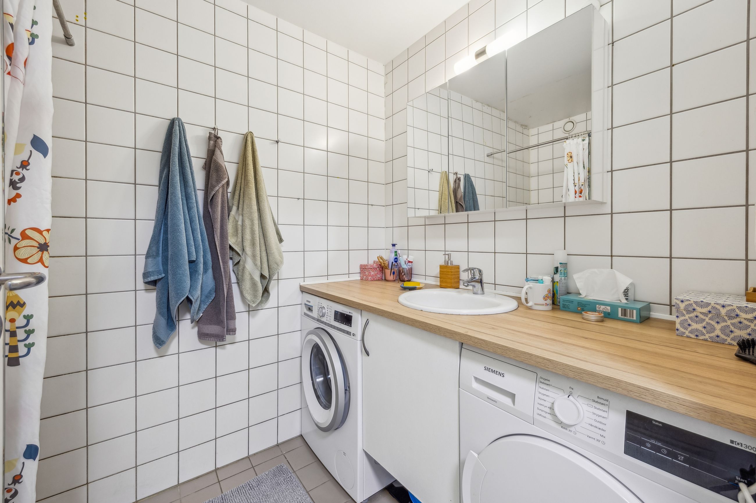 Det er det samme smukke gulv, der følger jer fra rum til rum, hvilket skaber en fin sammenhæng i indretningen - kun badeværelset skiller sig ud med sine lyse fliser, og her får I separat brus, vaskemaskine og skabsplads, hvilket er yderst attraktivt, da man som regel ikke har meget plads på de gamle københavnerbadeværelser. Det moderne køkken har plads til spisehjørne og er i åben forbindelse til den dejlige stue.