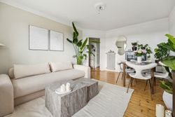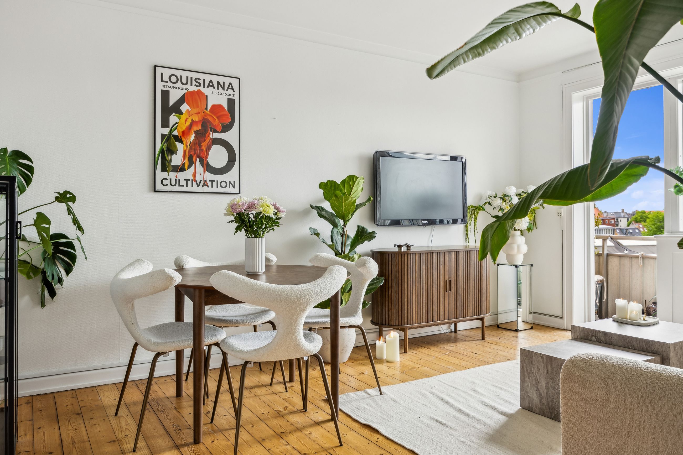 Stuen har en god størrelse med spise plads og sofa område - stuen er meget lys, idet vi er på 5. sal og med fri udsigt over den røde plads. Du kan nyde solen hele dagen fra lejligheden anden altan.