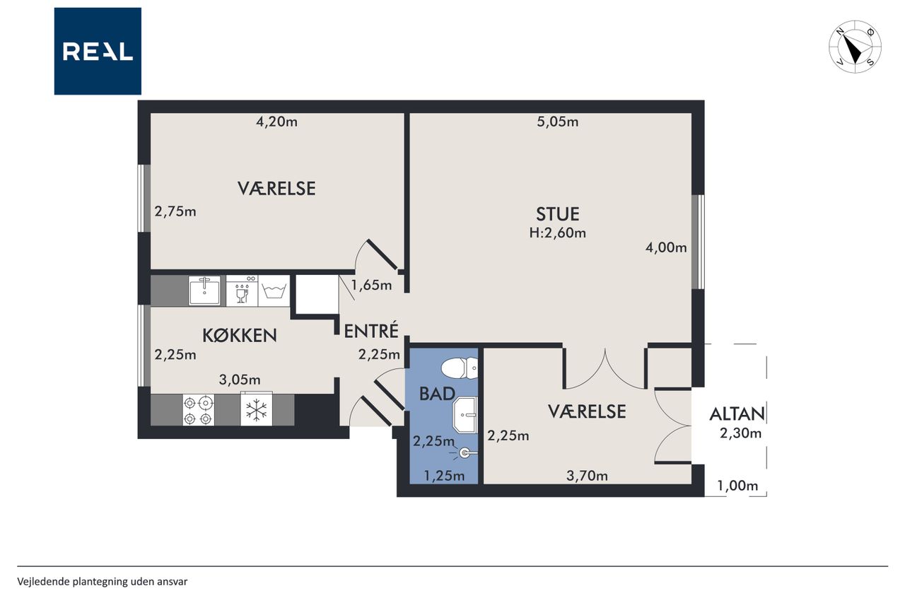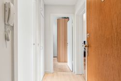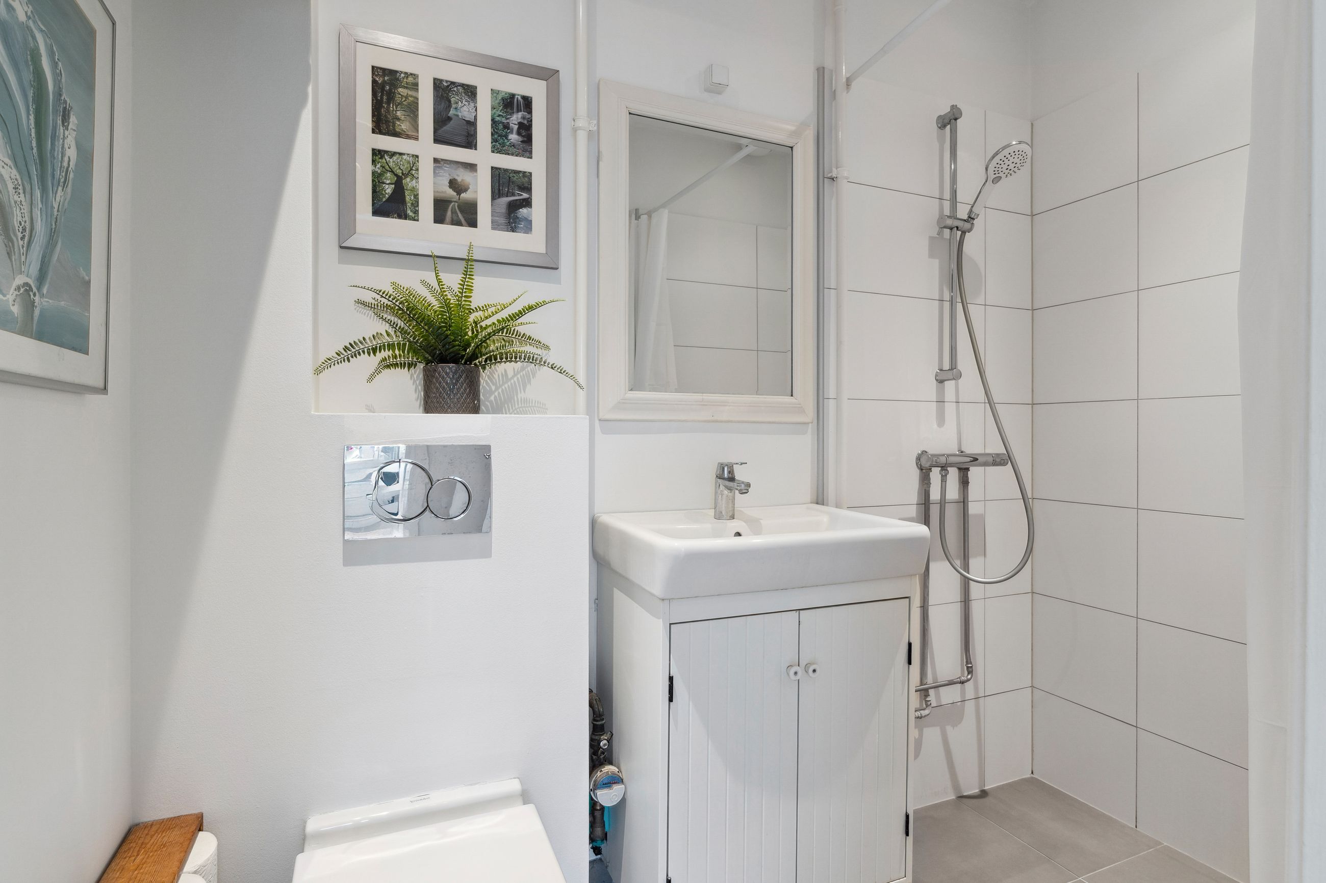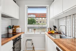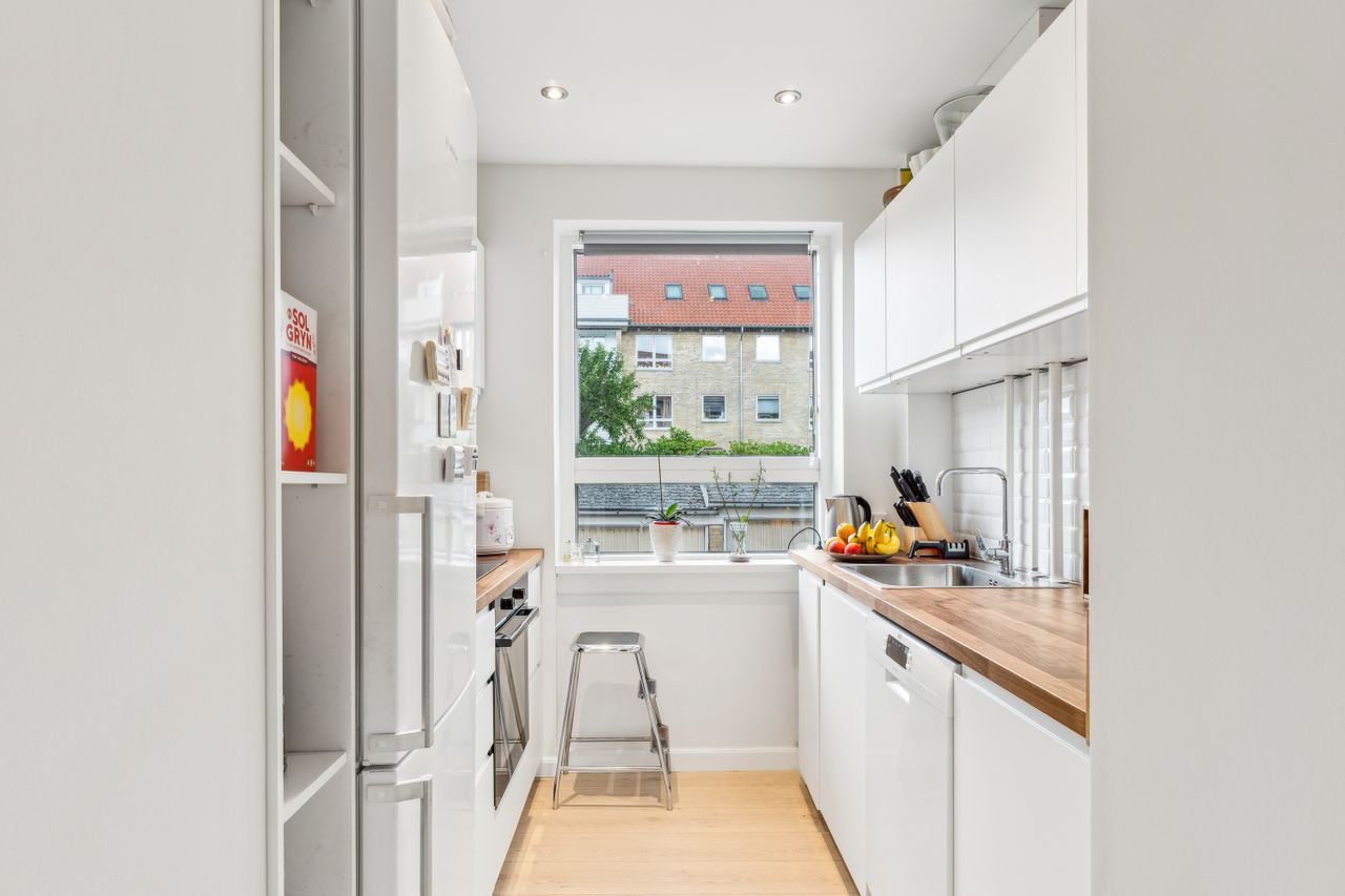 Lejligheden indeholder entré, hvorfra der er adgng til flot klinkebadeværelse med sep brus. Køkkenet har en god størrelse og pænt - der er åbne vaske- og opvaskemaskine.