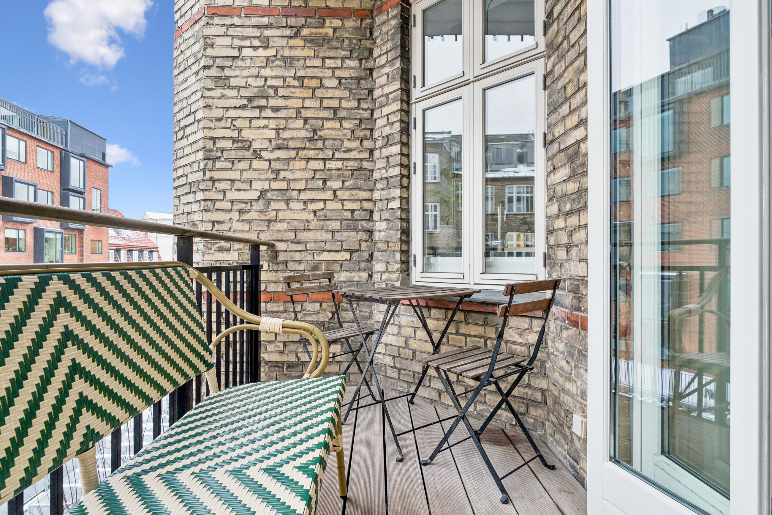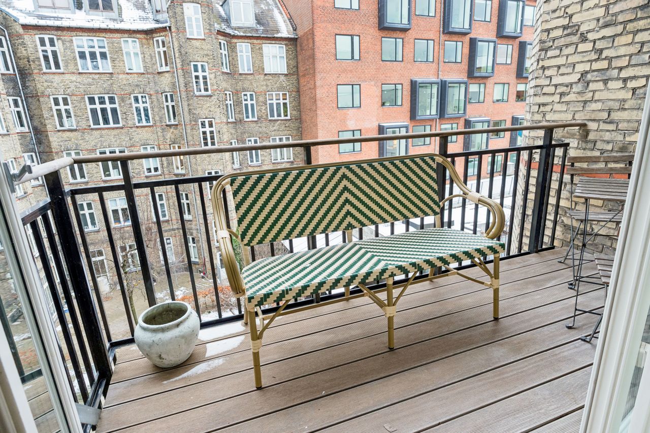 På altanen er der god plads til at nyde en solrig eftermiddag med loungemøbler og grønne planter i hyggelige omgivelser.
