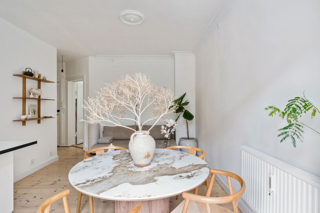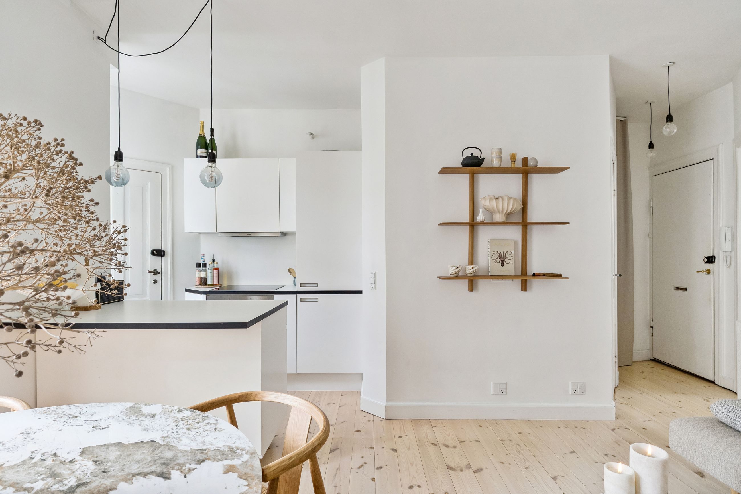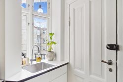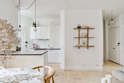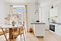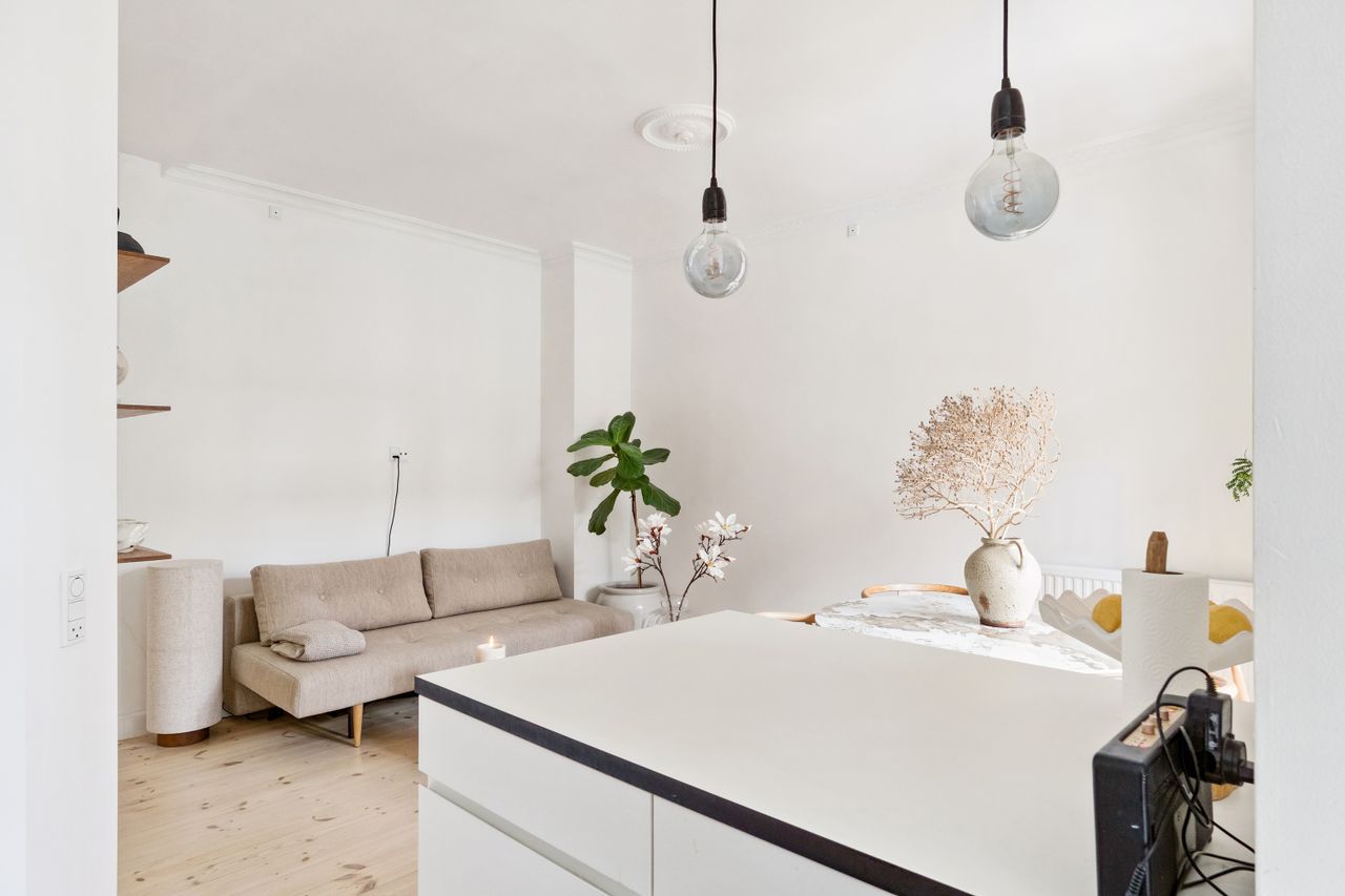 Lejligheden har en åben planløsning, hvor det stilrene køkken ligger i direkte forbindelse med den lyse og rummelige stue. Her er god plads til både et sofaarrangement, med plads til afslapning og et spiseområde med plads til gæster og hyggelige middage.