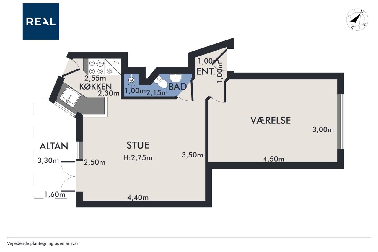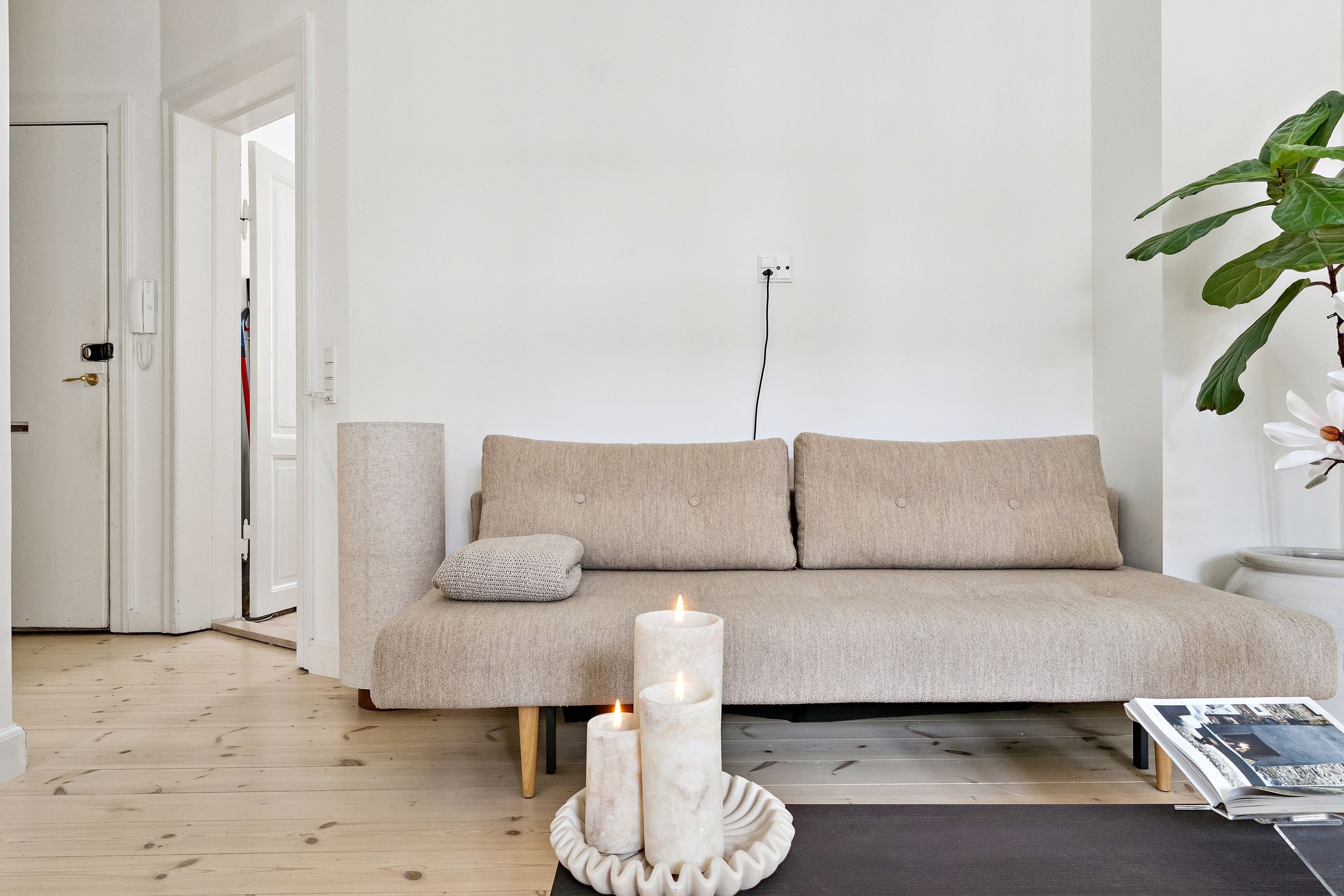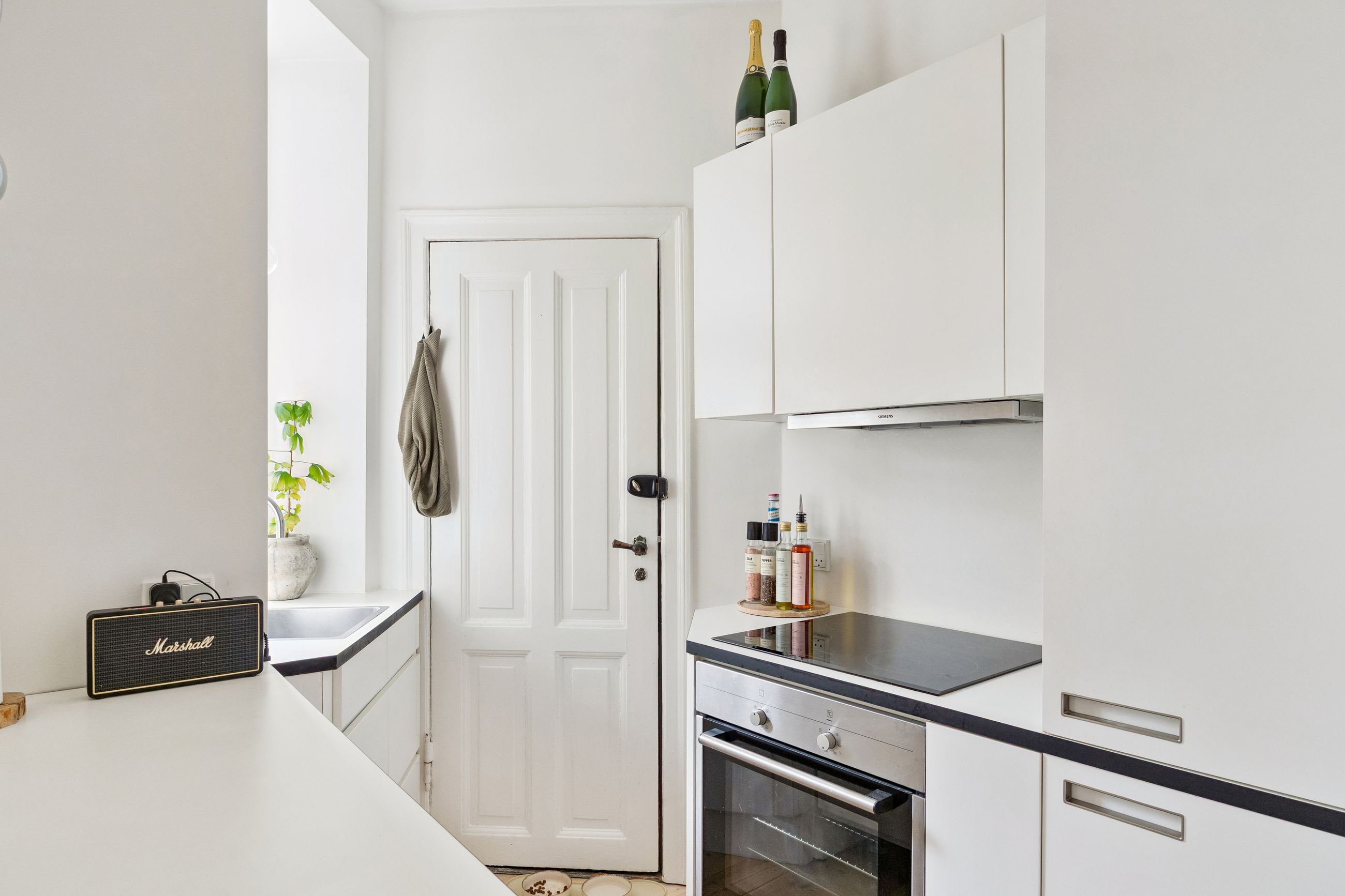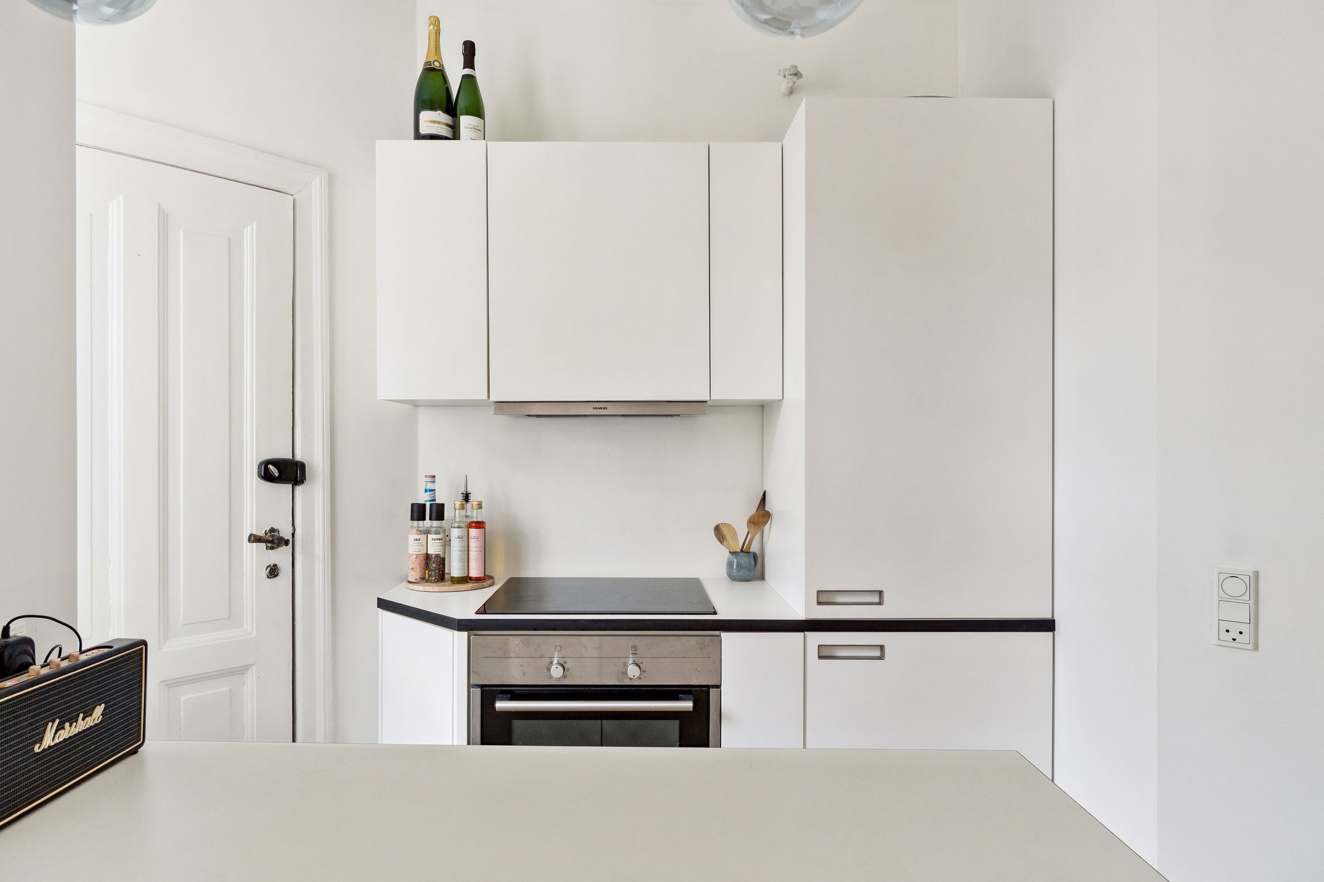 Lejligheden har en åben planløsning, hvor det stilrene køkken ligger i direkte forbindelse med den lyse og rummelige stue. Her er god plads til både et sofaarrangement, med plads til afslapning og et spiseområde med plads til gæster og hyggelige middage.