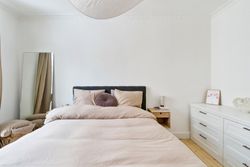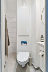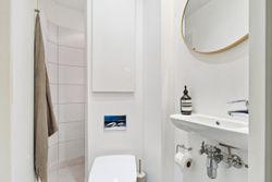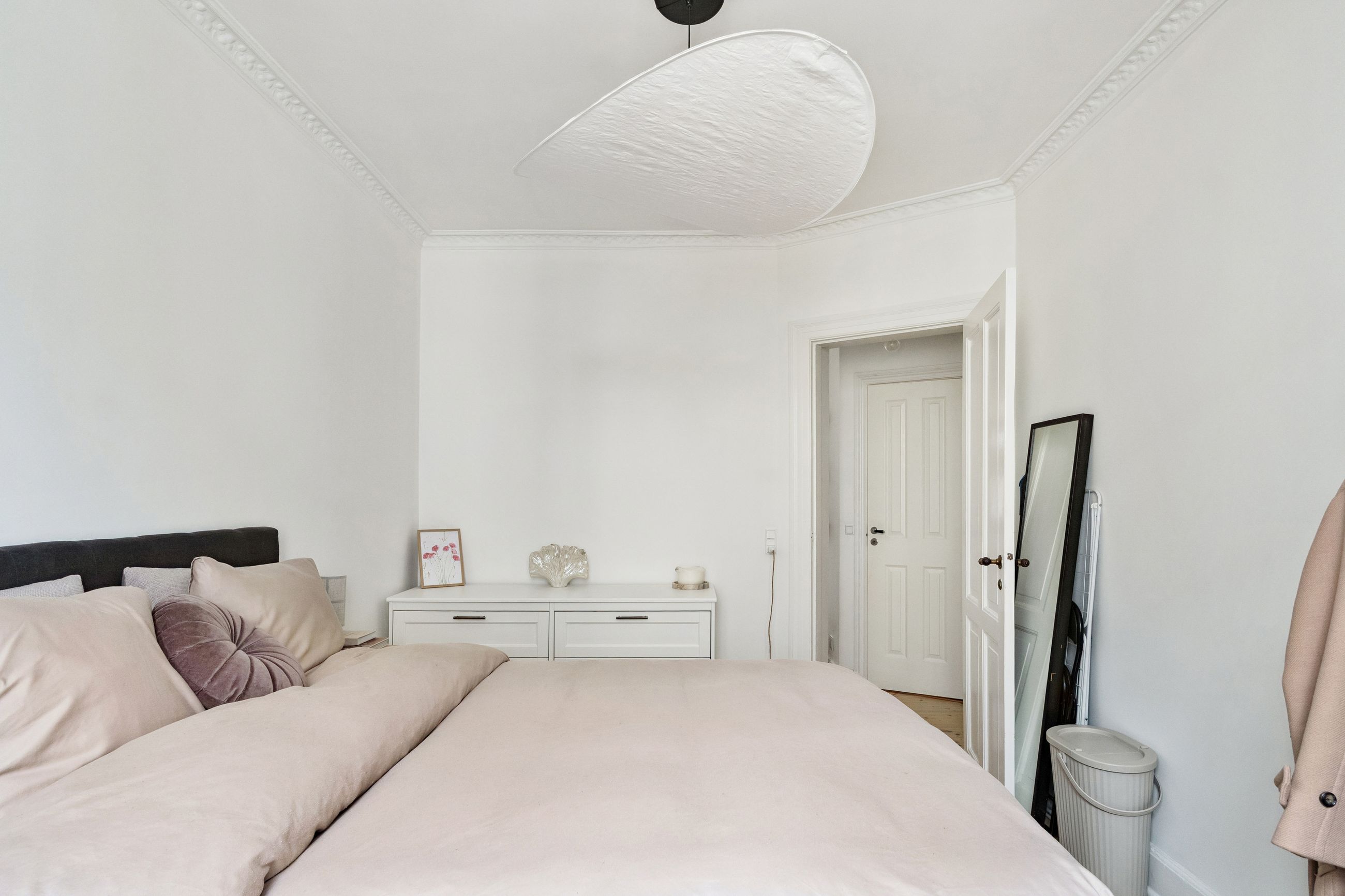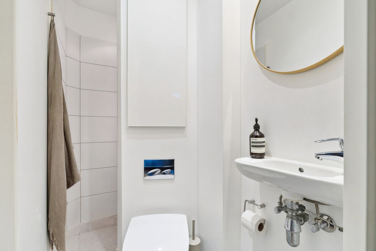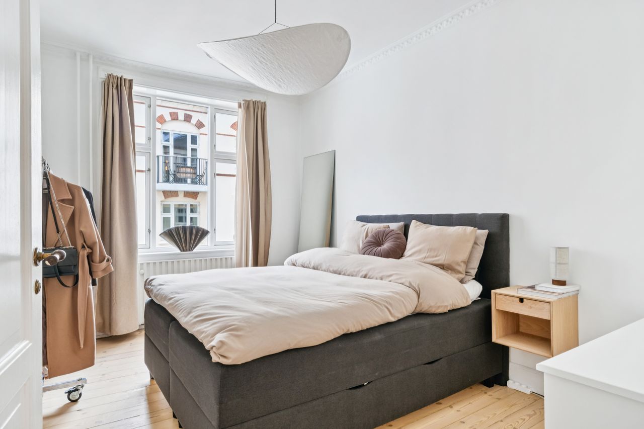 Det rummelige soveværelse har et skønt lysindfald fra det store vinduesparti og god plads til både seng og opbevaring. Badeværelset fremstår tidløst med separat bruseniche og moderne materialevalg.