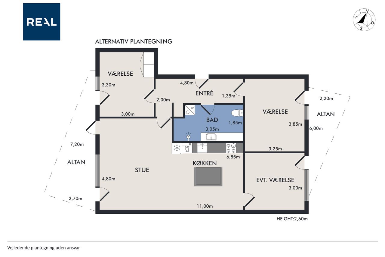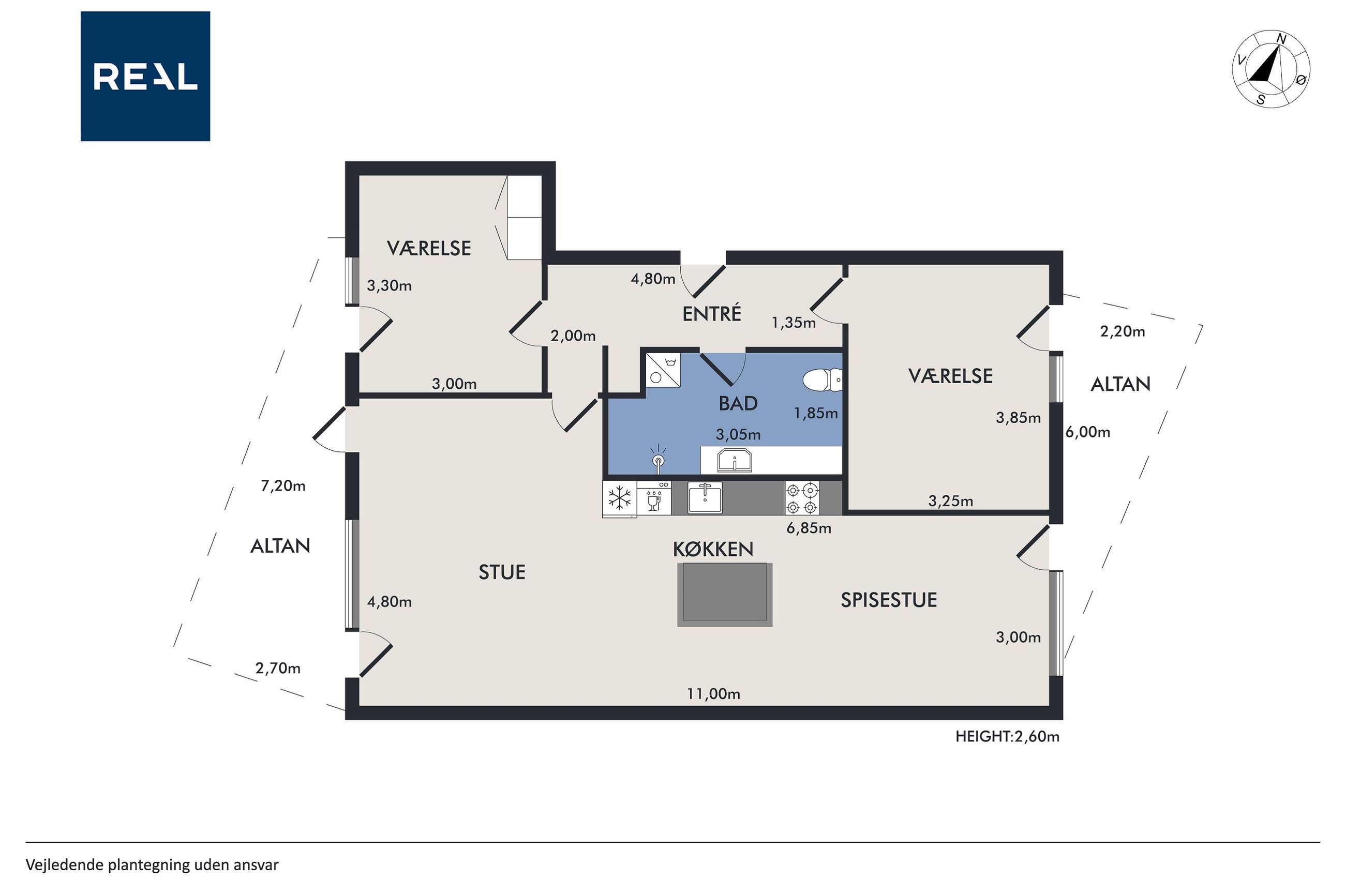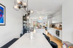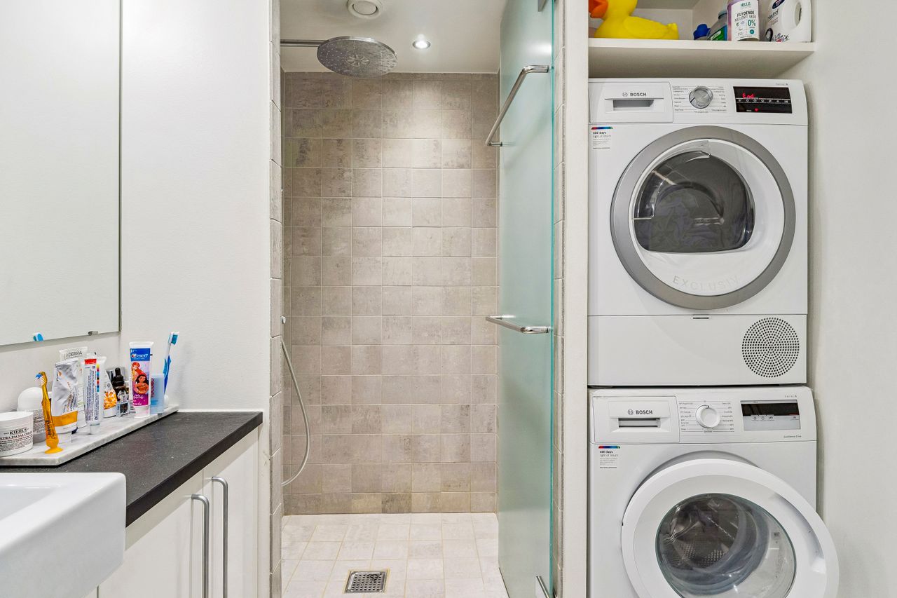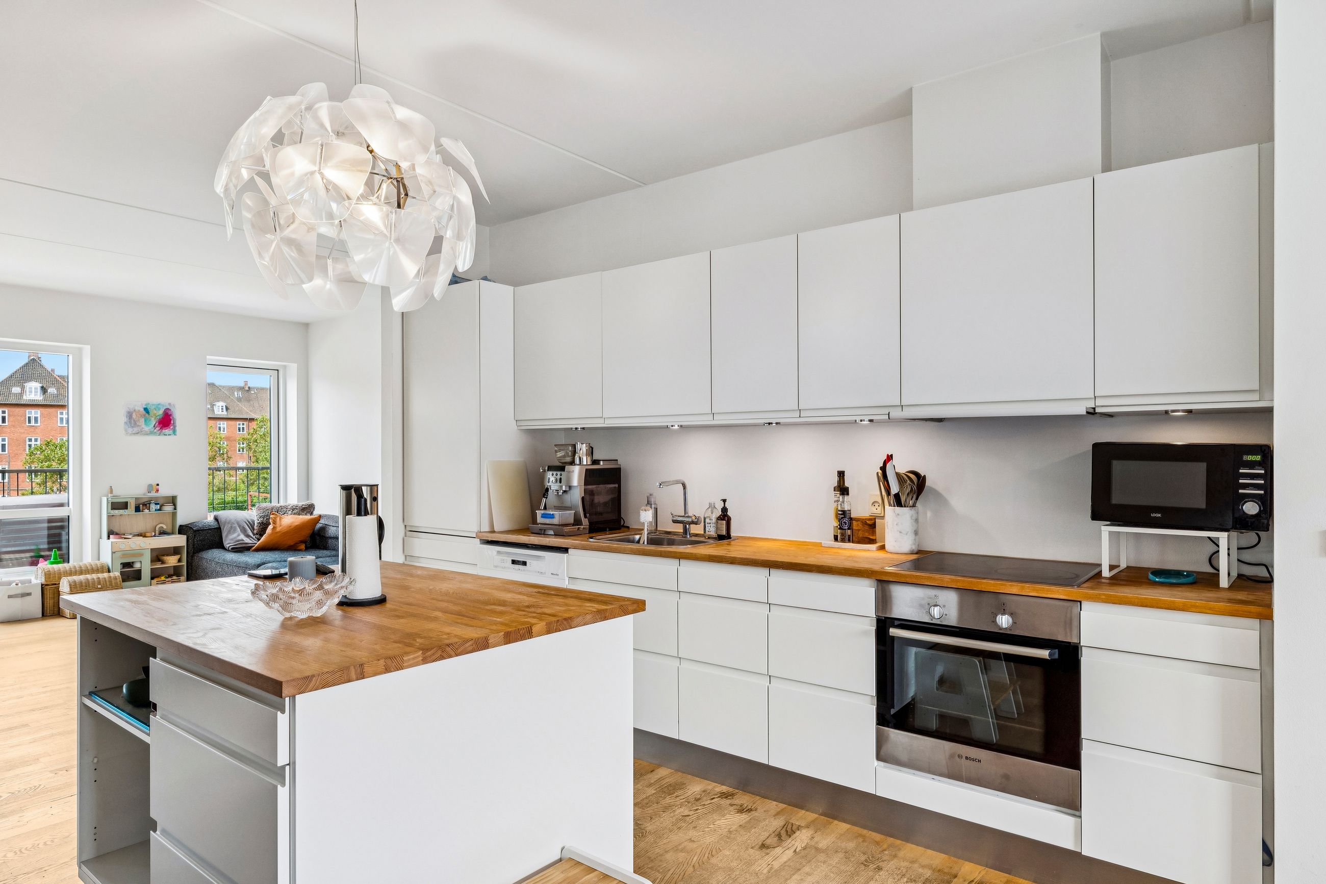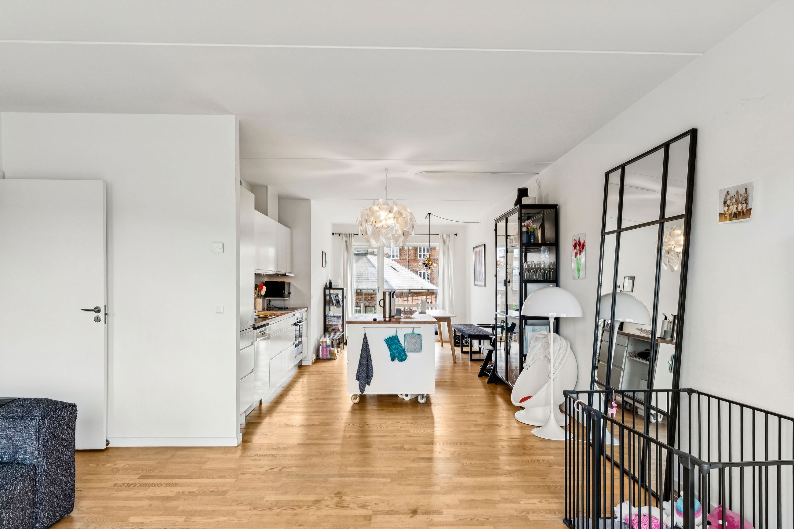 Boligens absolutte hjerte er det store og særdeles indbydende køkken-alrum, der smelter elegant sammen med både stue og spisestue. Her er der rigelig plads til kulinariske udfoldelser, hyggelige middage med familie og venner samt afslappende stunder i sofaen. Det er et rum, der indbyder til både livlig aktivitet og rolig afslapning – en sjælden kombination, som gør lejligheden helt unik. Badeværelset er funktionelt indrettet og rummer alt det essentielle, herunder mulighed for både privatliv og tøjvask. Det er en praktisk løsning, der gør hverdagen lettere, uden at gå på kompromis med komforten.