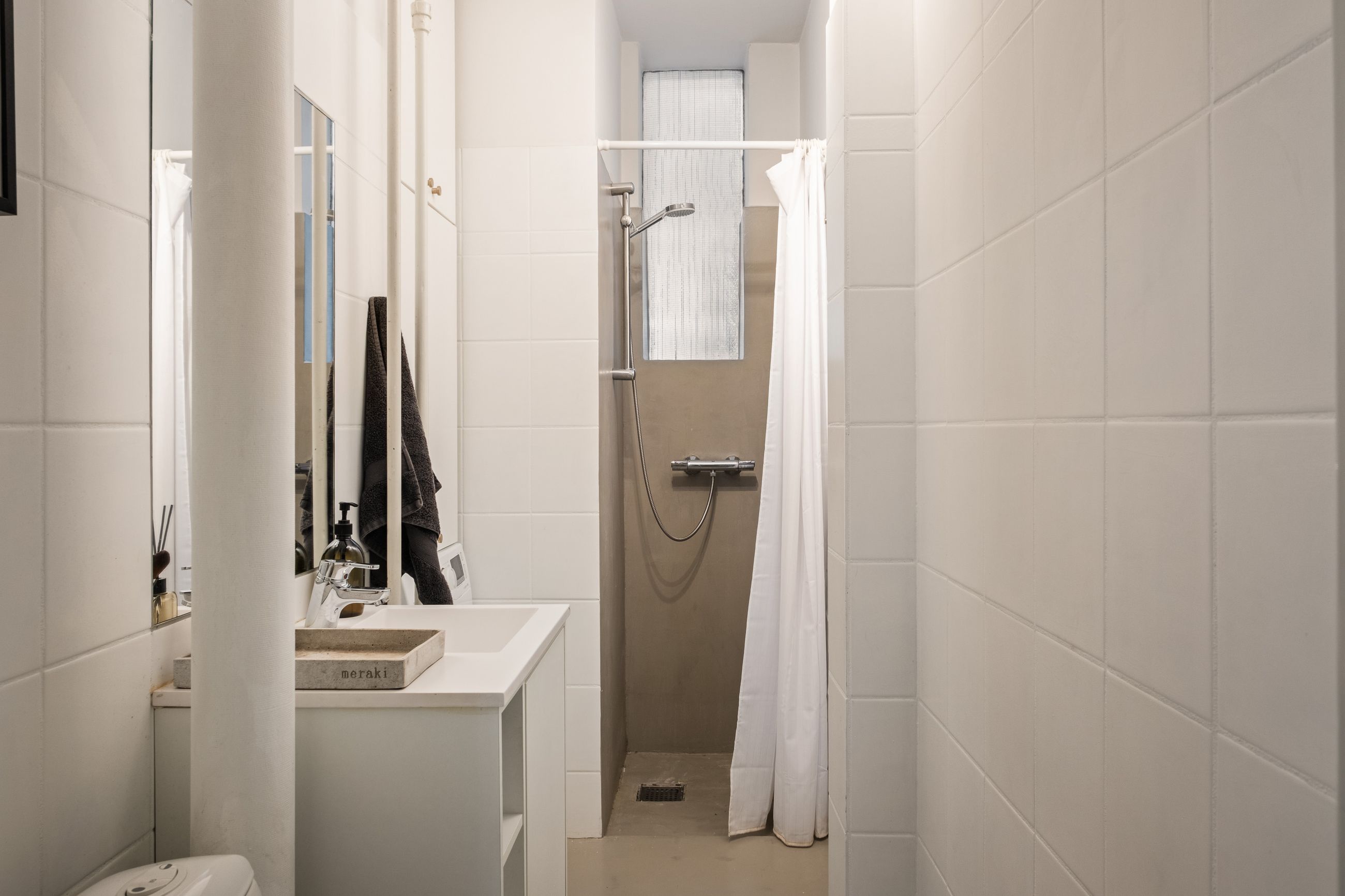 Lejlighedens badeværelse er i moderne og tidløs stil og med god plads, og vaskemaskine.