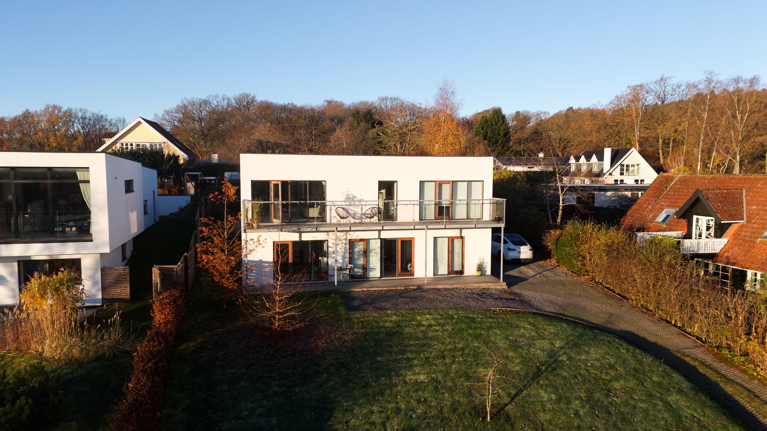Ejendommen fra 2017 er opført i tre etager og ligger på en smuk kuperet stor grund på 1.255 m2 med 250 m2 eksklusivt boligareal. Her er kvaliteten af materialerne helt i top, og det mærkes i hver eneste detalje. Den unikke placering giver optimale lysforhold, så solen kan nydes fra morgen til aften — både ude og inde. Dette er en bolig, hvor komfort, æstetik og kvalitet går op i en højere enhed.