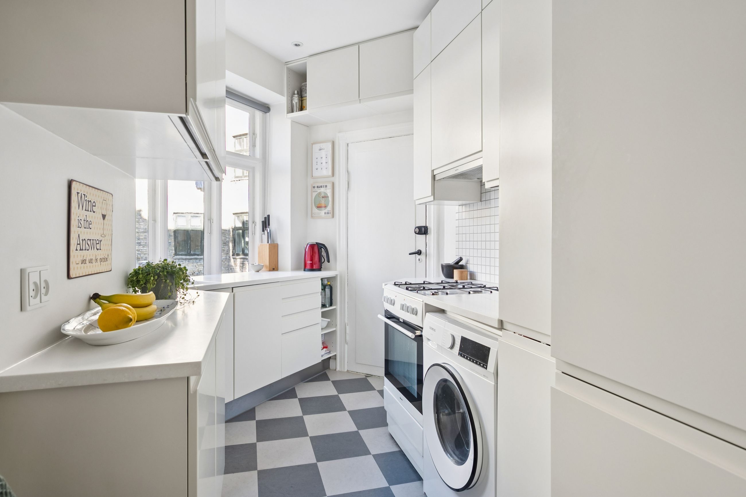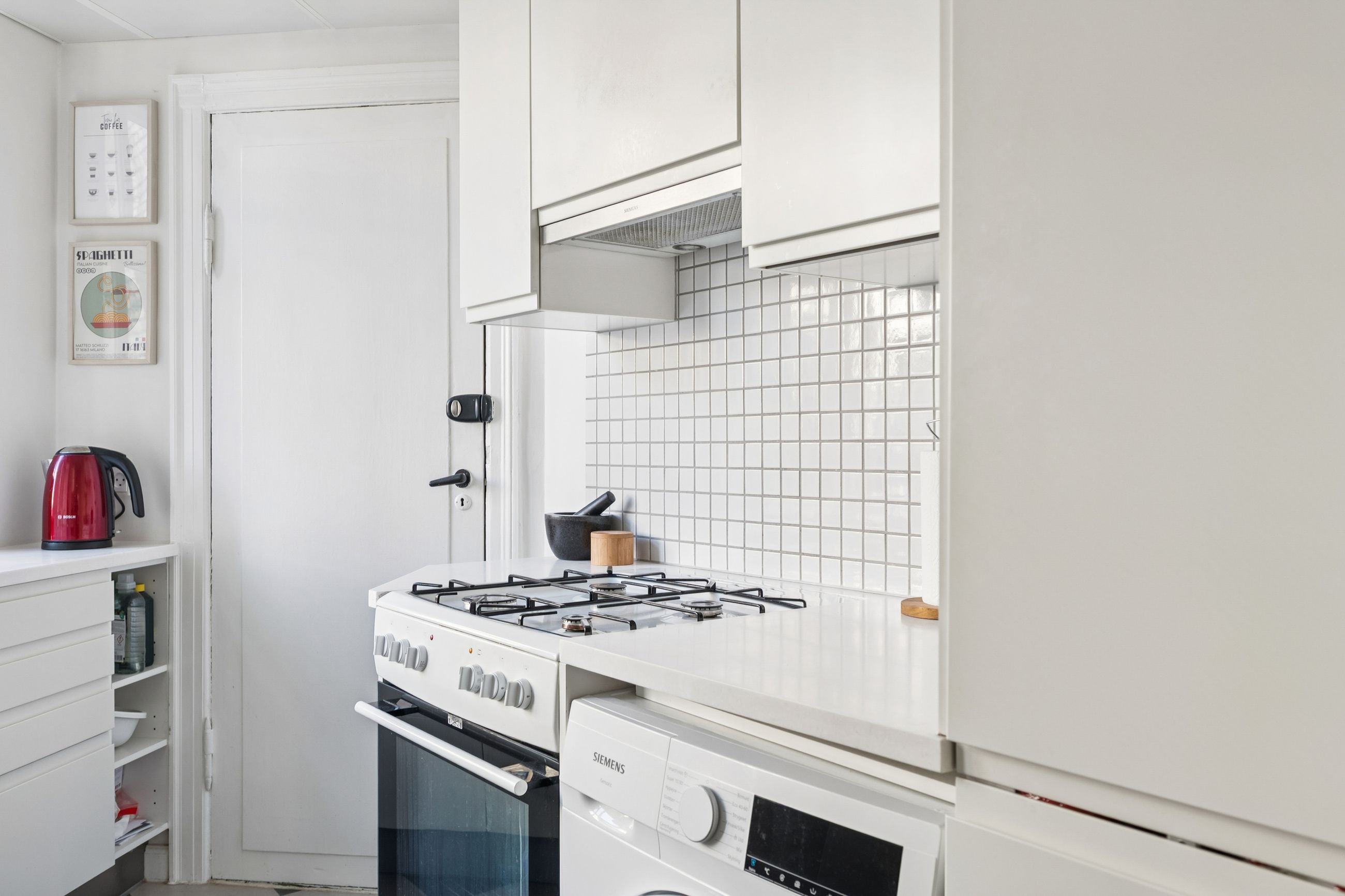 Køkkenet er holdt i et lyst, tidløst design med hvide elementer og grå-hvide fliser, der giver et elegant modspil. Her er der gjort plads til både opvaskemaskine og vaskemaskine – praktisk og bekvemt i hverdagen.