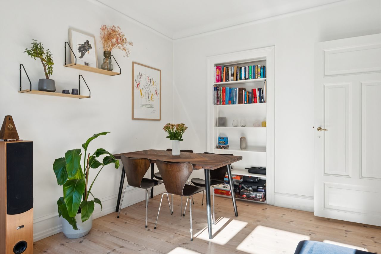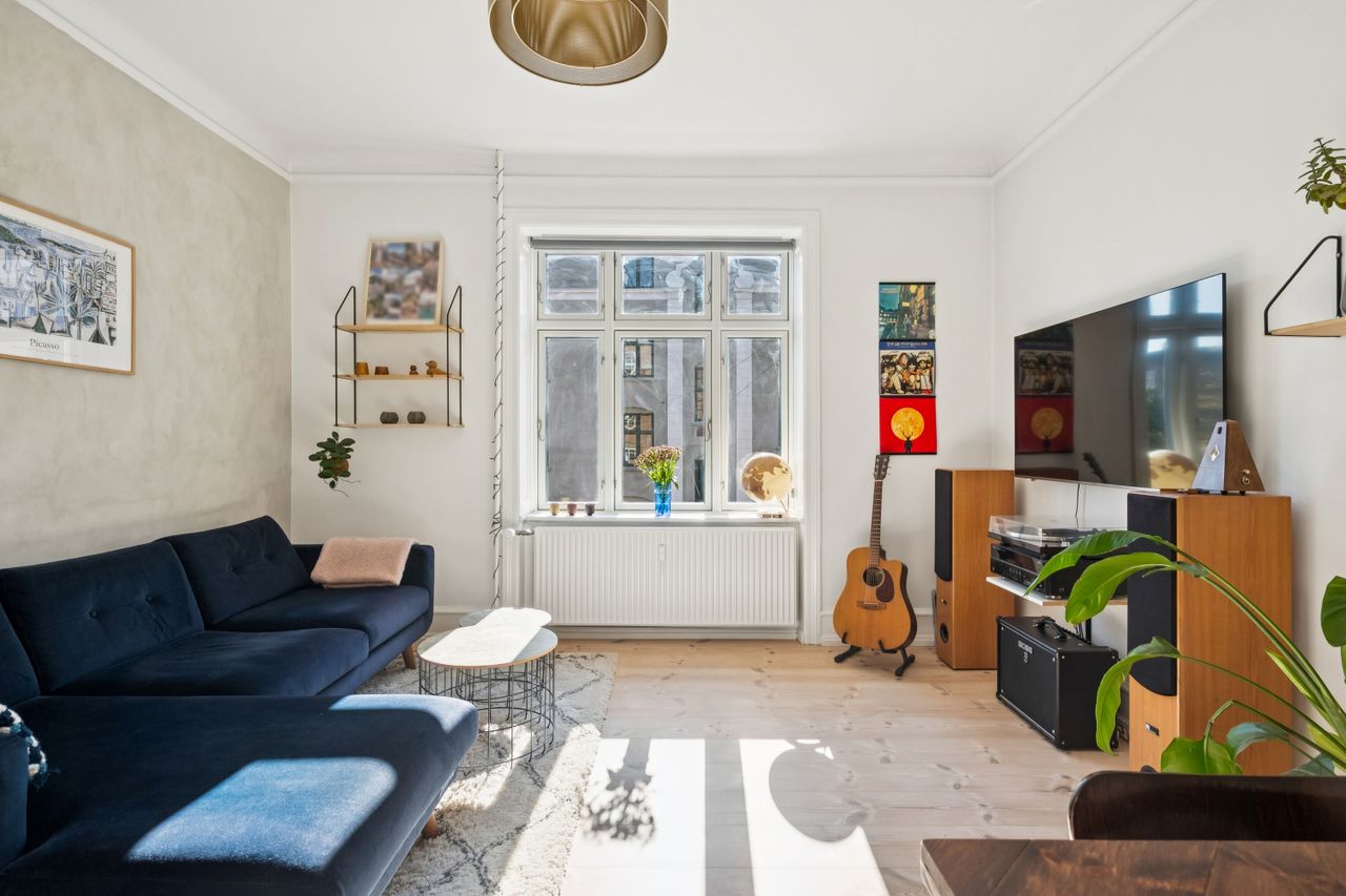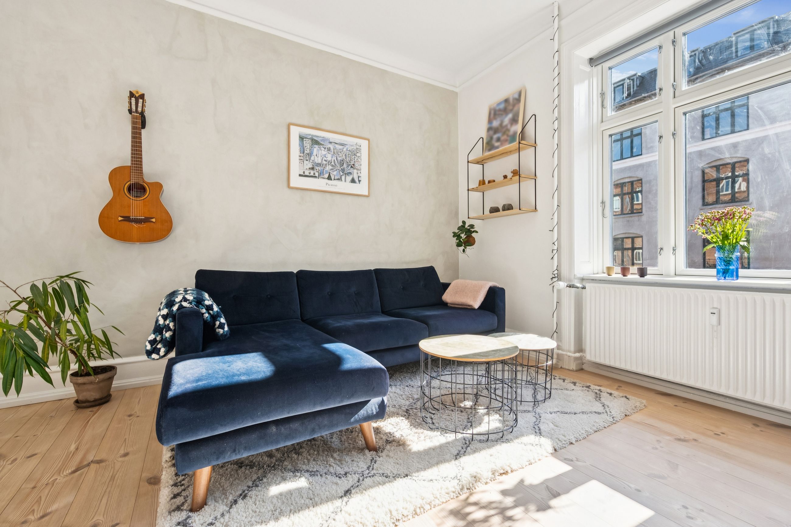 Træd indenfor i denne lyse og indbydende 2-værelses I/S lejlighed, hvor klassisk charme møder moderne funktionalitet. Allerede fra entréen fornemmer man den varme og harmoniske atmosfære, der kendetegner boligen. Lejlighedens hjerte er den smukke stue med brede plankegulve, høje hvide vægge og et fantastisk lysindfald, der skaber luft og liv. De originale stukdetaljer tilføjer et elegant, klassisk udtryk. Rummet er rummeligt nok til både sofa- og spiseafdeling – perfekt til både afslapning og hyggelige middage med venner.