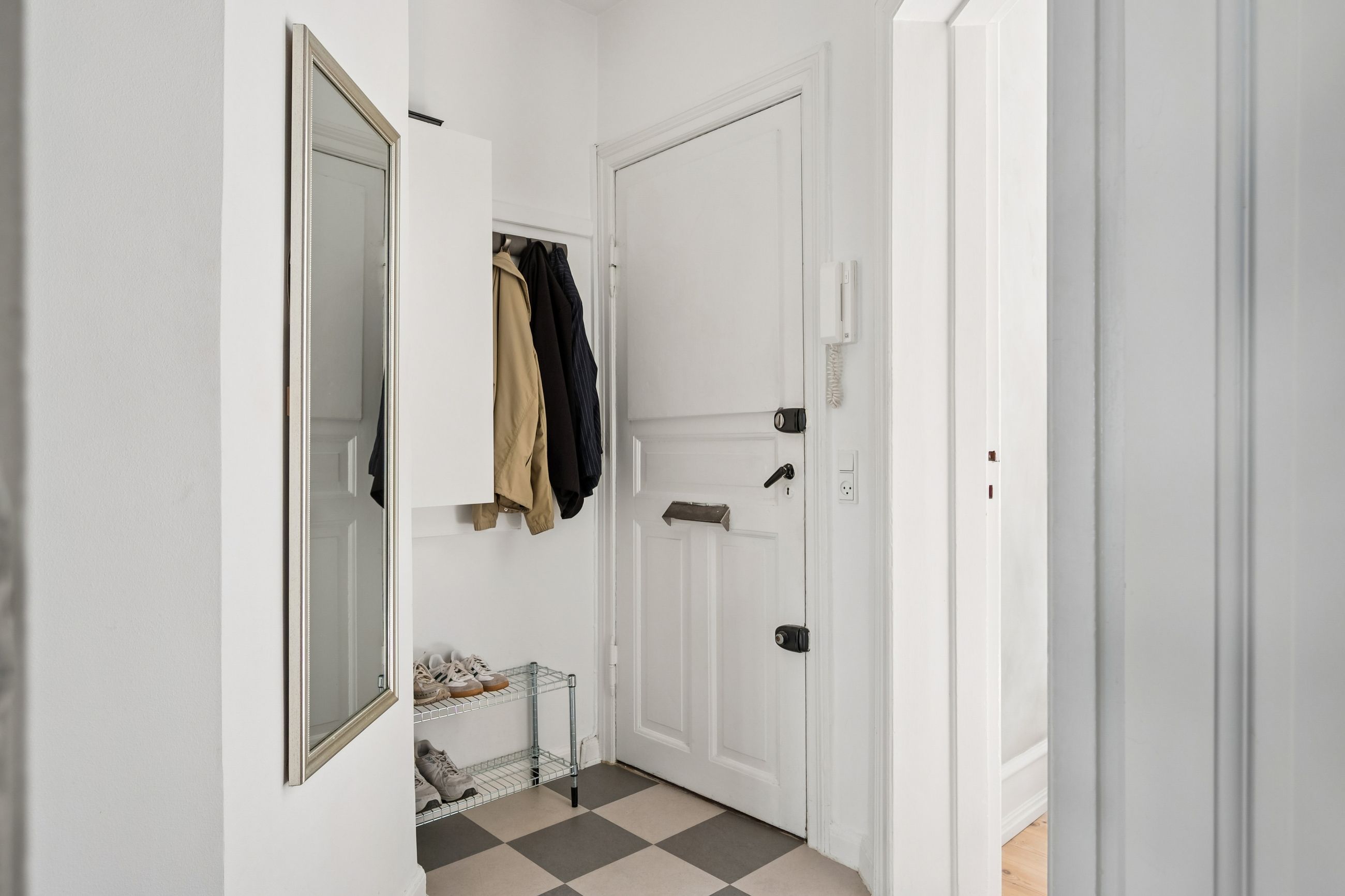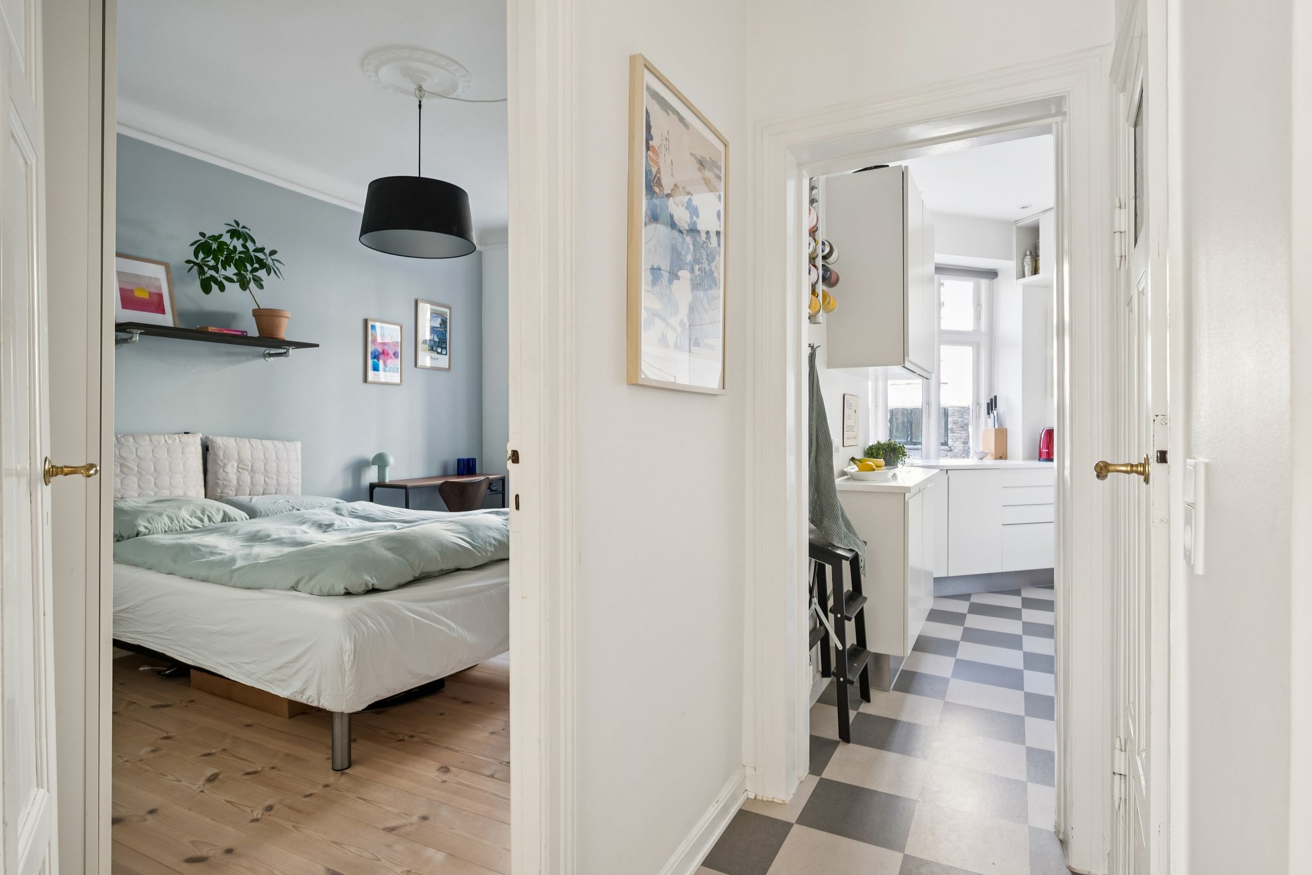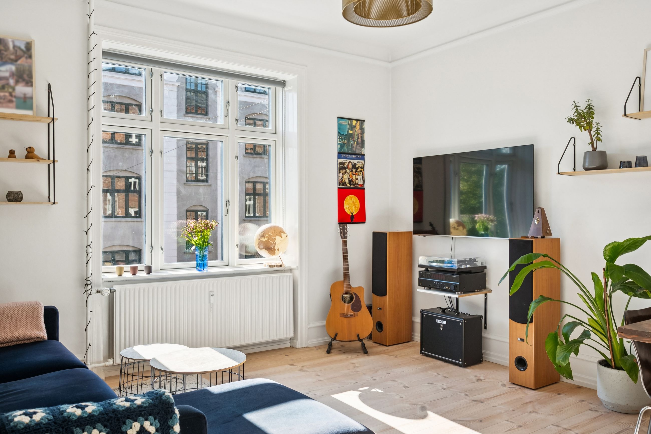 Træd indenfor i denne lyse og indbydende 2-værelses I/S lejlighed, hvor klassisk charme møder moderne funktionalitet. Allerede fra entréen fornemmer man den varme og harmoniske atmosfære, der kendetegner boligen. Lejlighedens hjerte er den smukke stue med brede plankegulve, høje hvide vægge og et fantastisk lysindfald, der skaber luft og liv. De originale stukdetaljer tilføjer et elegant, klassisk udtryk. Rummet er rummeligt nok til både sofa- og spiseafdeling – perfekt til både afslapning og hyggelige middage med venner.
