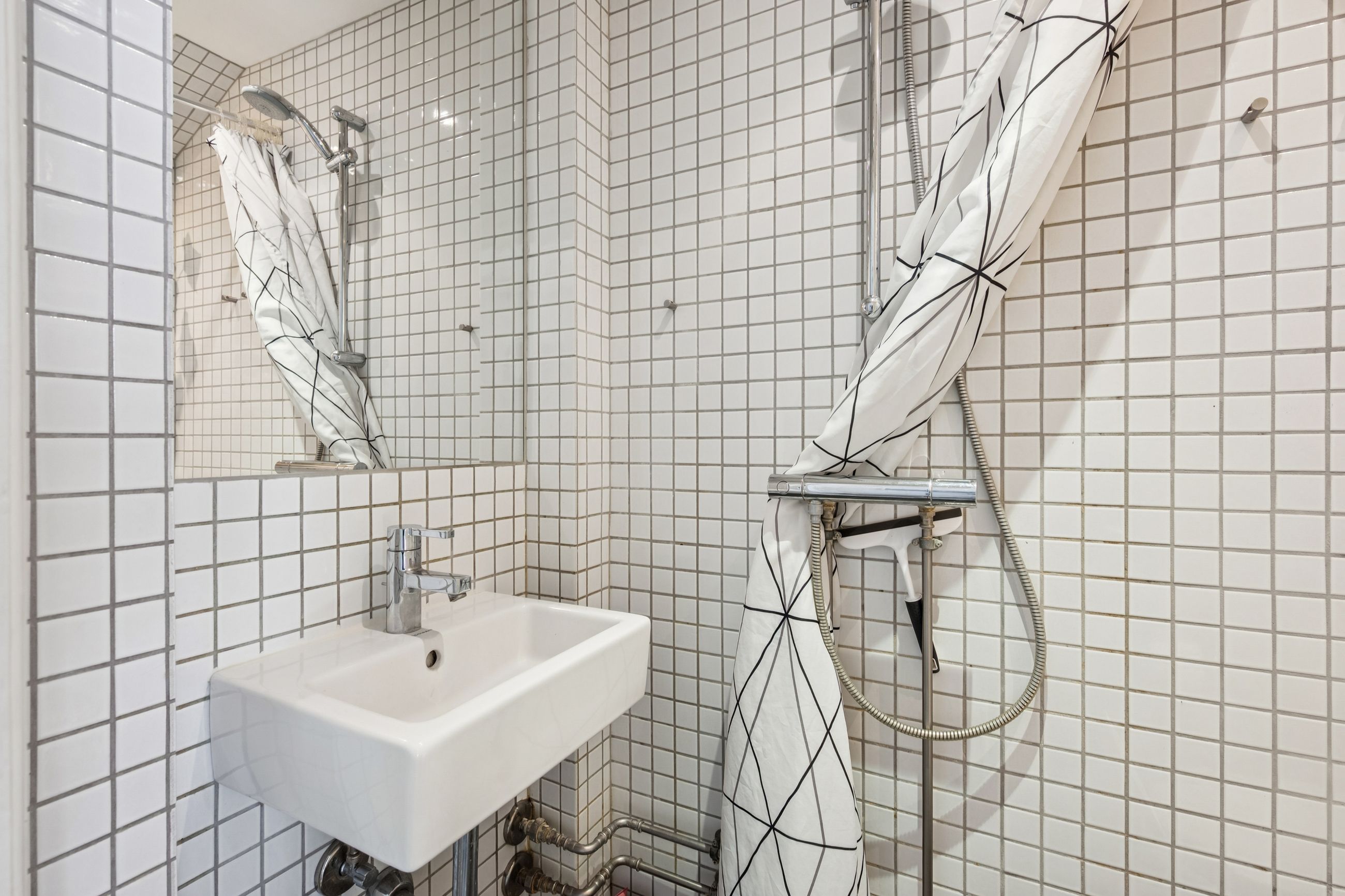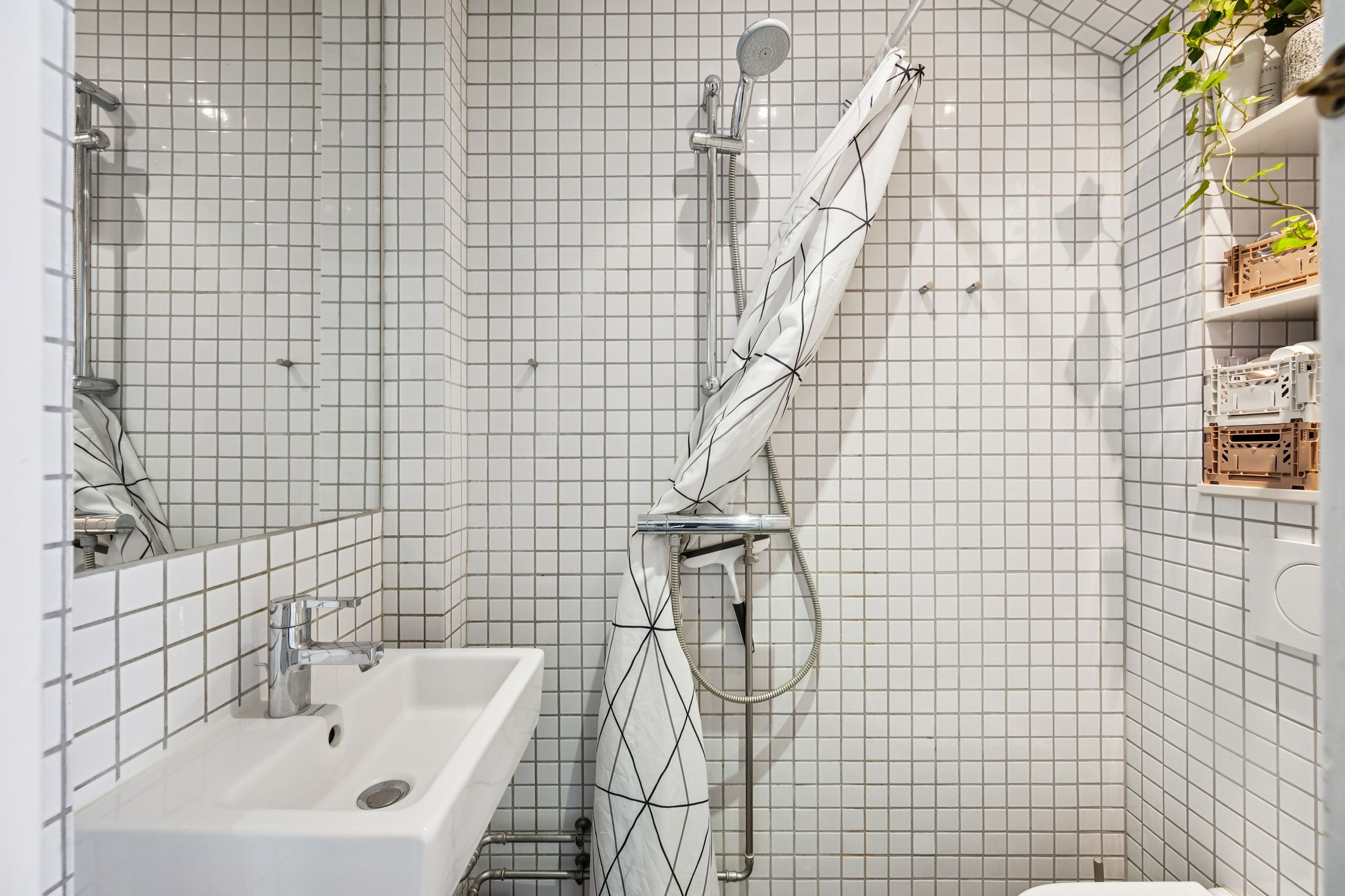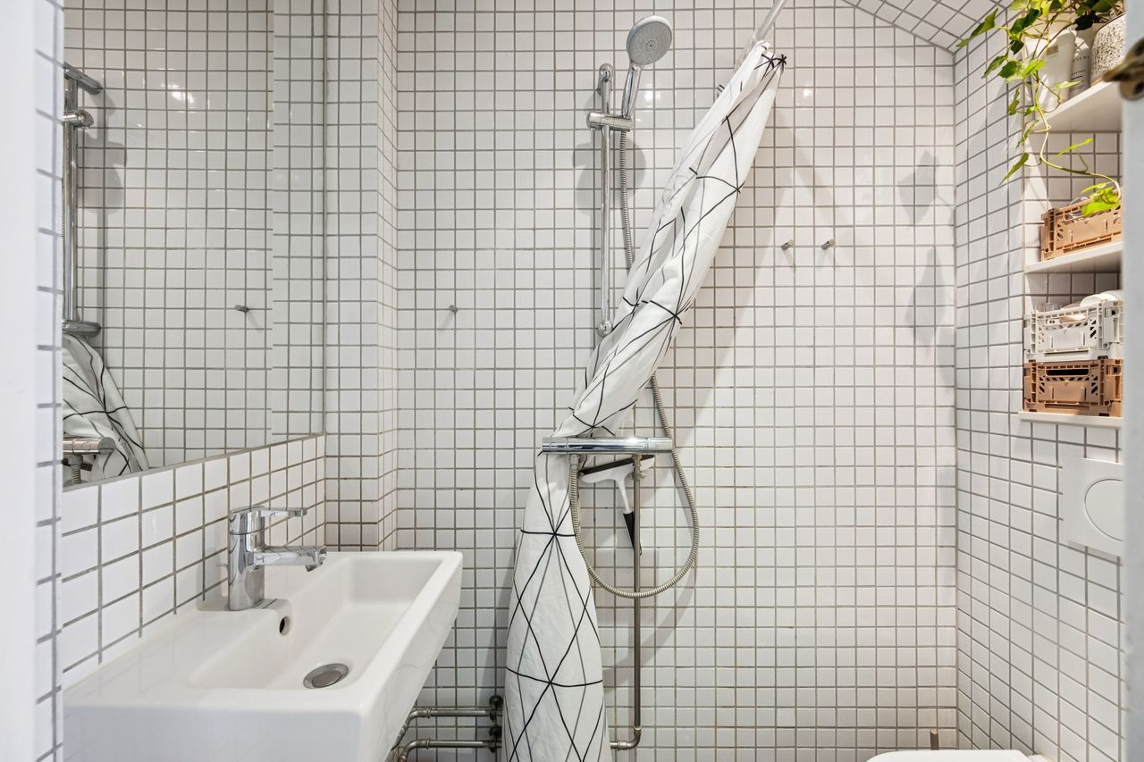 Badeværelset er funktionelt indrettet med bruseniche, toilet og små klinkefliser, der gør det let at holde rent og pænt.