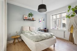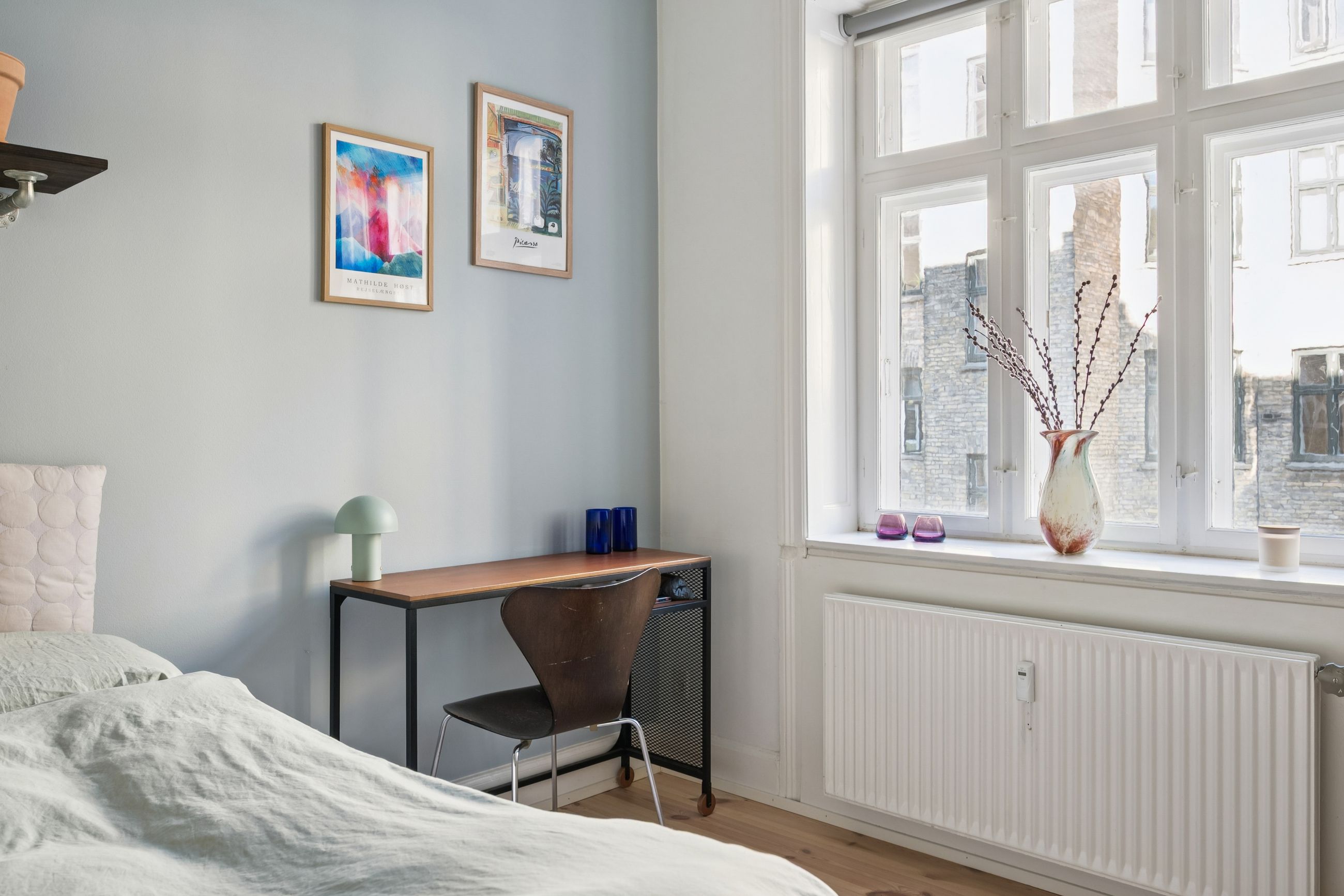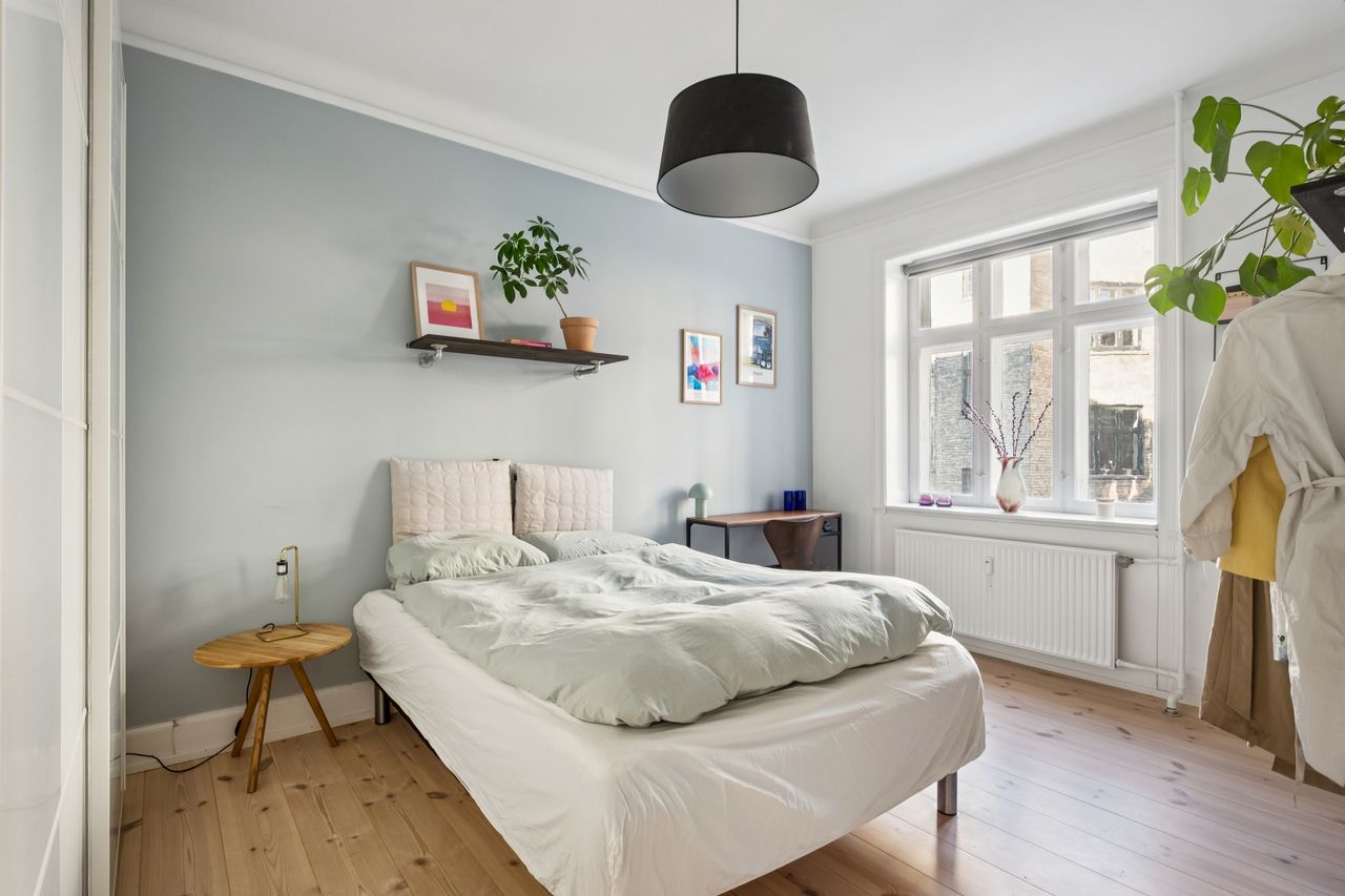 I soveværelset er der er kælet for detaljerne, og det skaber rammen for et skønt rum. Samspillet mellem lyse og mørke trænuancer, de hvide vægge og en afdæmpet pastelblå accentvæg skaber et roligt og stilfuldt udtryk. Med placeringen ind mod gården får du her et fredfyldt rum, ideelt til at trække sig tilbage og nyde roen.