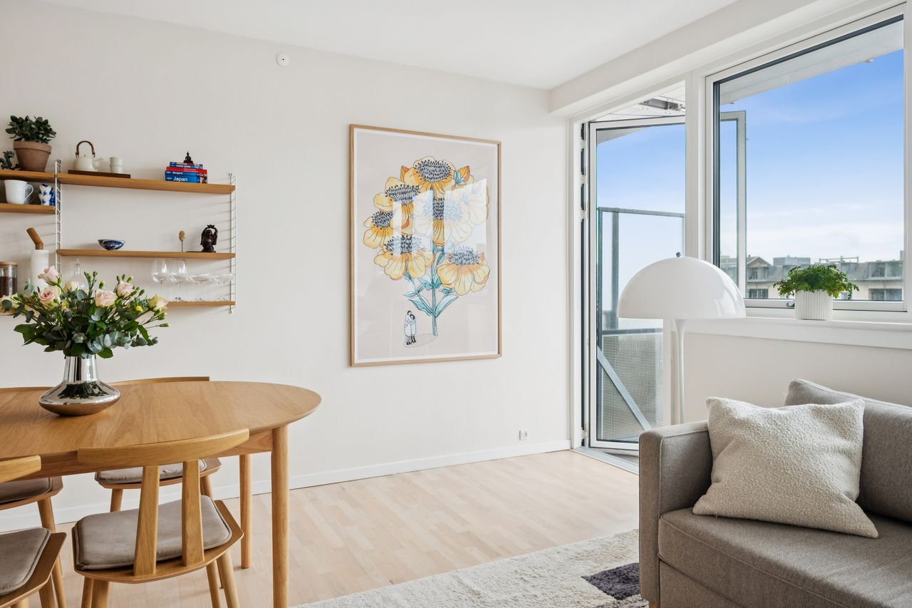 Fra rummet er der direkte udgang til lejlighedens store, østvendte altan, hvor morgensolen kan nydes sammen med en kop kaffe.