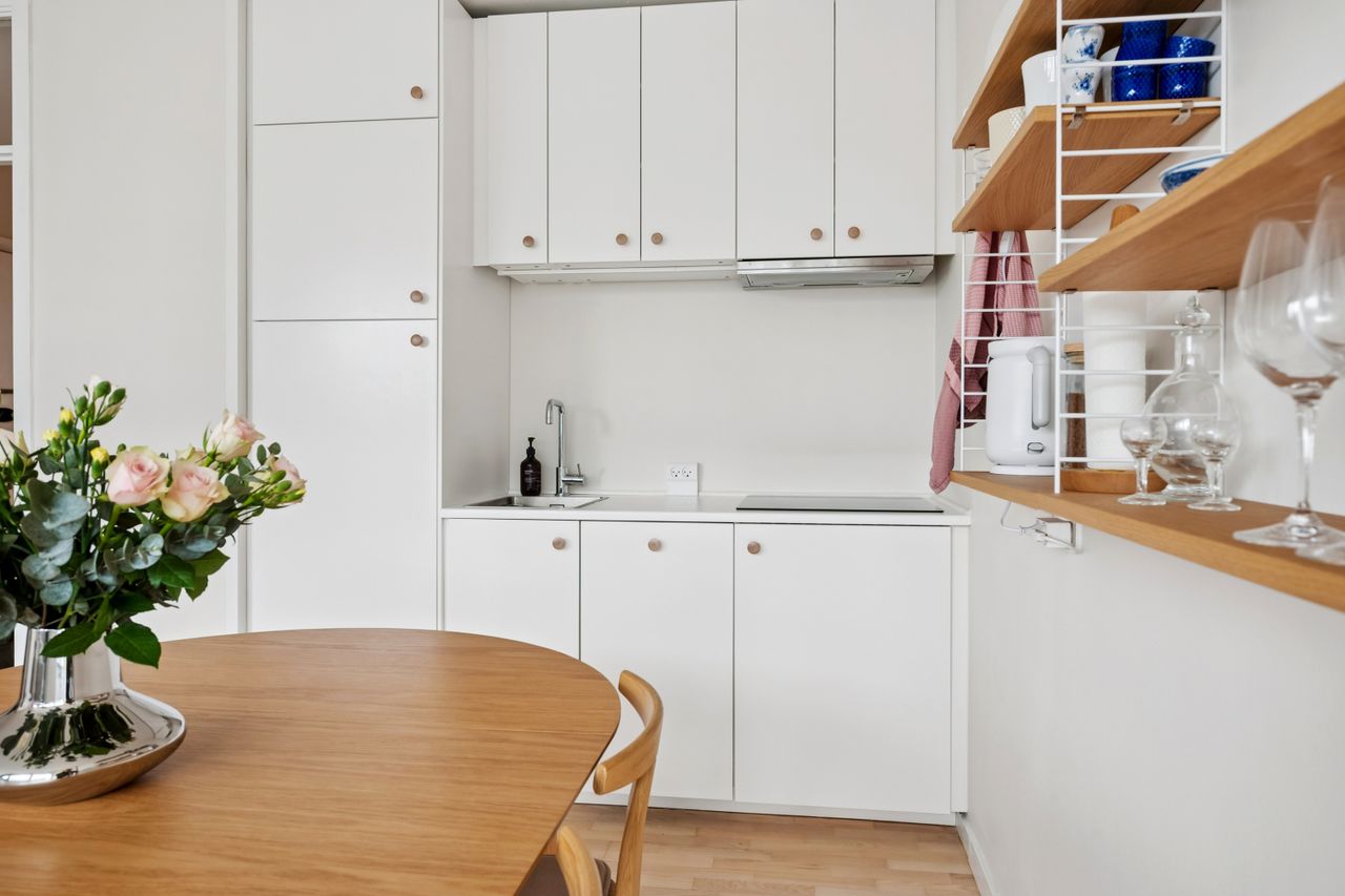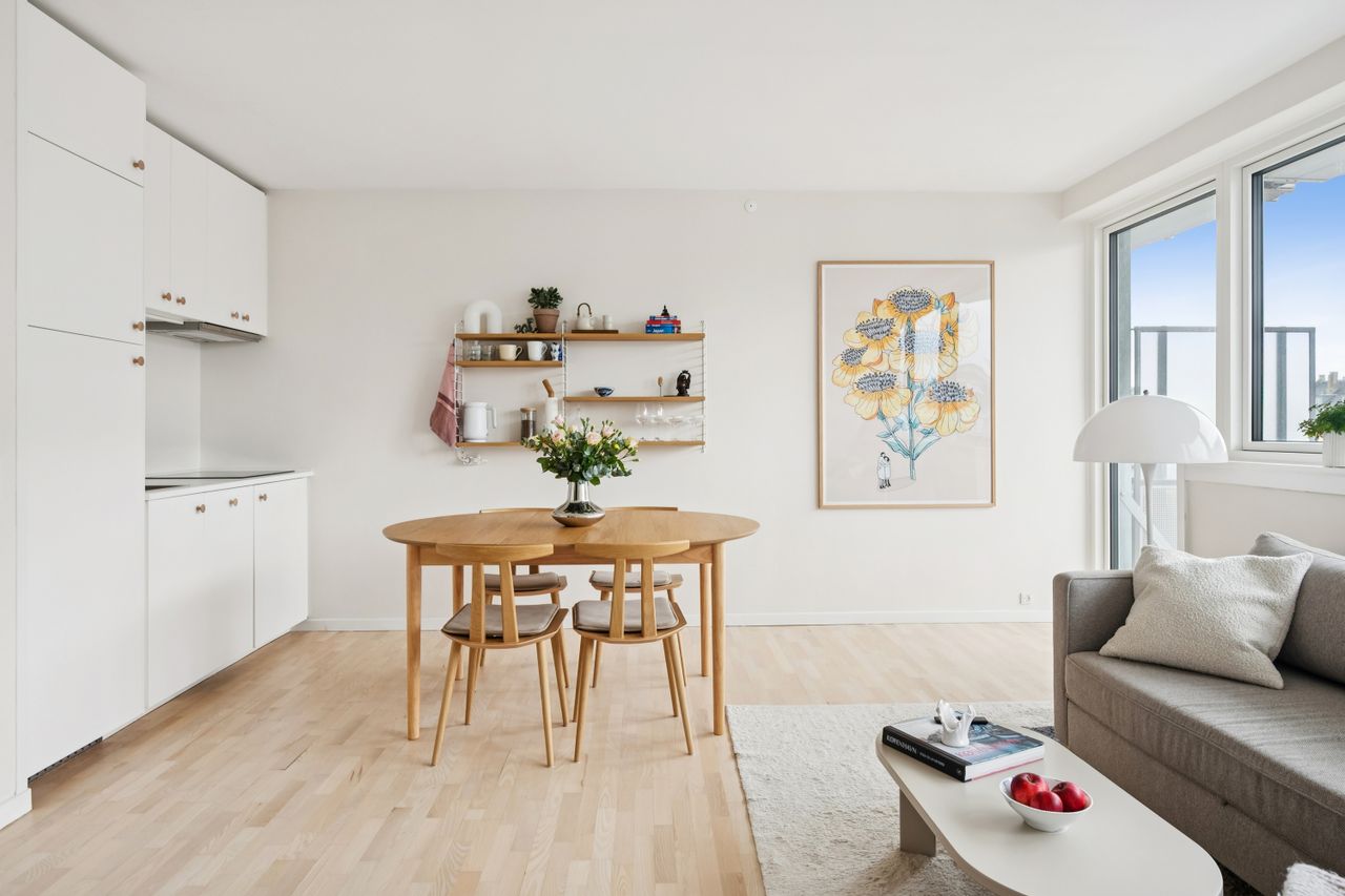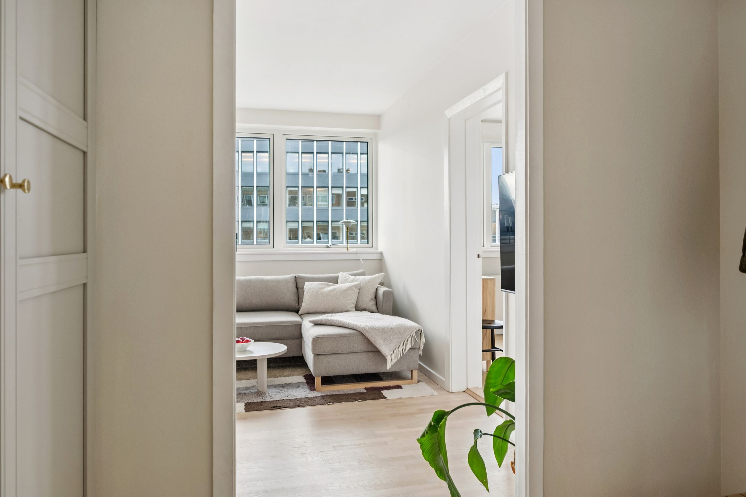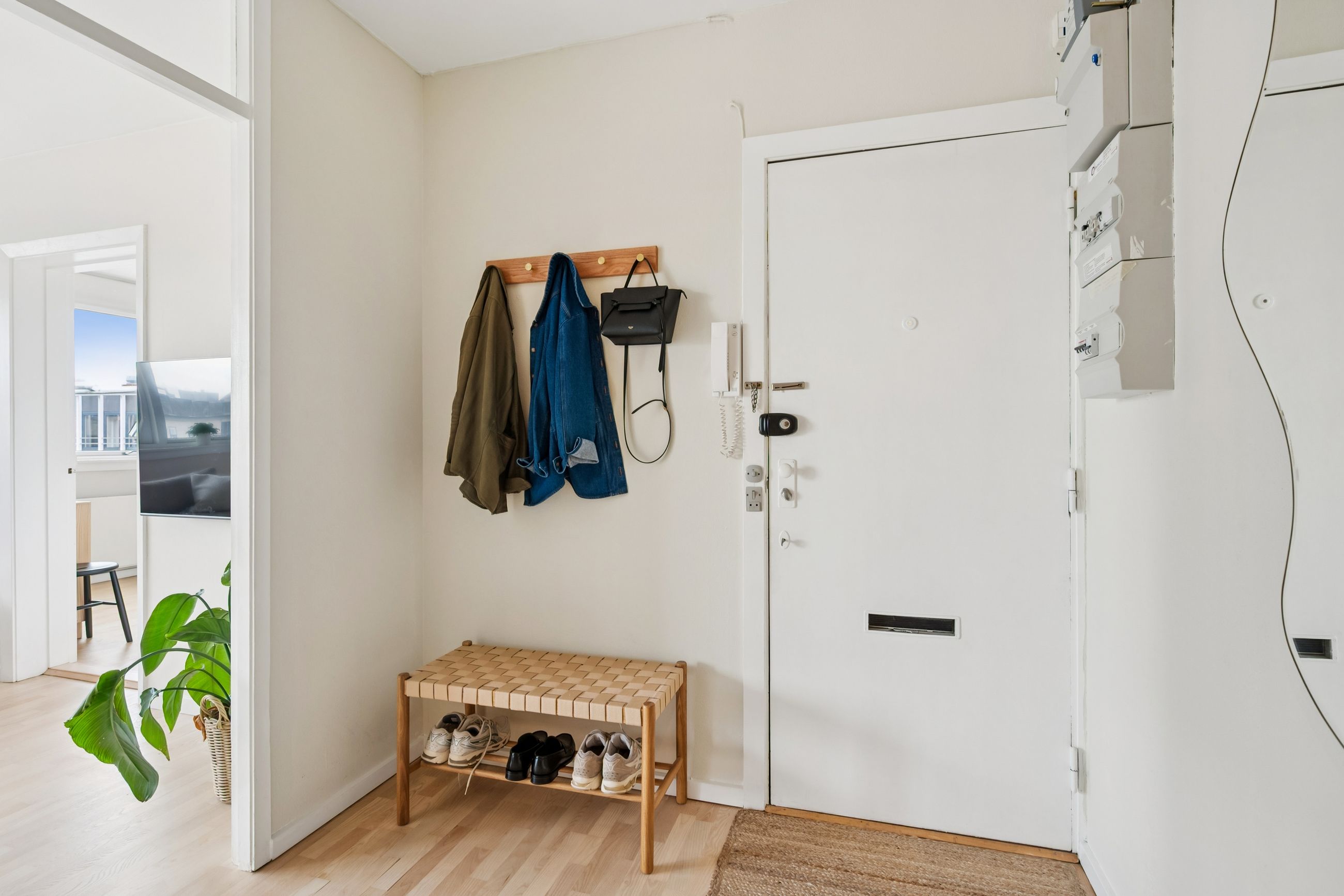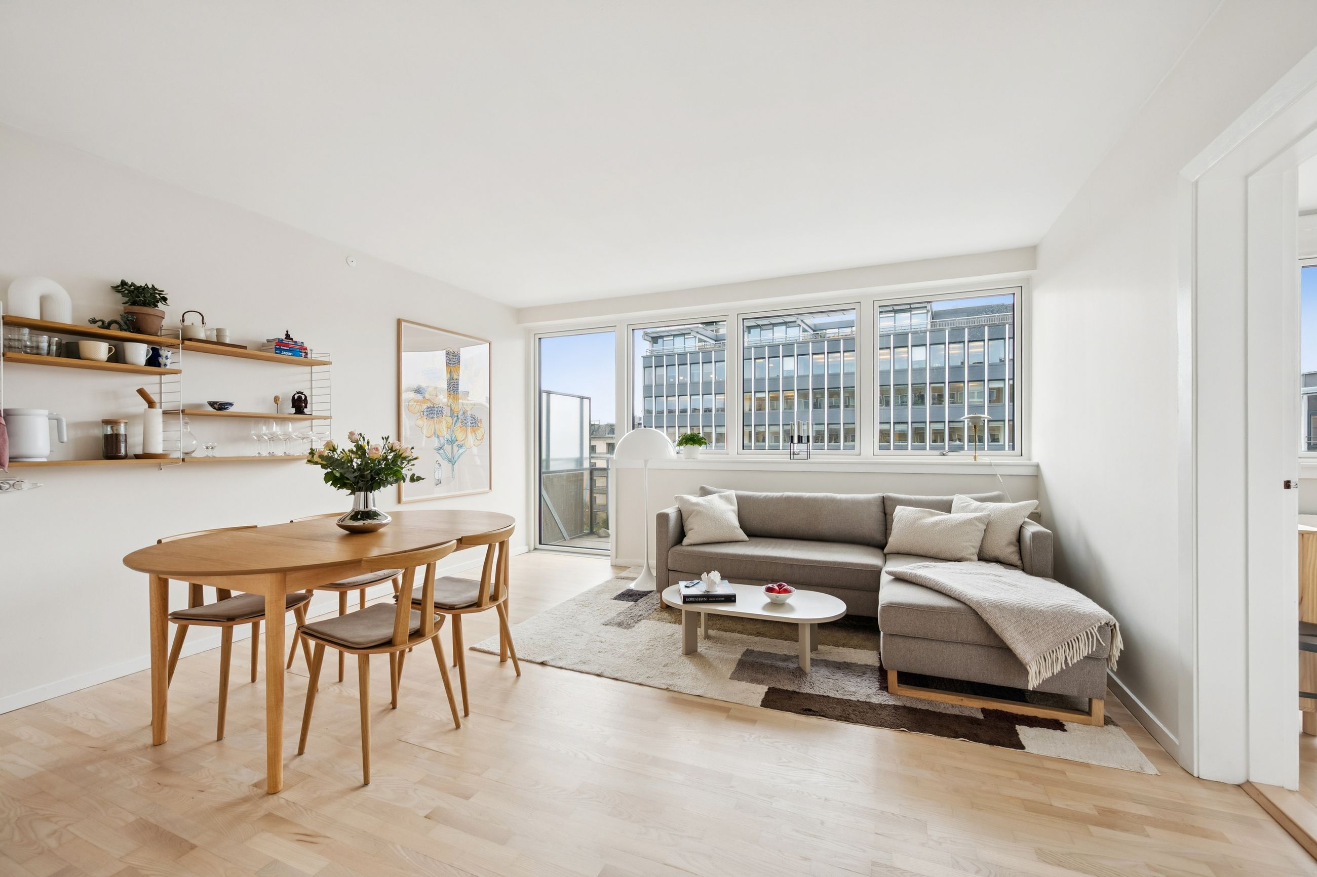 Velkommen indenfor i den skønne lejlighed på Nørre Søgade. Fra entréen træder vi ind i det lyse køkken-alrum, hvor de store vinduespartier og lyse farver skaber et naturligt og indbydende lys, der får rummet til at fremstå åbent og rummeligt. De lyse gulve går igen i hele lejligheden og understreger den lyse og moderne stil.