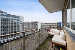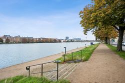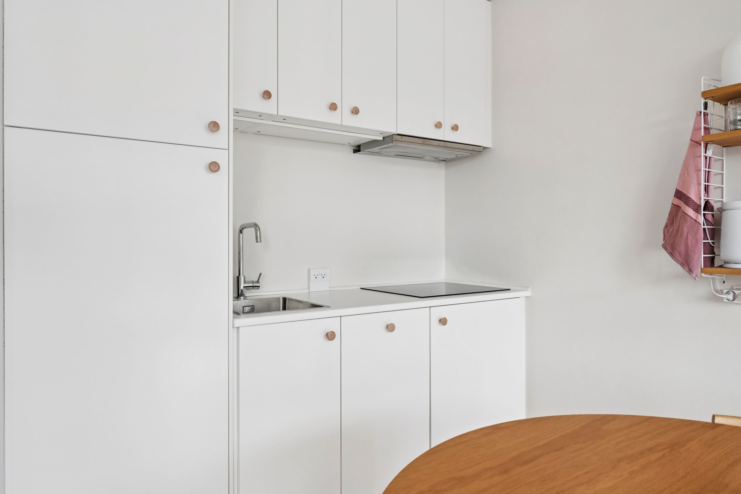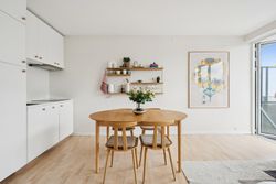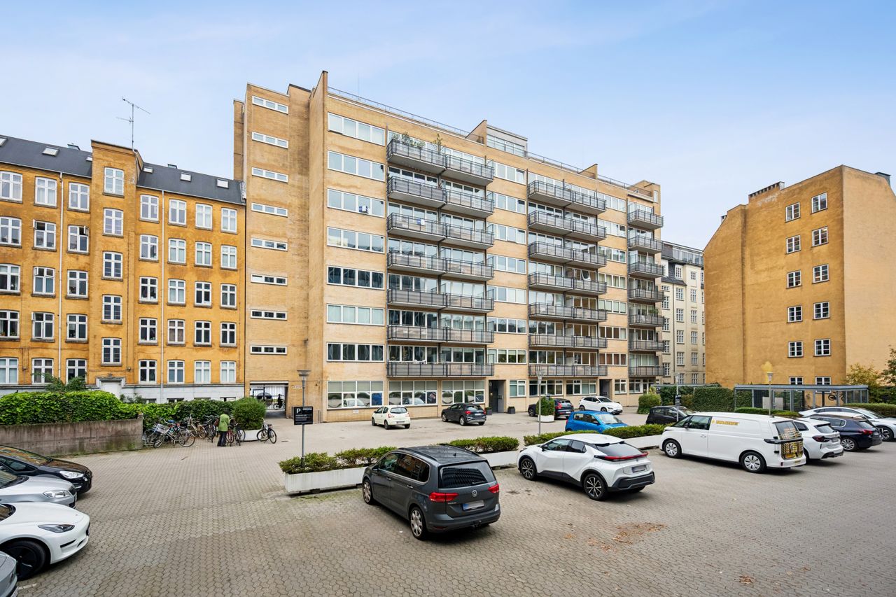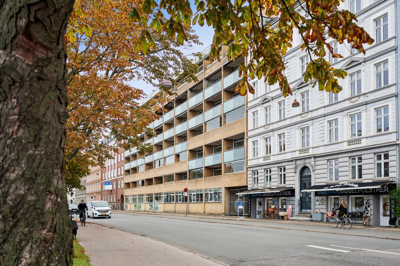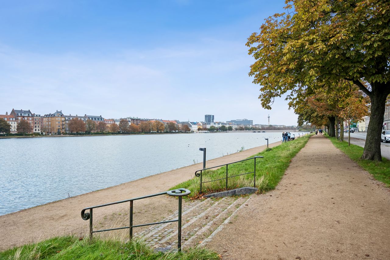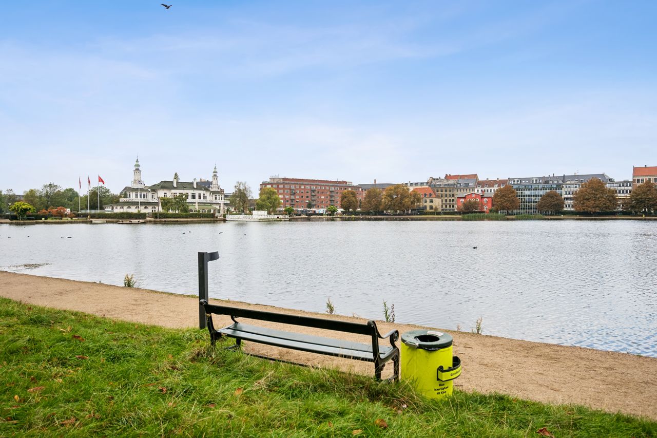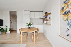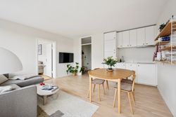 Velkommen indenfor i den skønne lejlighed på Nørre Søgade. Fra entréen træder vi ind i det lyse køkken-alrum, hvor de store vinduespartier og lyse farver skaber et naturligt og indbydende lys, der får rummet til at fremstå åbent og rummeligt. De lyse gulve går igen i hele lejligheden og understreger den lyse og moderne stil.