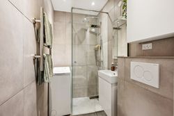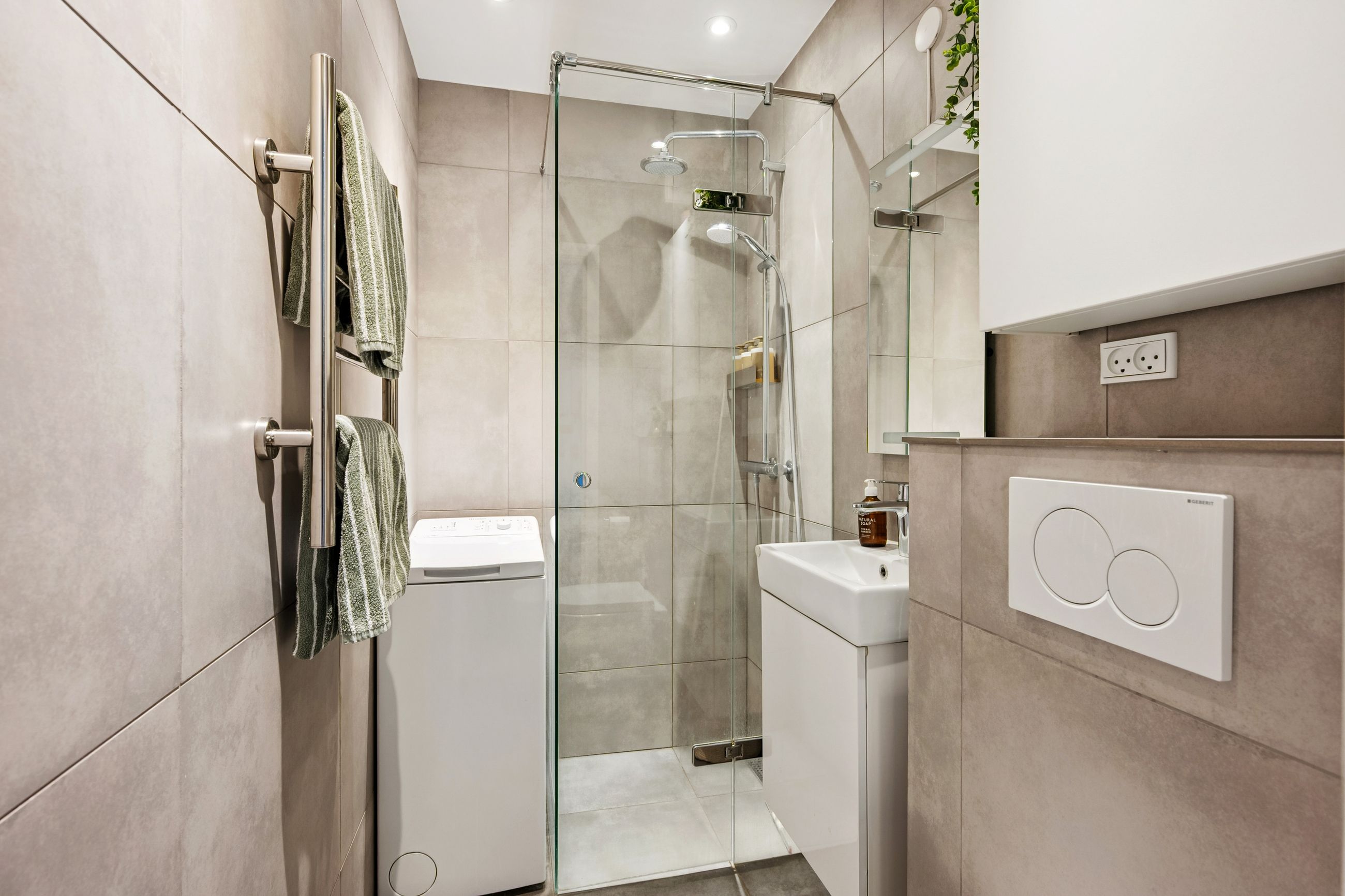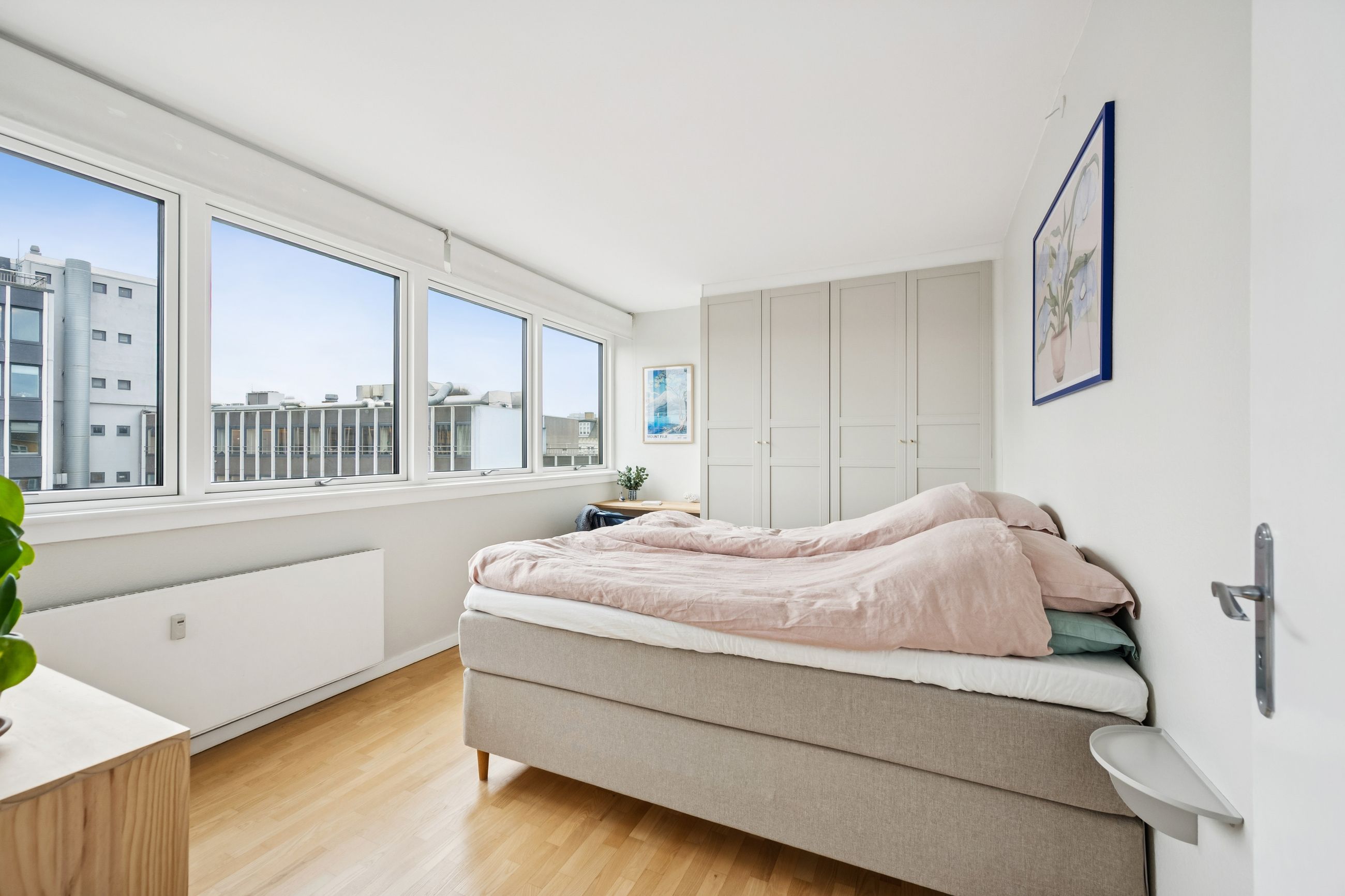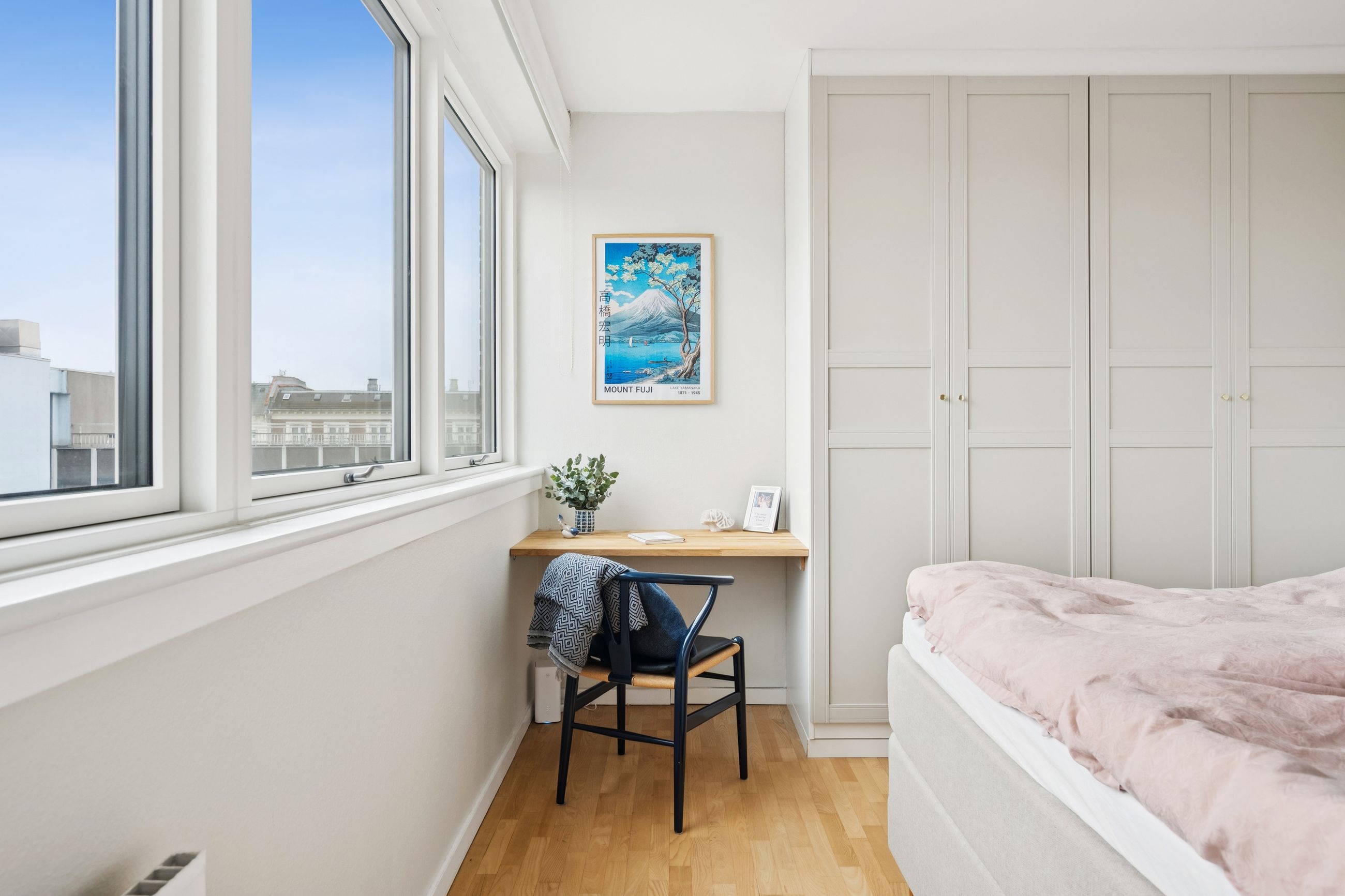 Soveværelset er stilrent indrettet med god plads til opbevaring, og de store vinduespartier giver mulighed for at vågne op til en smuk udsigt. Badeværelset er af nyere dato og fremstår moderne med separat bruseafsnit og toilet, hvilket giver en god rumfornemmelse. Der er desuden plads til vaskemaskine – en praktisk detalje i hverdagen.