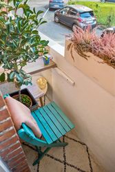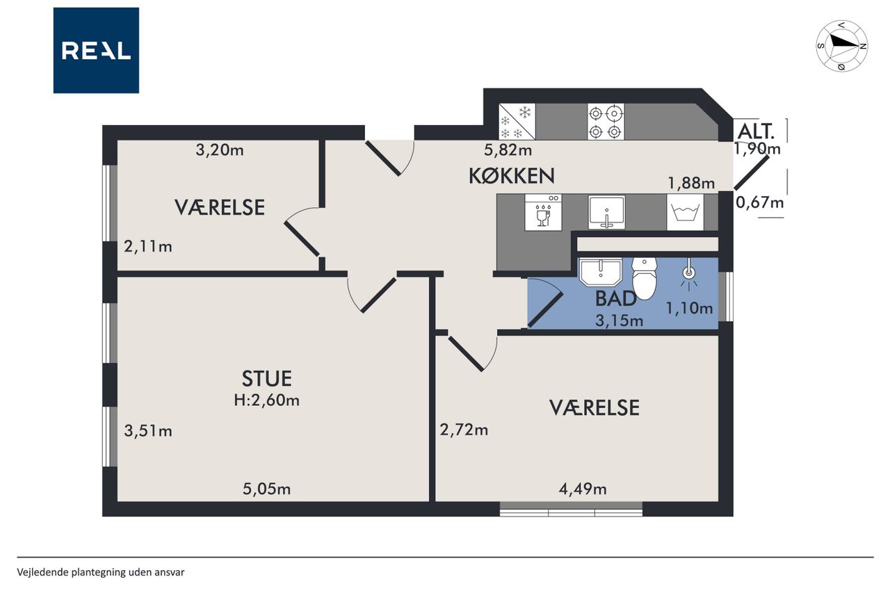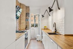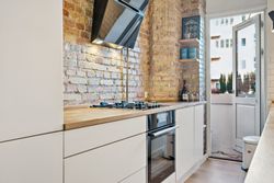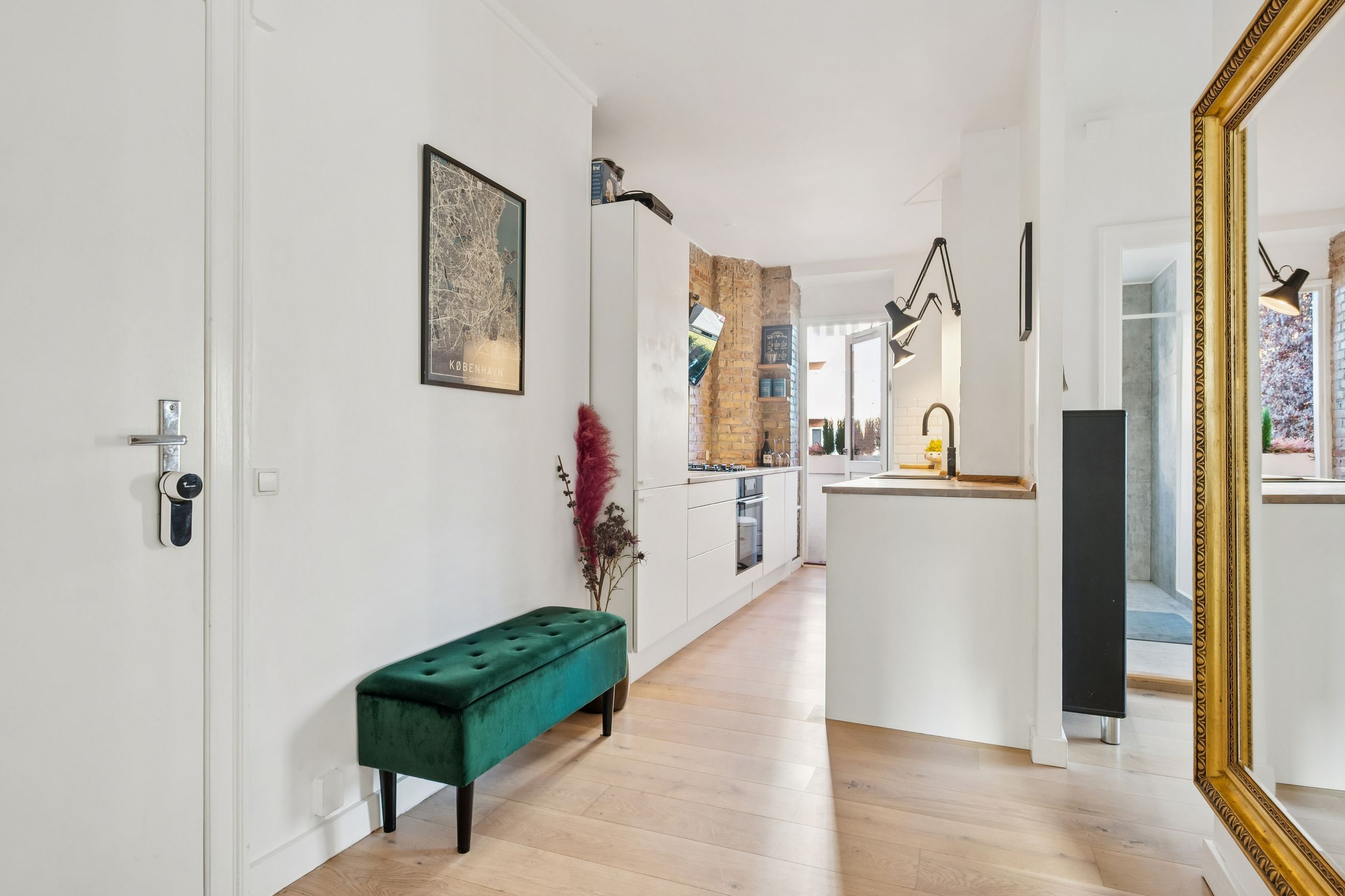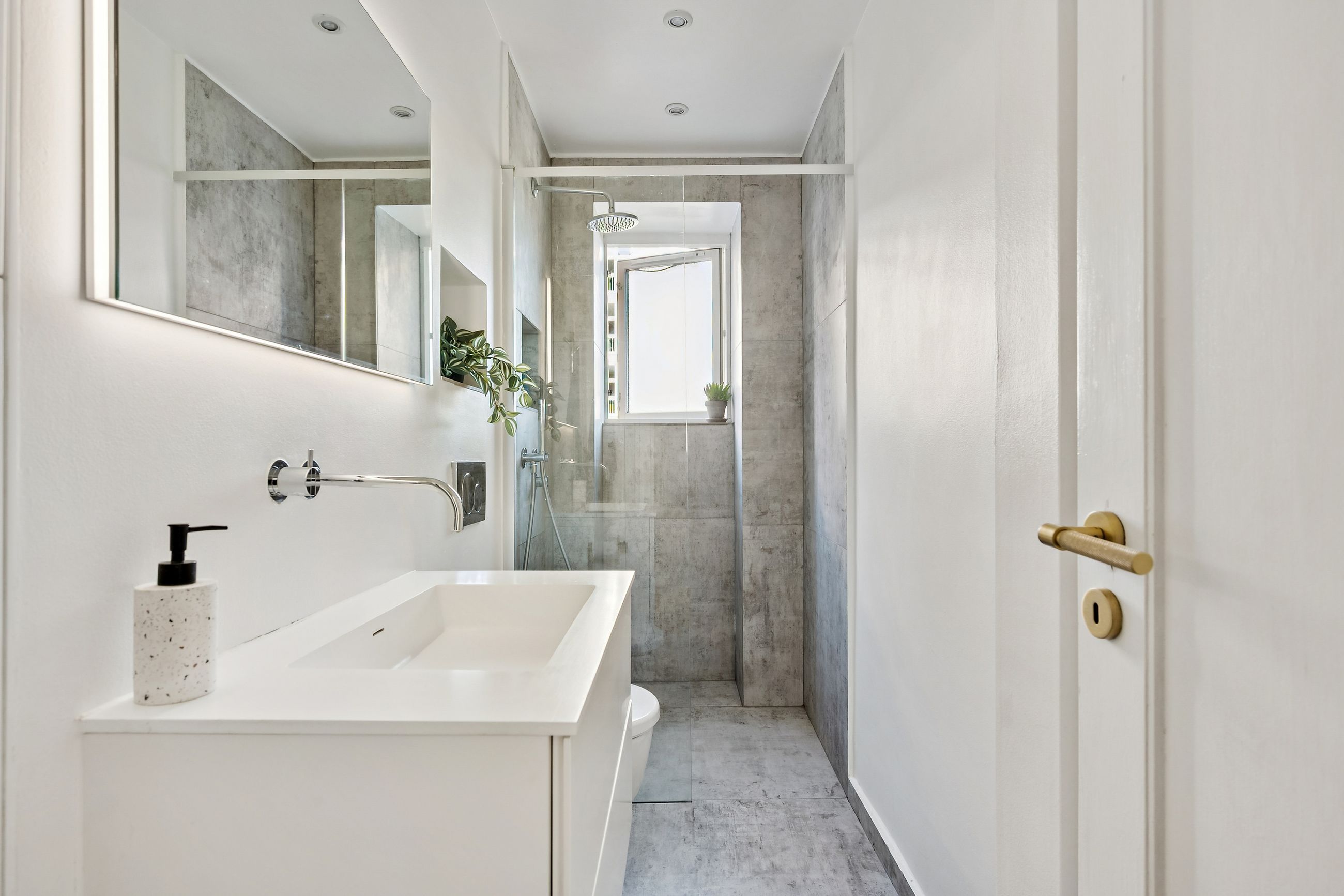 Det unikke køkken giver dig lyst til at tilbringe tid på måltider og samtaler over gryderne. Her mødes æstetisk, tidsløst design og rustik charme i en perfekt balance med de smukke, blotlagte murstensvægge og det hvide, stilrene inventar. Herfra er der udgang til lejlighedens hyggelige altan, hvor du kan nyde morgenkaffen eller en stille stund med en god bog. Badeværelset fremstår lyst, moderne og velholdt med flotte fliser og hvidt inventar, der skaber et elegant og indbydende udtryk.