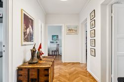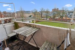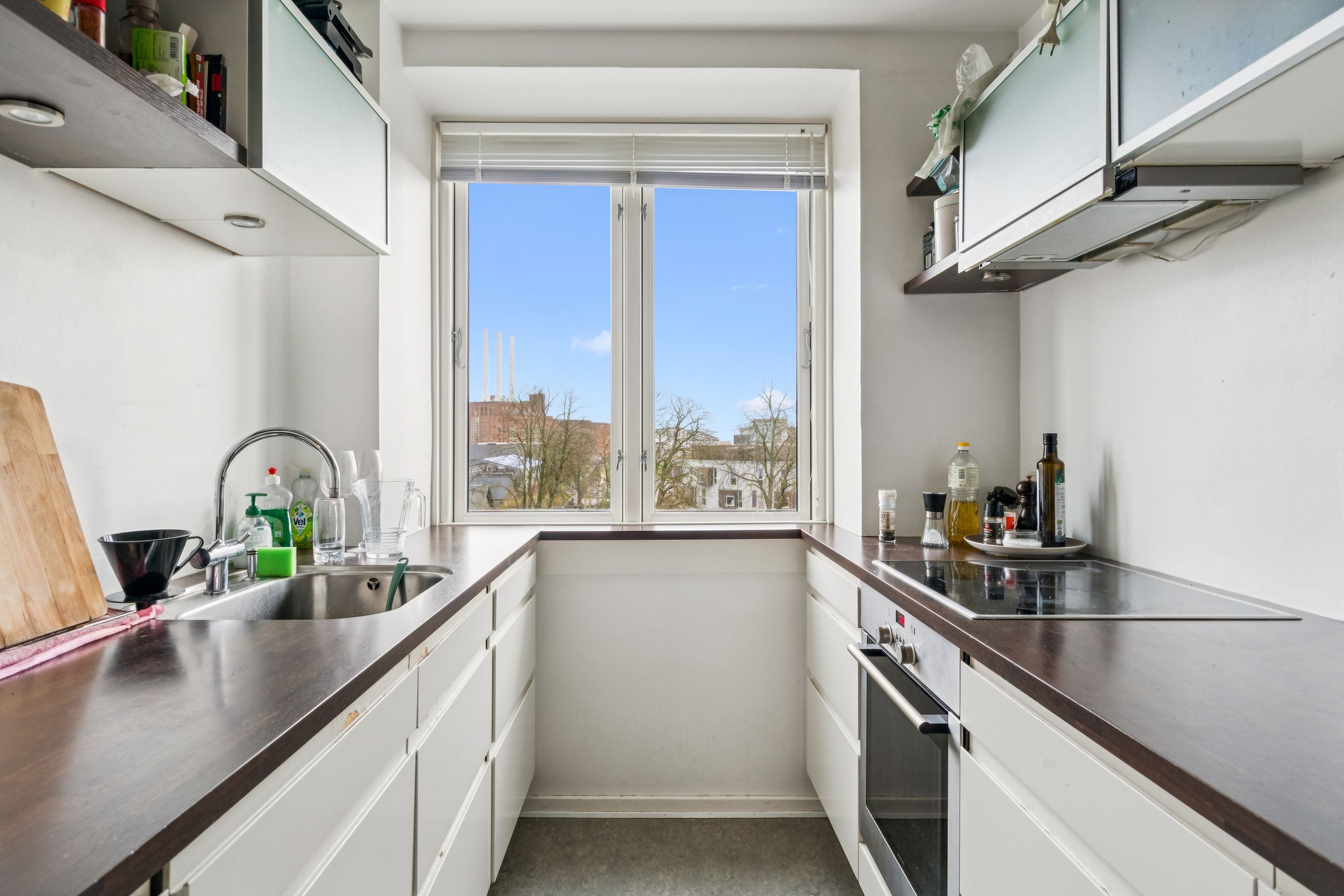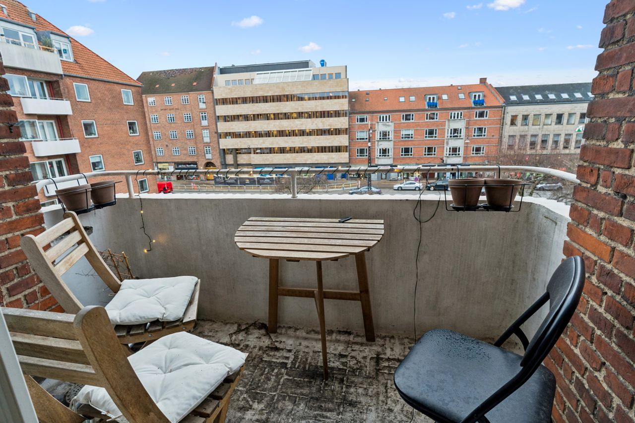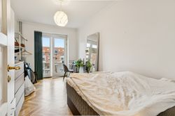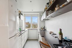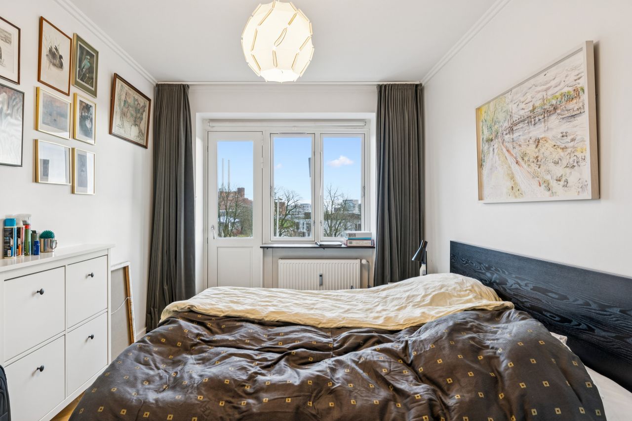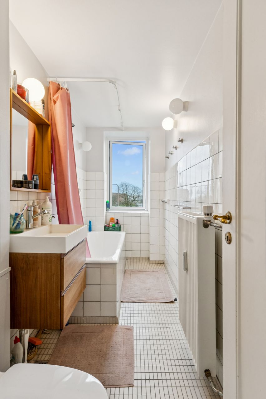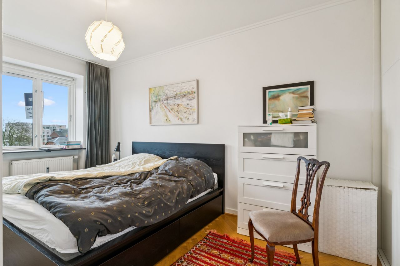 Fra stuen er der adgang til det ene af boligens to soveværelser – et roligt og velproportioneret rum med gode opbevaringsmuligheder. Køkkenet fremstår i pæn stand og gør tilberedningen af hverdagens måltider både nem og overskuelig. Badeværelset er ligeledes holdt i flot stand og prydes af originale fliser og detaljer, som giver rummet et tidløst og charmerende udtryk.