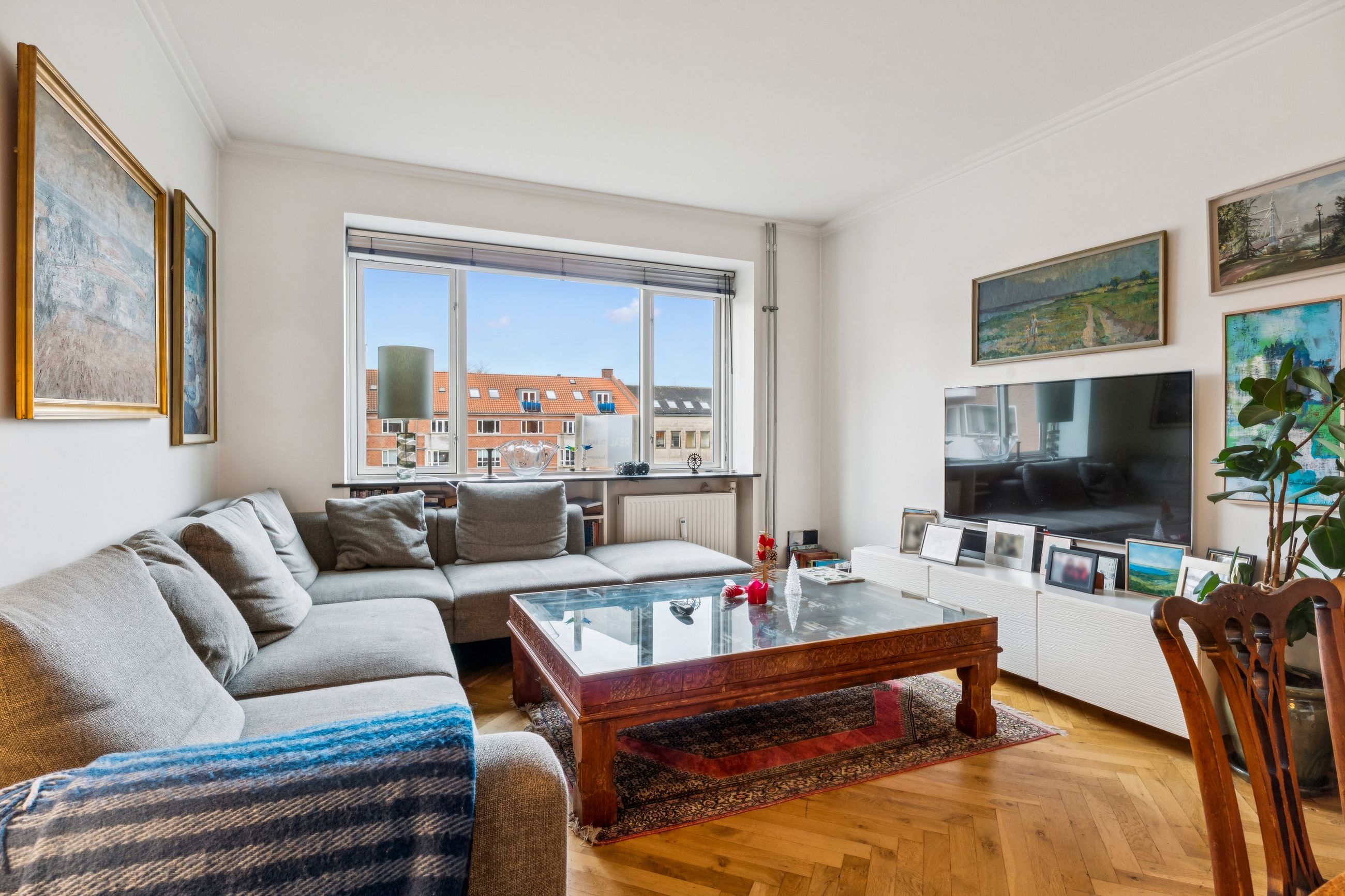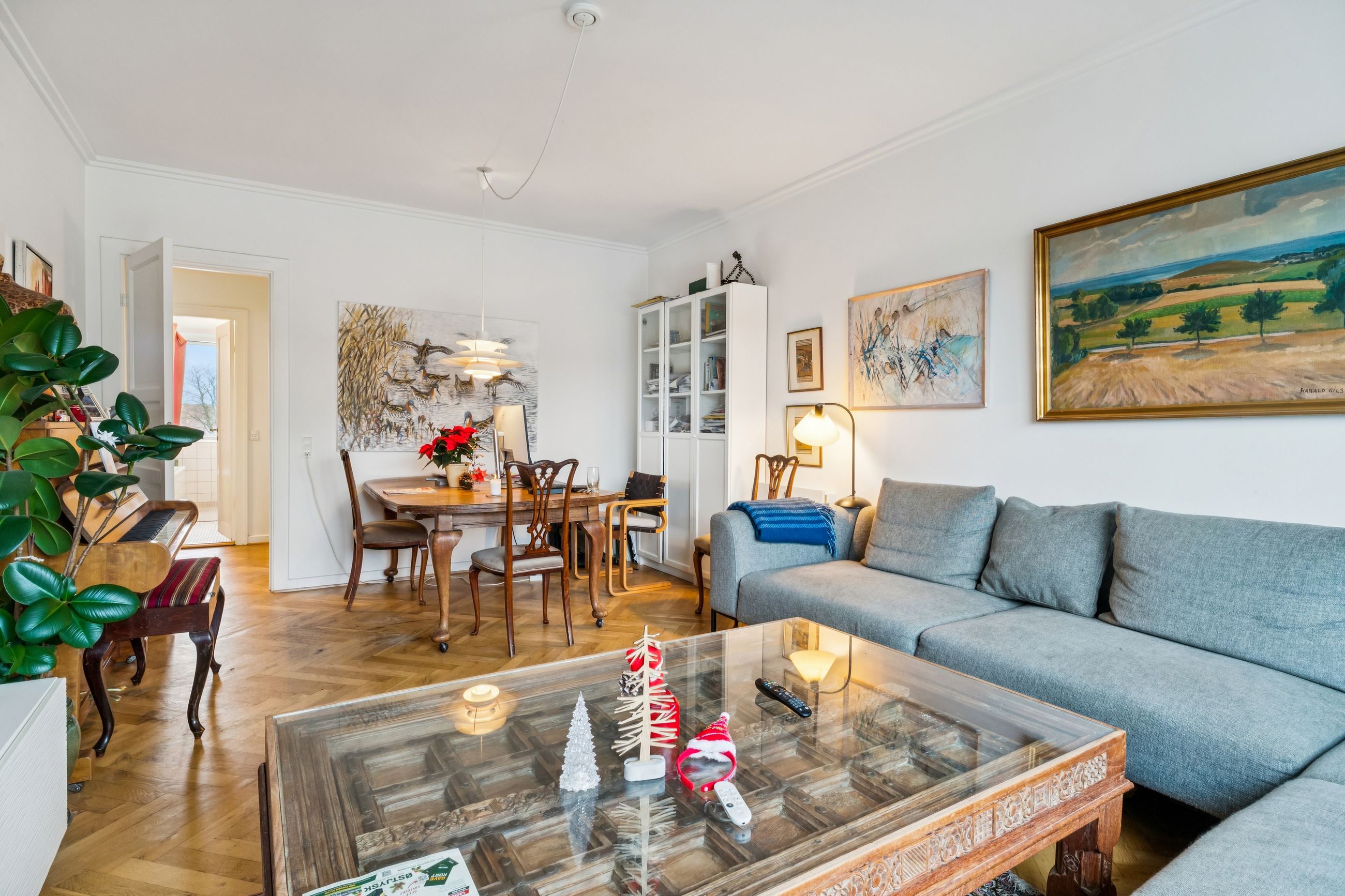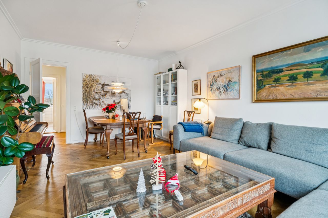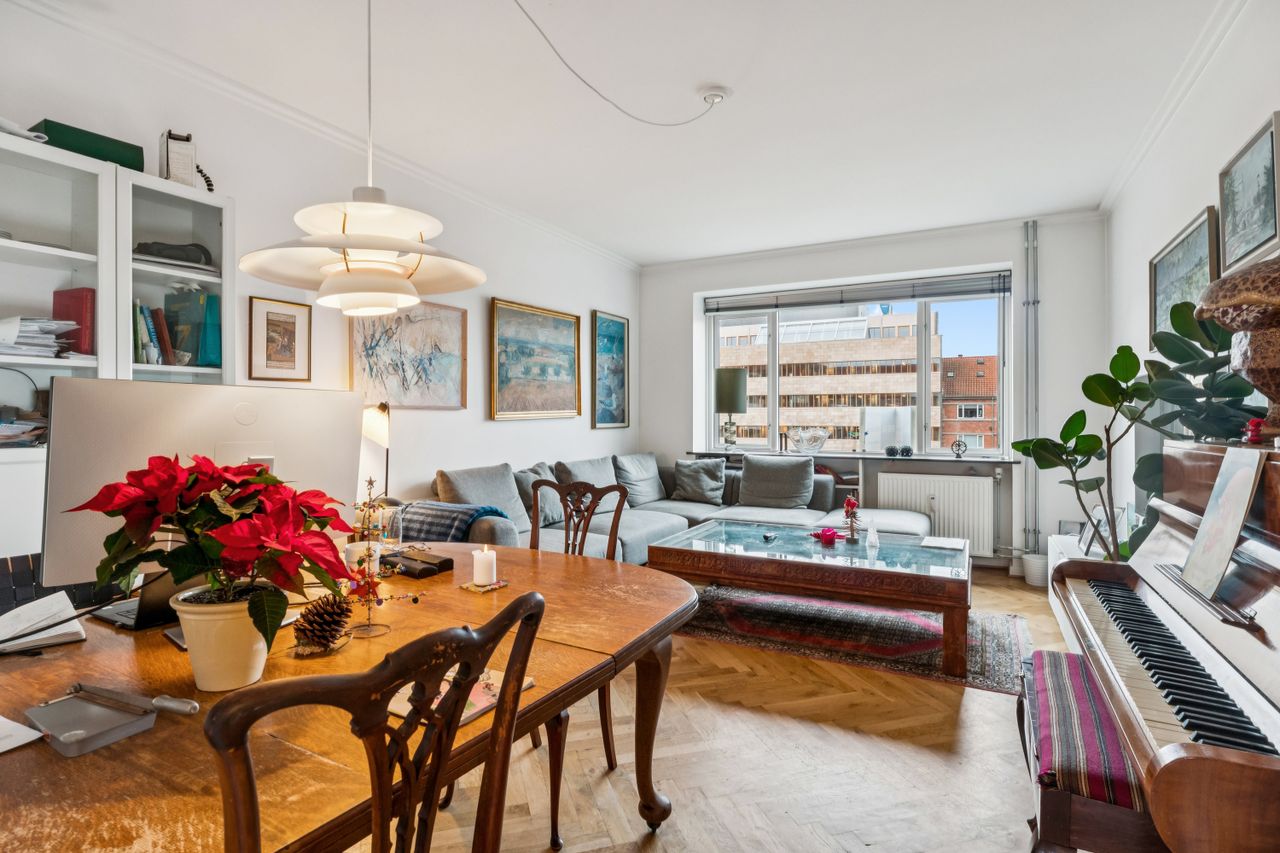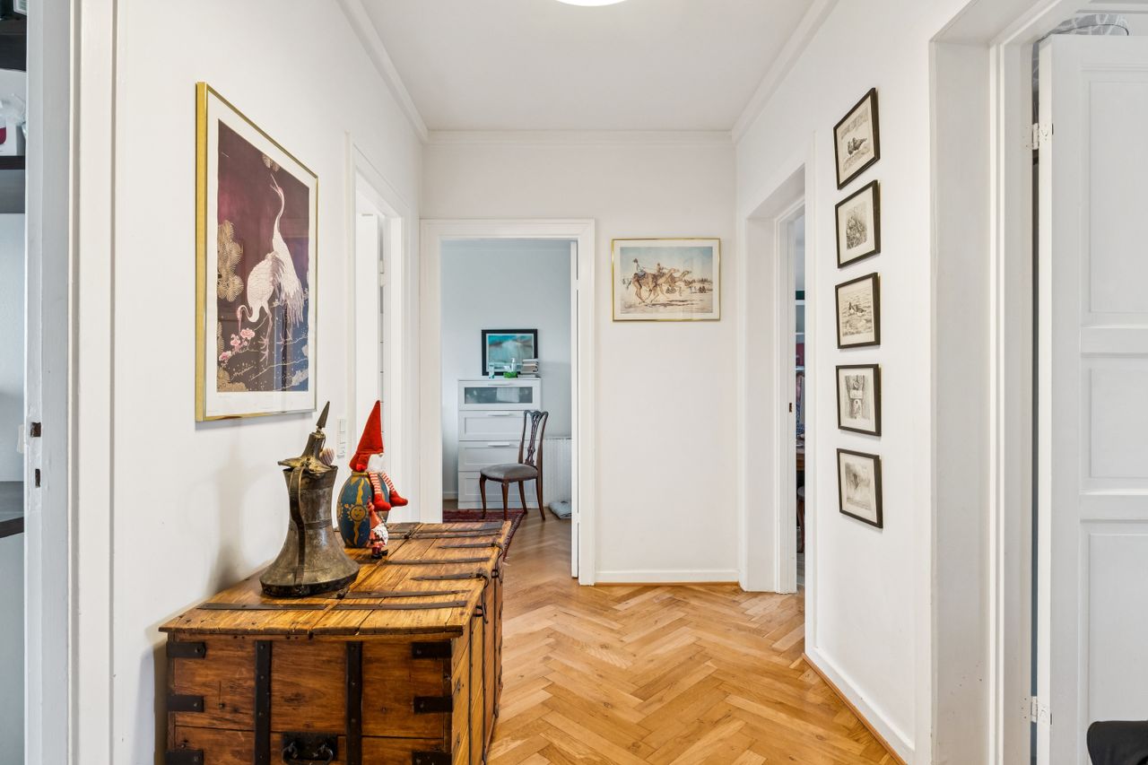 Fra entréen åbner boligen sig op i en veludnyttet planløsning. Det naturlige samlingspunkt er den lyse og indbydende stue, hvor der både er plads til afslapning i sofaen og hyggelige middage ved spisebordet. De store vinduespartier lukker generøst dagslyset ind og skaber en behagelig atmosfære.