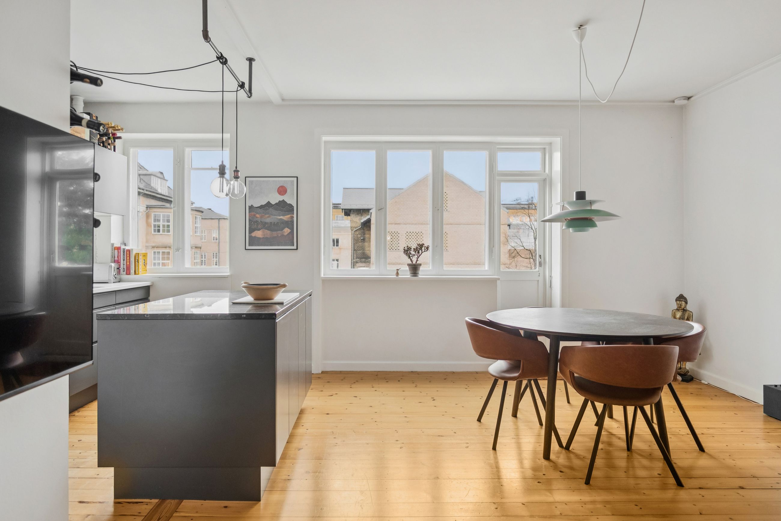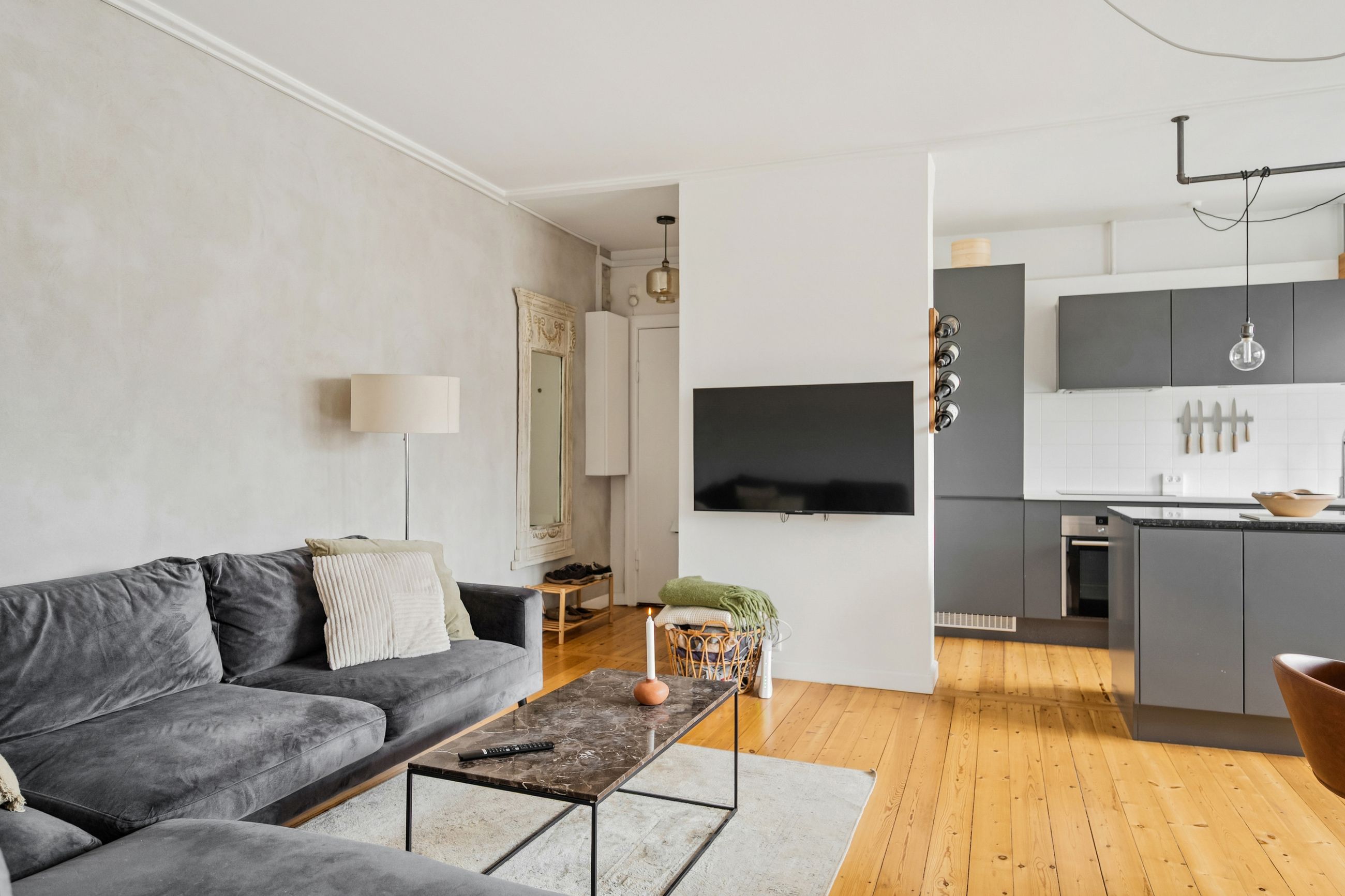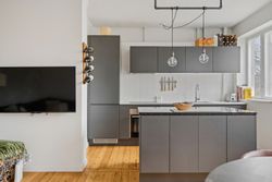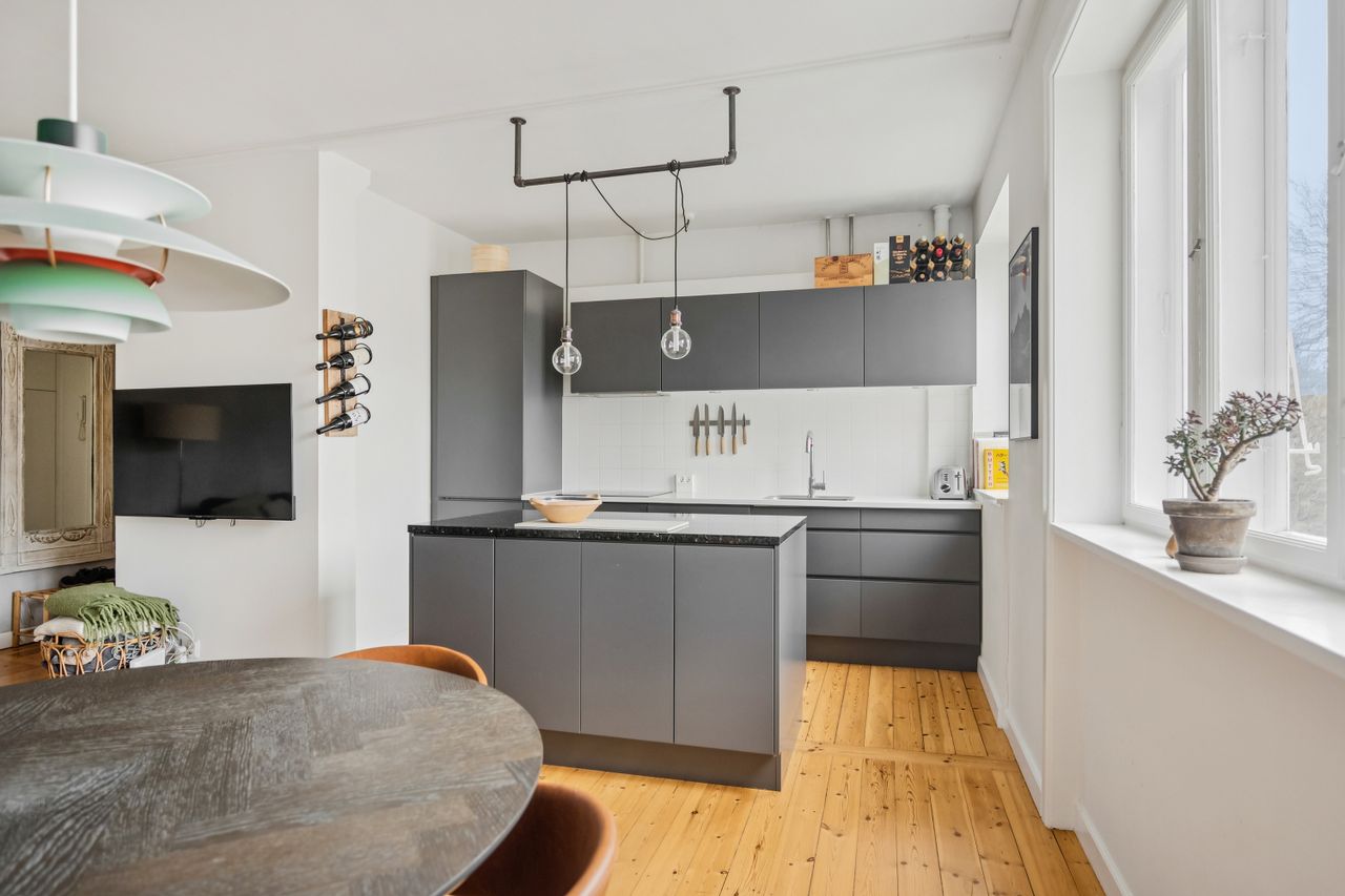 Fra entréen træder vi direkte ind i boligens hjerte – det åbne køkken-alrum og stue, hvor nærvær og fællesskab er i fokus. Det store, åbne køkken med tilhørende køkkenø inviterer til samtaler hen over gryderne og skaber de perfekte rammer for både hverdagsliv og gæster. Stuen fremstår lys og rummelig med et skønt lysindfald, der understreger boligens åbne atmosfære.