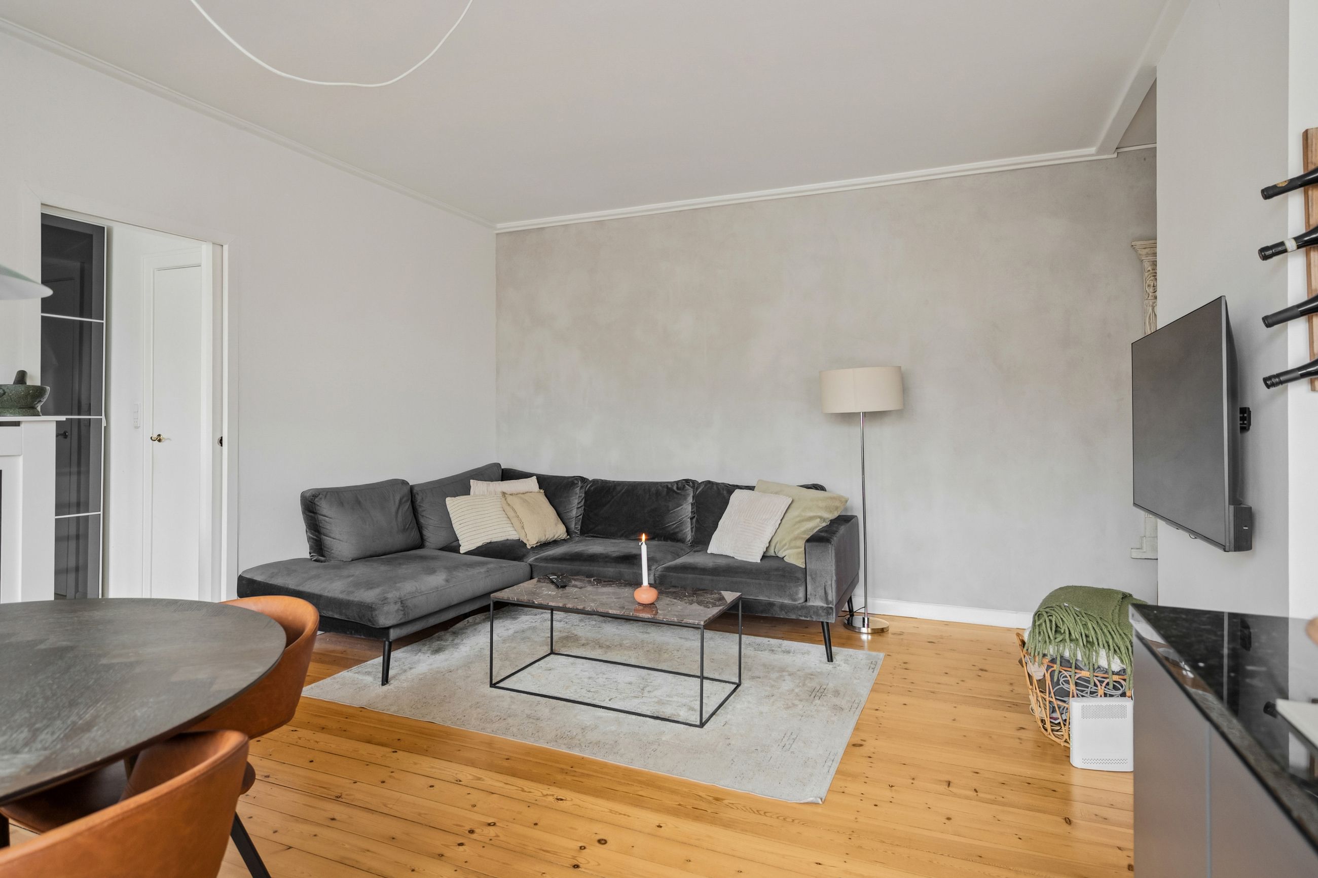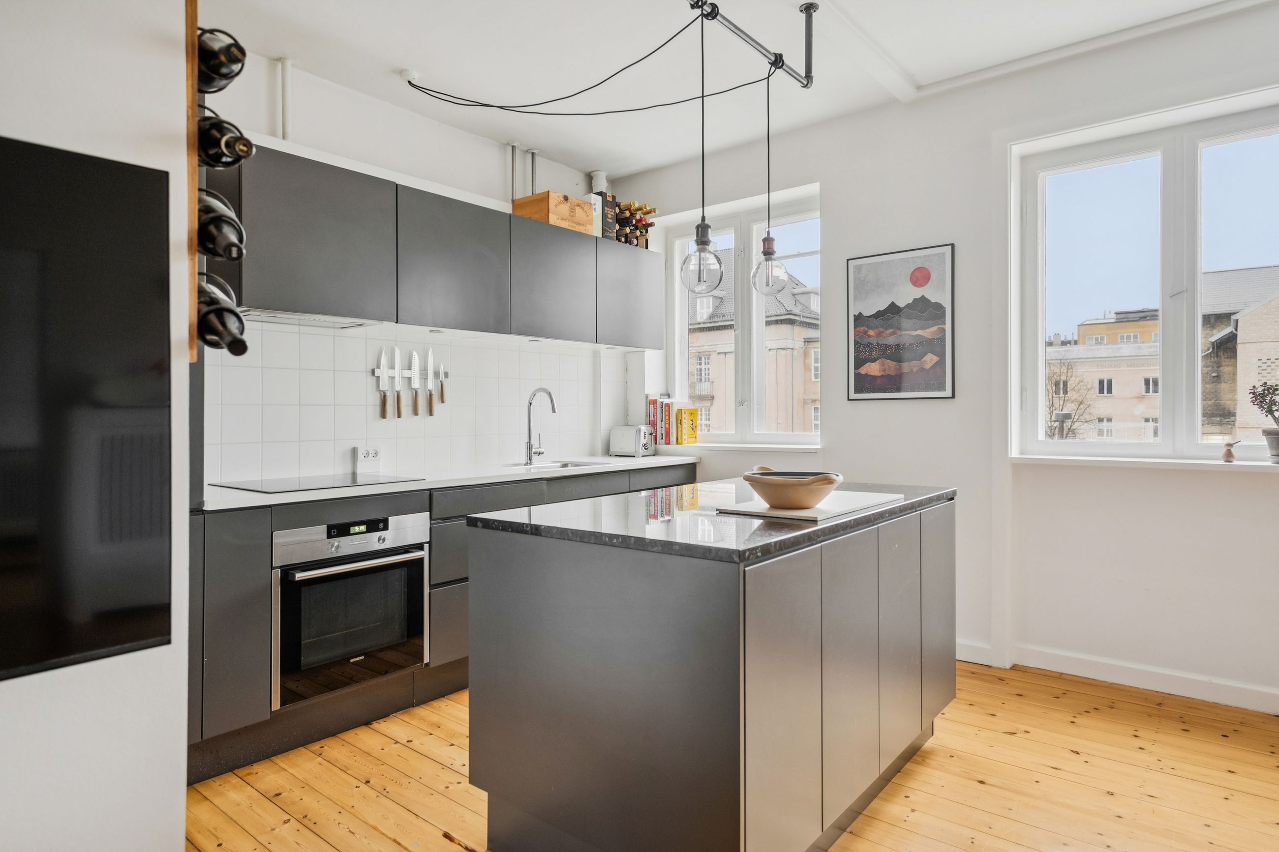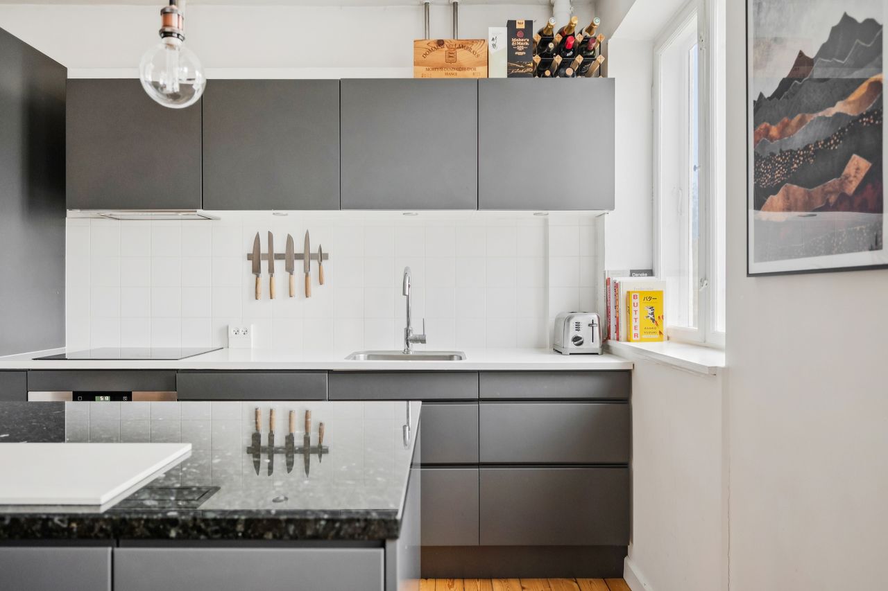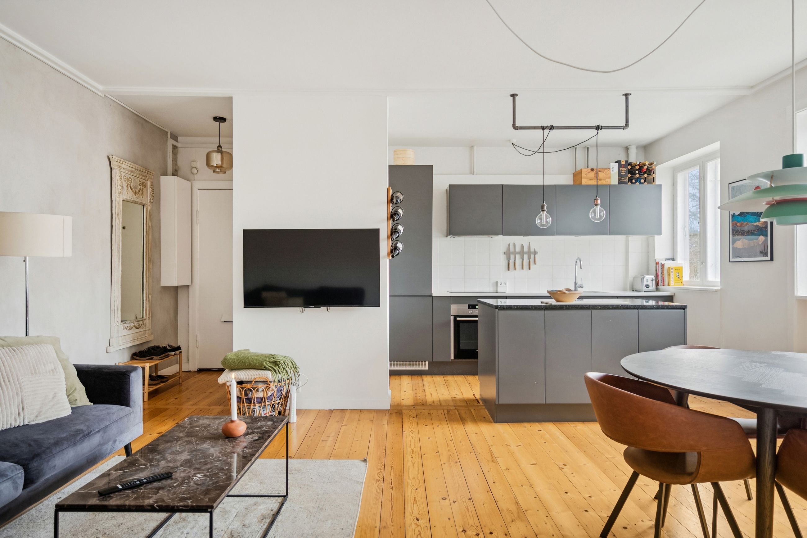 Fra entréen træder vi direkte ind i boligens hjerte – det åbne køkken-alrum og stue, hvor nærvær og fællesskab er i fokus. Det store, åbne køkken med tilhørende køkkenø inviterer til samtaler hen over gryderne og skaber de perfekte rammer for både hverdagsliv og gæster. Stuen fremstår lys og rummelig med et skønt lysindfald, der understreger boligens åbne atmosfære.