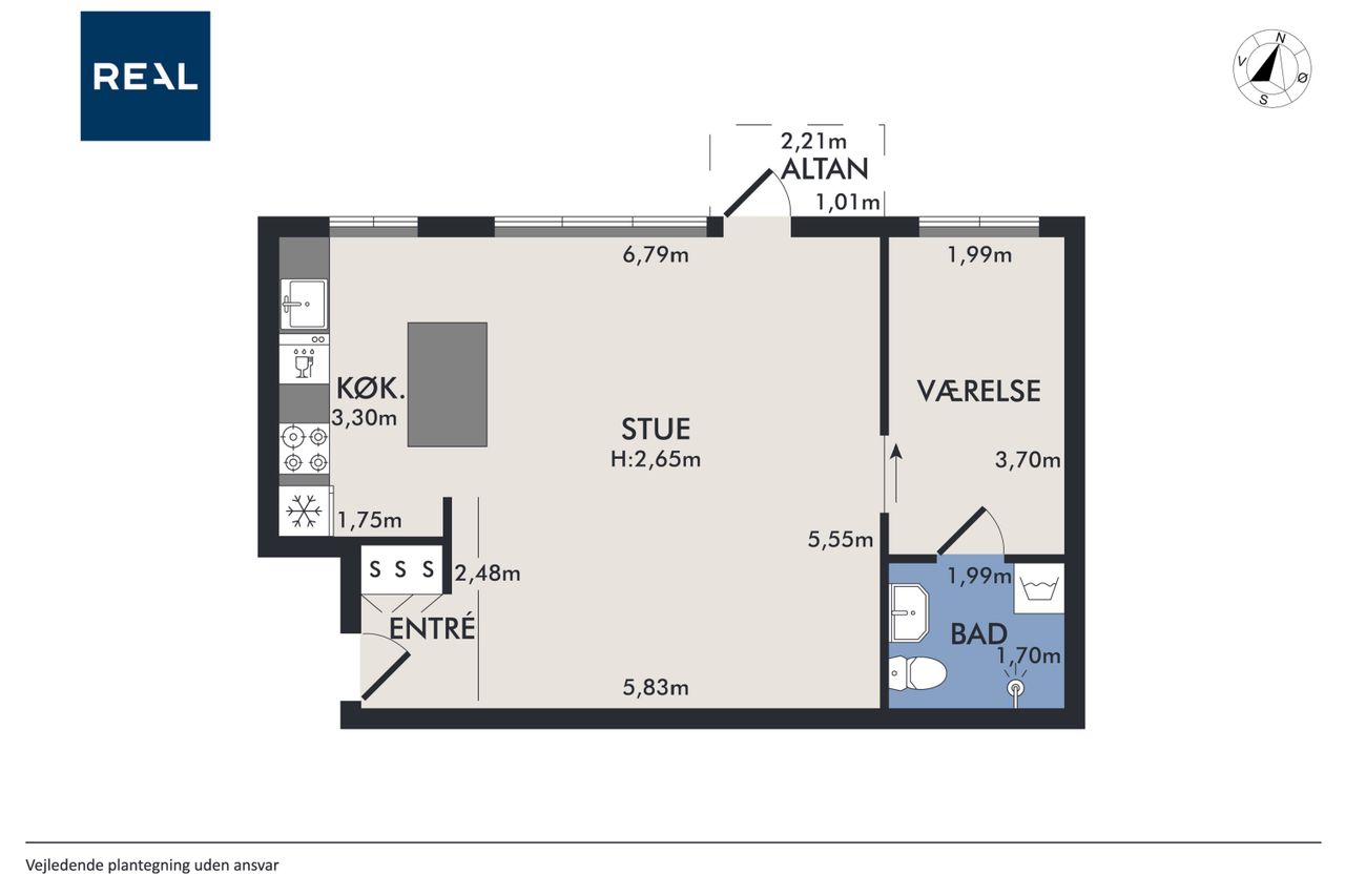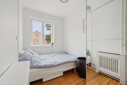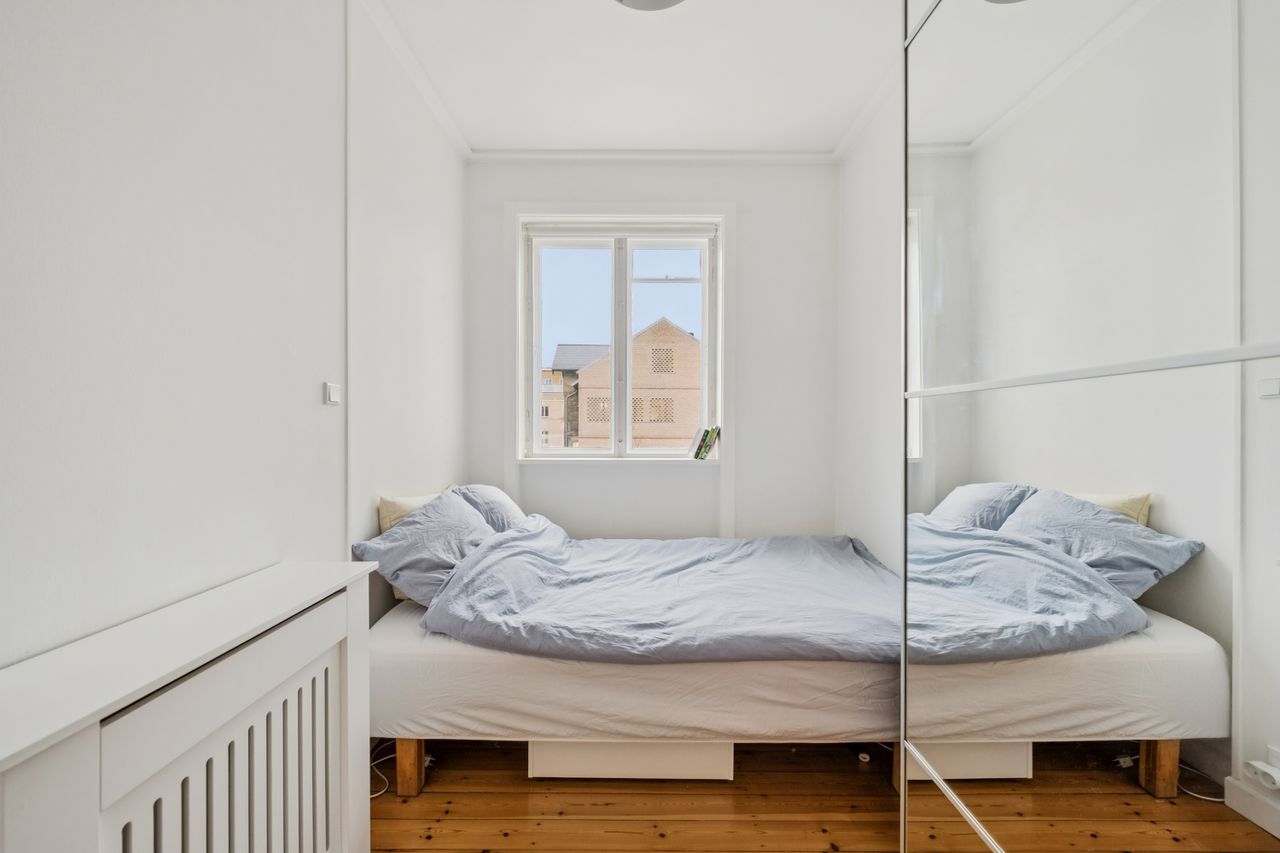 Fra alrummet er der adgang til boligens nordøstvendte altan, hvor lys, luft og liv inviteres indenfor, og hvor udelivet kan nydes fra sin egen private oase. Videre ind i soveværelset, som byder på god plads til både seng og skabsopbevaring samt et behageligt lysindfald.