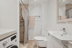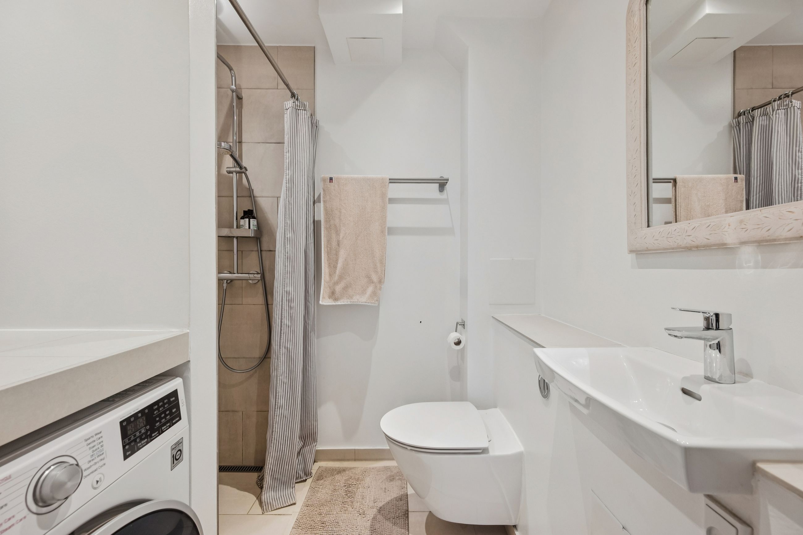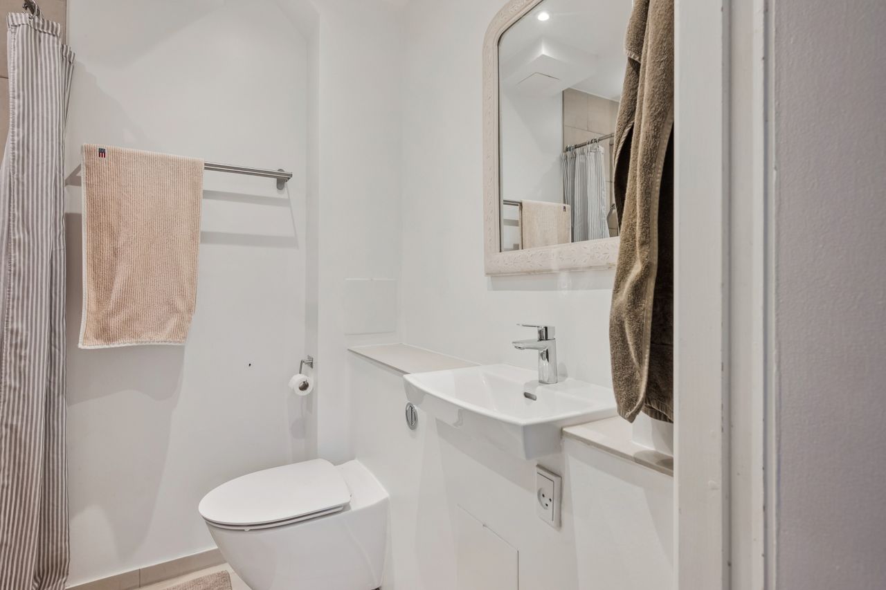 Fra soveværelset er der direkte adgang til badeværelset, som med sine lyse materialer og gennemtænkte indretning skaber en stilfuld og funktionel atmosfære. Her er der vaskemaskine, hvilket gør hverdagen ekstra bekvem.