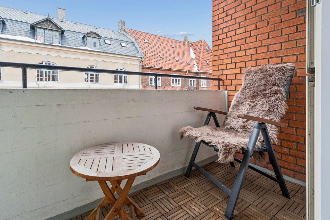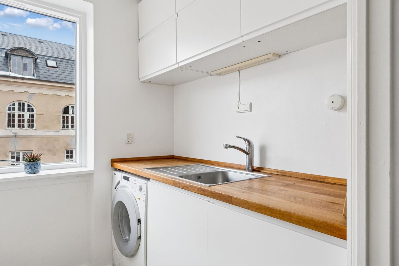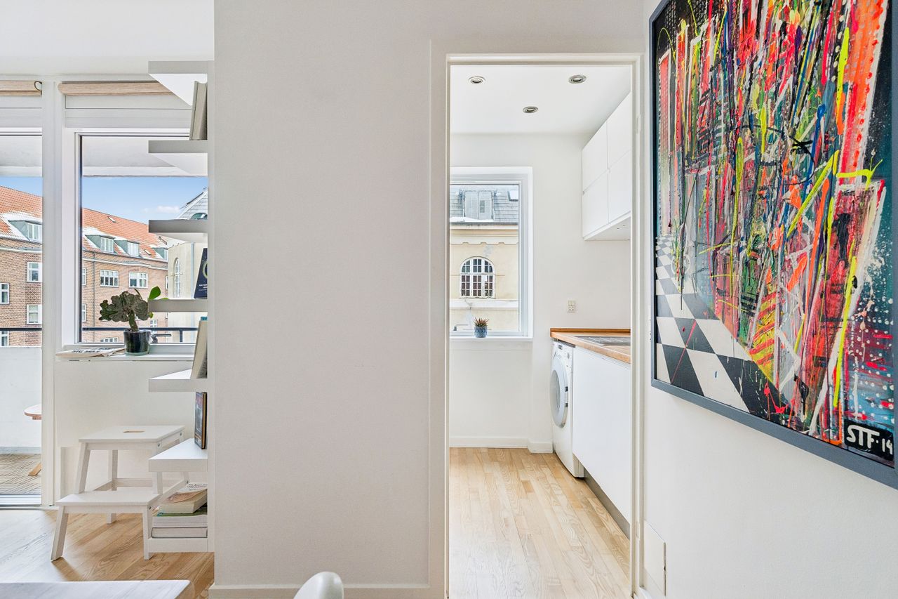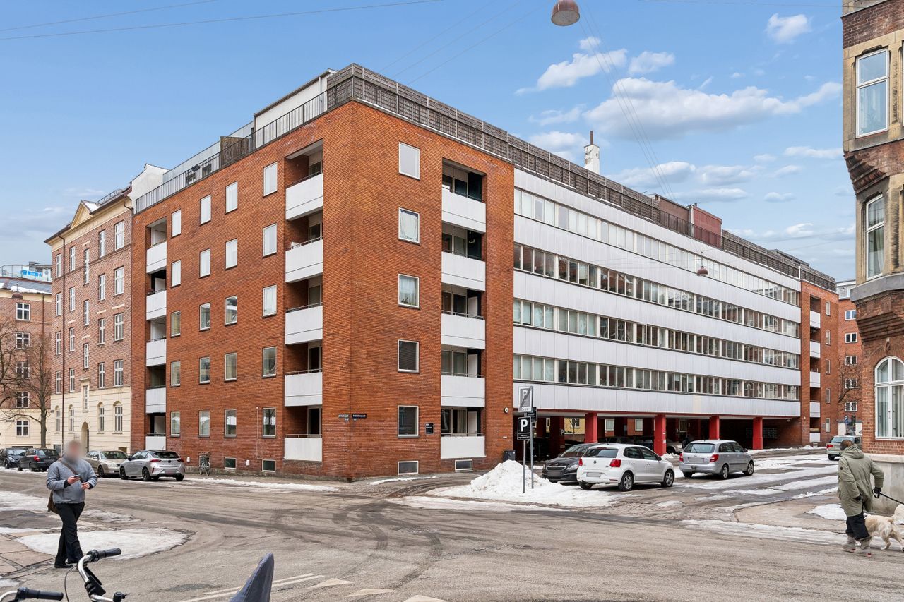 Indretning: Velkommen til denne indbydende hjørnelejlighed beliggende på 4. sal i en veldrevet ejendom med elevator. Lejligheden udmærker sig ved et fantastisk lysindfald fra flere verdenshjørner samt en skøn fornemmelse af fri himmel, som skaber en let og luftig atmosfære i boligen. Lejligheden fremstår indflytningsklar og er ideel for både singler og par, der ønsker en nem og komfortabel bolig i et af Østerbros mest eftertragtede kvarterer. Lejligheden er i dag indrettet som en veldisponeret 1‑værelses, men planløsningen giver gode muligheder for at etablere en separat soveafdeling og dermed omdanne boligen til en funktionel 2‑værelses lejlighed, hvis behovet opstår. Dette gør boligen særdeles fleksibel og attraktiv for både nuværende og fremtidige boligbehov. Opholdsrummet er rummeligt og let at indrette med både sofaarrangement, spiseplads og soveafsnit. De store vinduespartier understreger lejlighedens hjørneplacering og sikrer et flot, naturligt lys hele dagen. Fra opholdsrummet er der direkte udgang til en overdækket altan, hvilket skaber en naturlig forlængelse af opholdsrummet og gør det muligt at nyde uderummet til fulde. Lejligheden har et separat og funktionelt køkken, der fremstår stilrent med hvide elementer, god skabsplads og massive træbordplader. Køkkenet er praktisk indrettet og rummer desuden vaskemaskine, hvilket bidrager til en velfungerende hverdag.