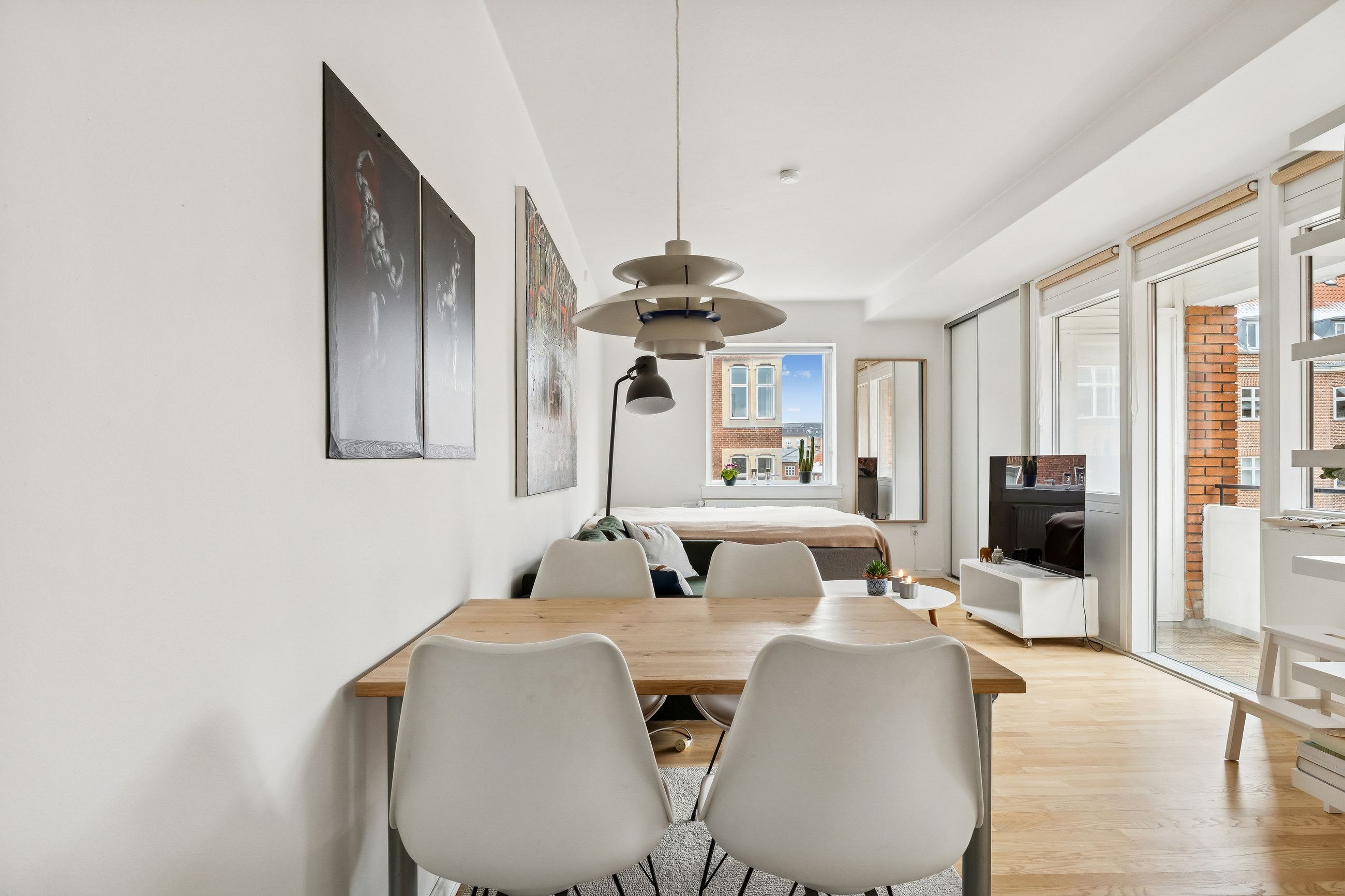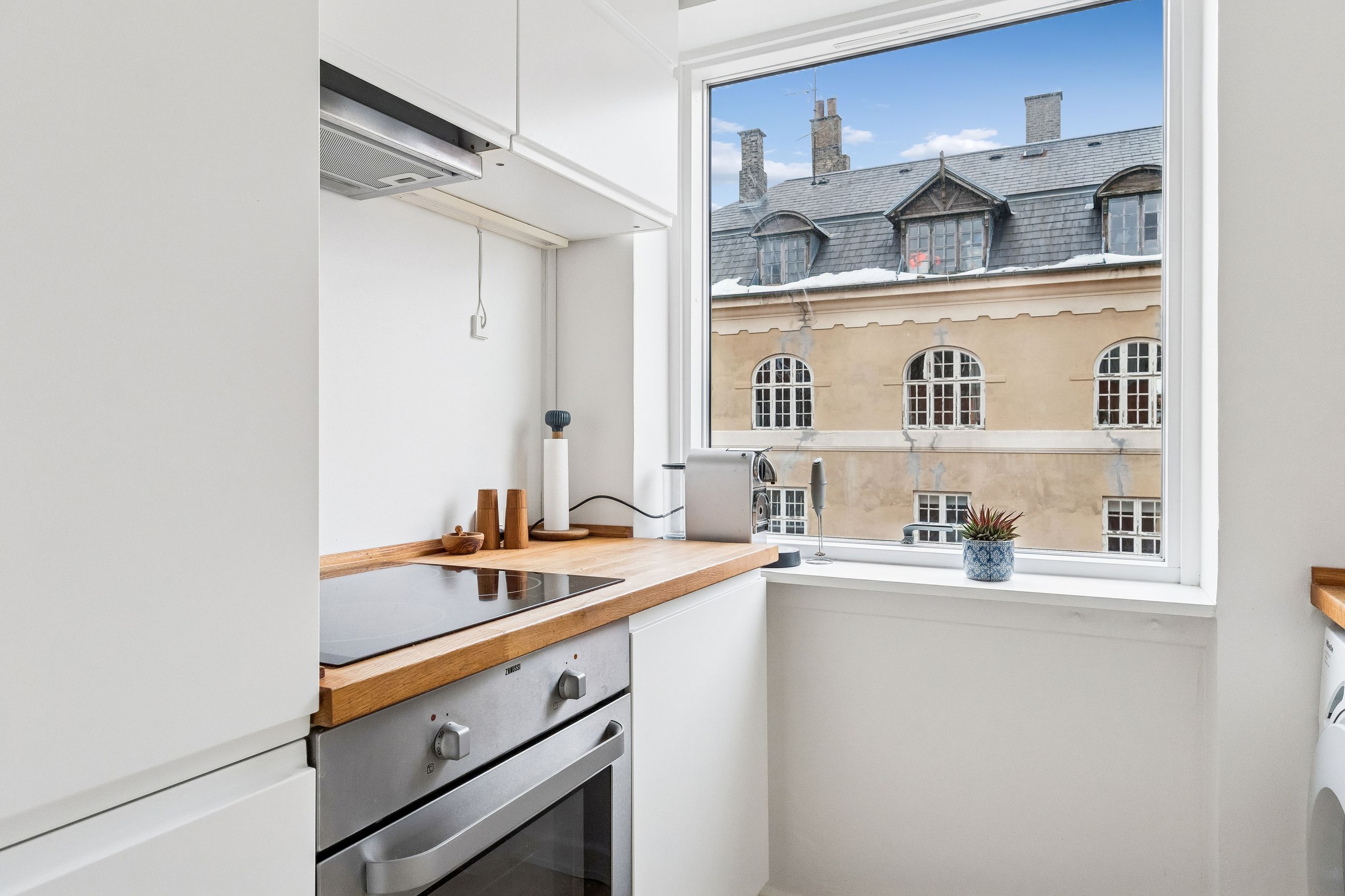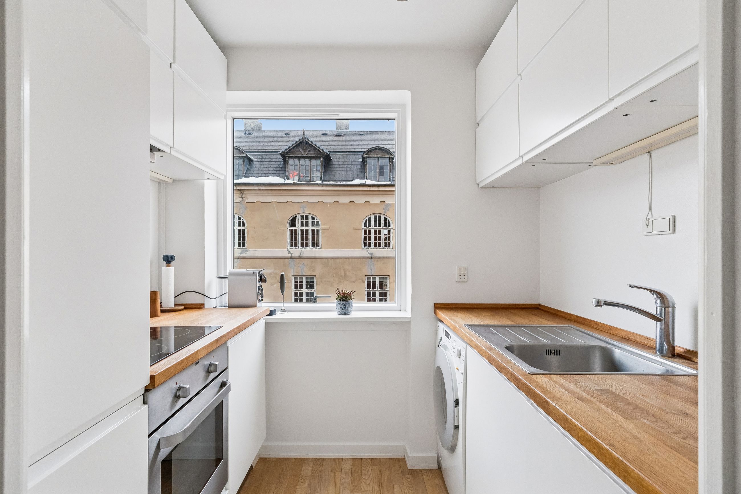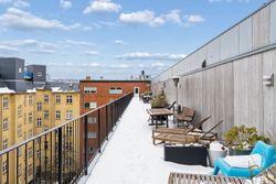Indretning: Velkommen til denne indbydende hjørnelejlighed beliggende på 4. sal i en veldrevet ejendom med elevator. Lejligheden udmærker sig ved et fantastisk lysindfald fra flere verdenshjørner samt en skøn fornemmelse af fri himmel, som skaber en let og luftig atmosfære i boligen. Lejligheden fremstår indflytningsklar og er ideel for både singler og par, der ønsker en nem og komfortabel bolig i et af Østerbros mest eftertragtede kvarterer. Lejligheden er i dag indrettet som en veldisponeret 1‑værelses, men planløsningen giver gode muligheder for at etablere en separat soveafdeling og dermed omdanne boligen til en funktionel 2‑værelses lejlighed, hvis behovet opstår. Dette gør boligen særdeles fleksibel og attraktiv for både nuværende og fremtidige boligbehov. Opholdsrummet er rummeligt og let at indrette med både sofaarrangement, spiseplads og soveafsnit. De store vinduespartier understreger lejlighedens hjørneplacering og sikrer et flot, naturligt lys hele dagen. Fra opholdsrummet er der direkte udgang til en overdækket altan, hvilket skaber en naturlig forlængelse af opholdsrummet og gør det muligt at nyde uderummet til fulde. Lejligheden har et separat og funktionelt køkken, der fremstår stilrent med hvide elementer, god skabsplads og massive træbordplader. Køkkenet er praktisk indrettet og rummer desuden vaskemaskine, hvilket bidrager til en velfungerende hverdag.