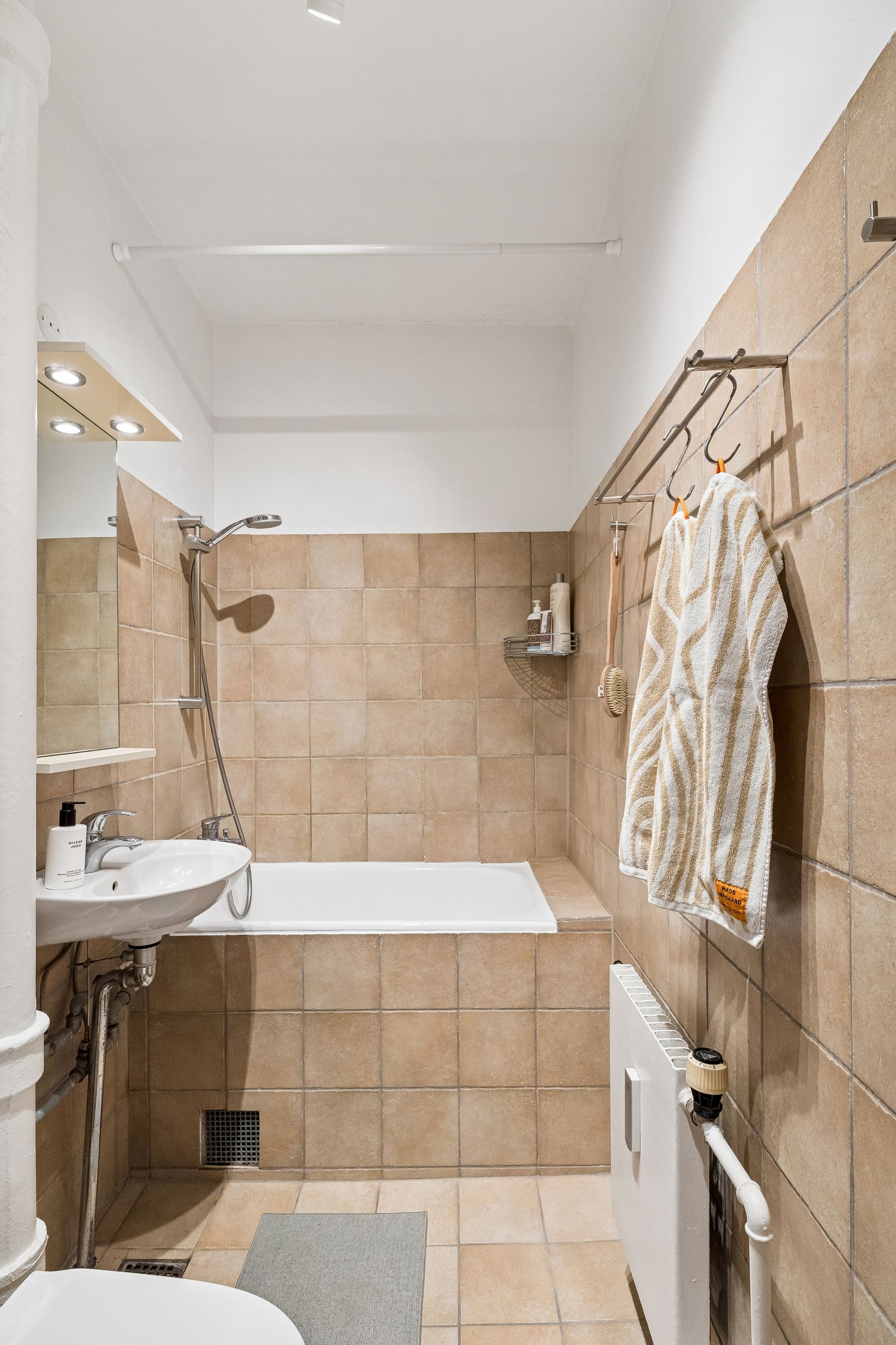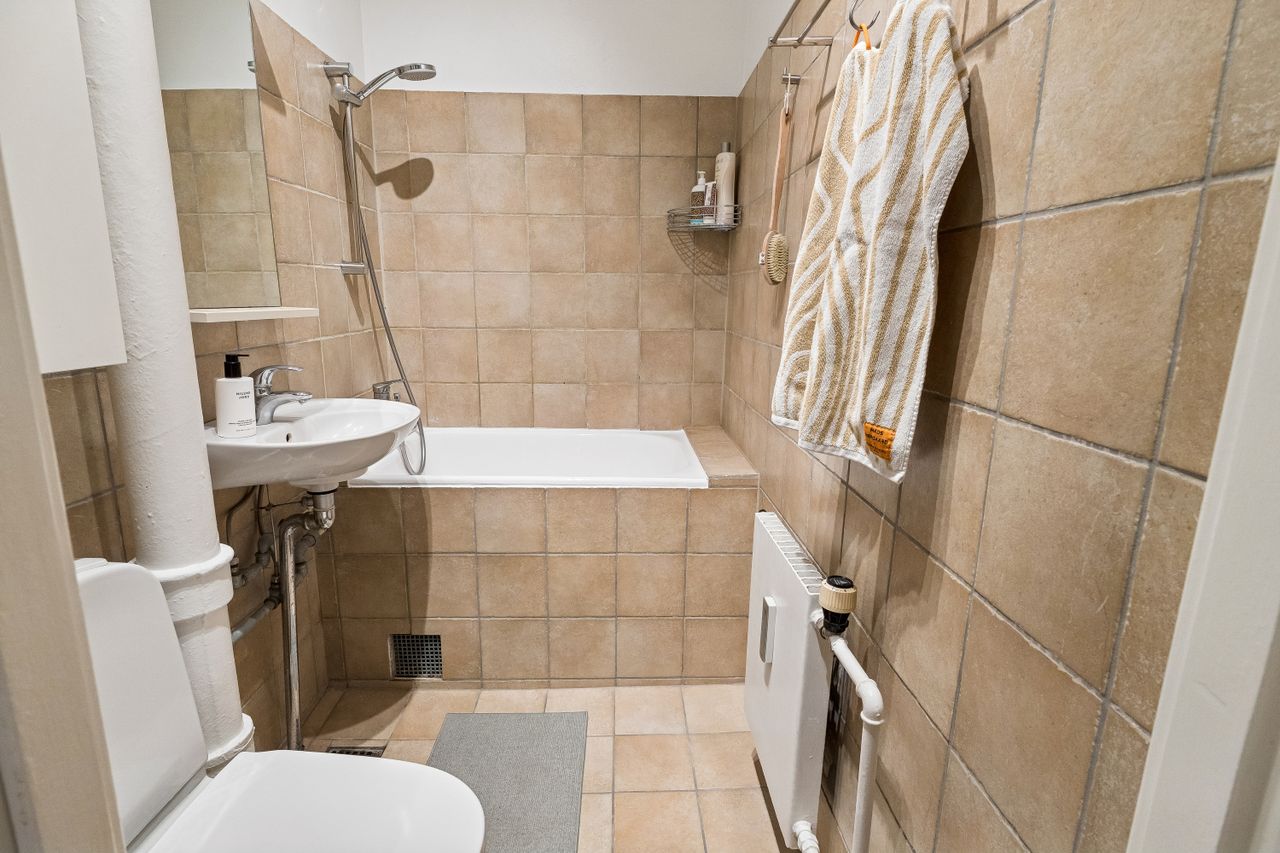 Badeværelset er pænt og velholdt med lyse fliser, badekar samt seperat brusemulighed.