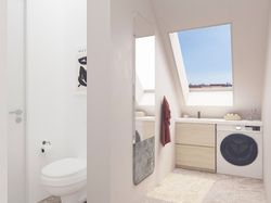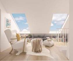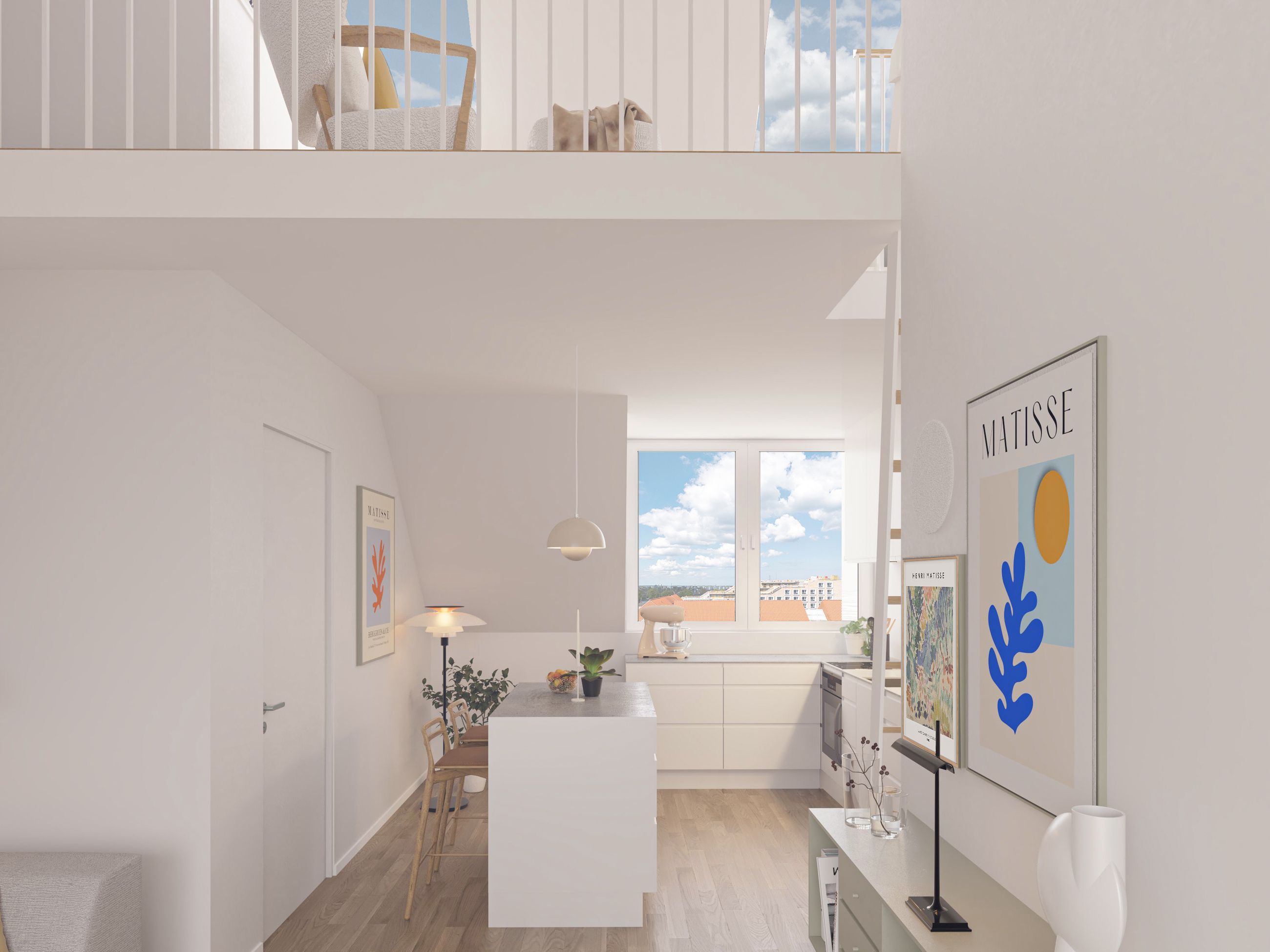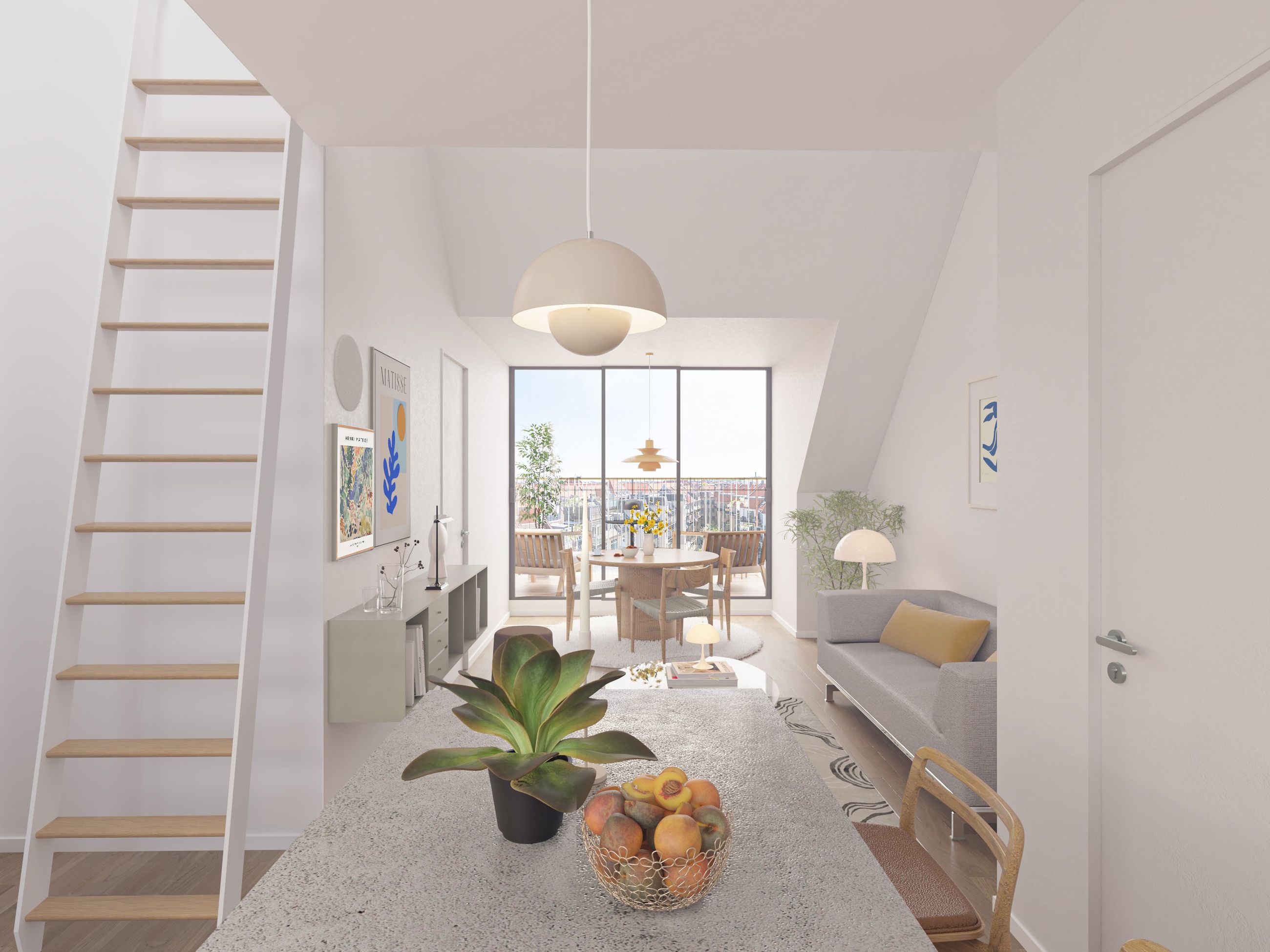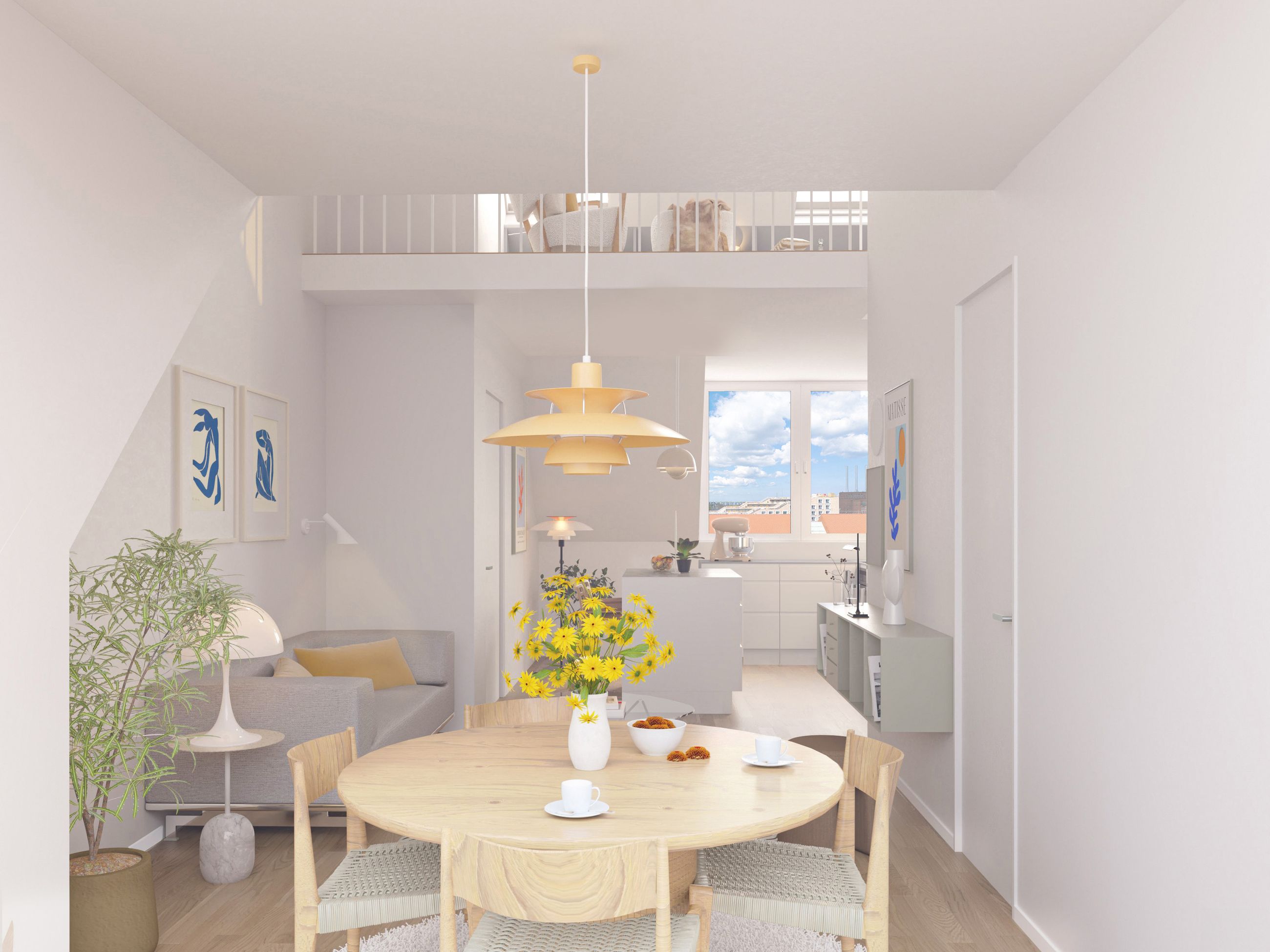 Det er ikke en ombygning. Det er ikke et kompromis. Det er 100 % nybyggeri, designet fra bunden med øje for lys, luft, komfort og æstetik. Hver lejlighed har sin egen unikke karakter, men fælles for dem alle er en generøs loftshøjde med hems, som giver en fantastisk rumfornemmelse og masser af naturligt lys fra både vinduer og ovenlys. Det lyse interiør skaber en behagelig stemning, som får dig til at føle dig hjemme med det samme. Køkkenerne er moderne og gennemtænkt, både æstetisk og funktionelt. De rummelige soveværelser indbyder til ro og velvære, og badeværelserne er udført i nøje udvalgte kvalitetsmaterialer.
