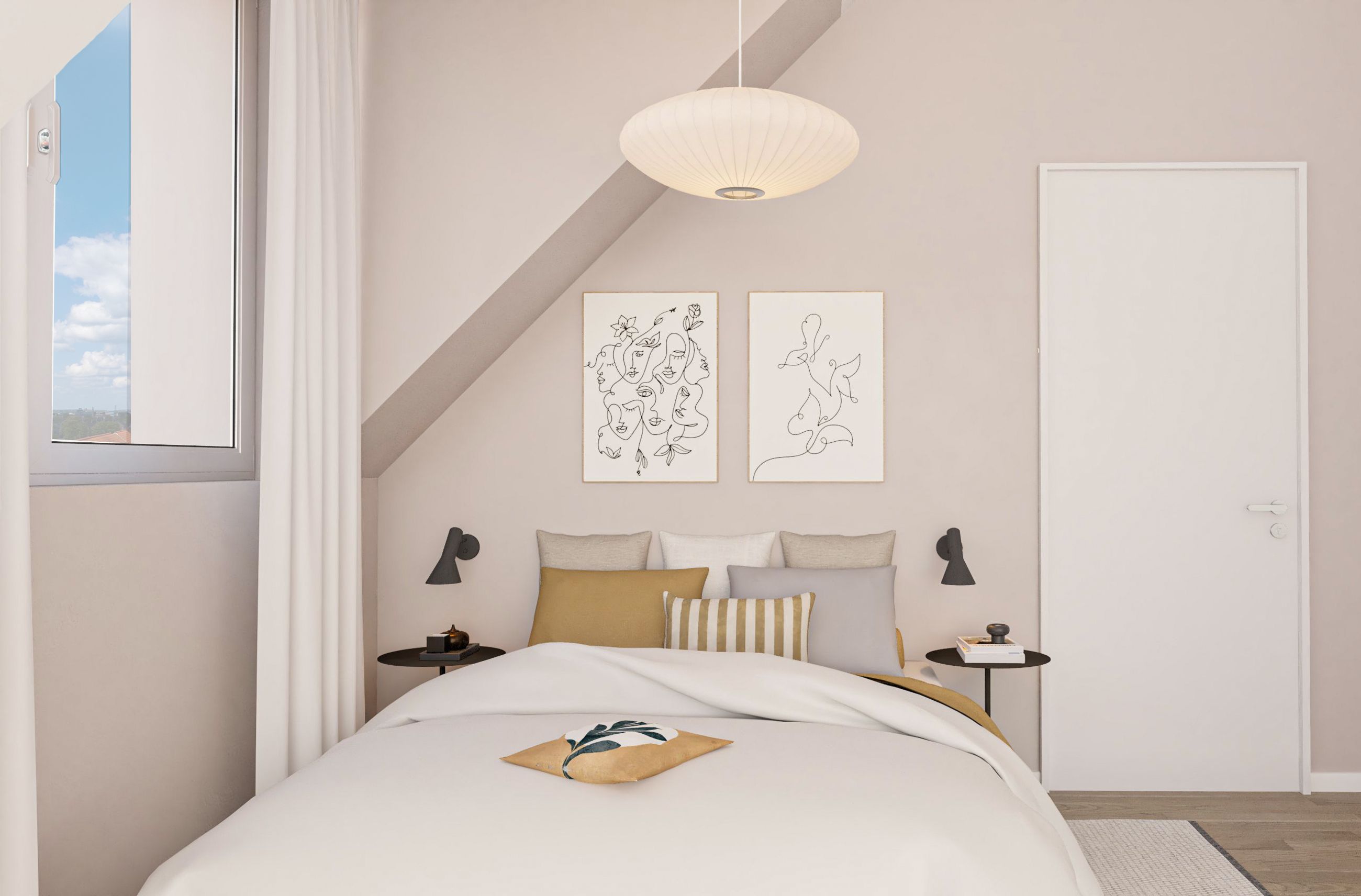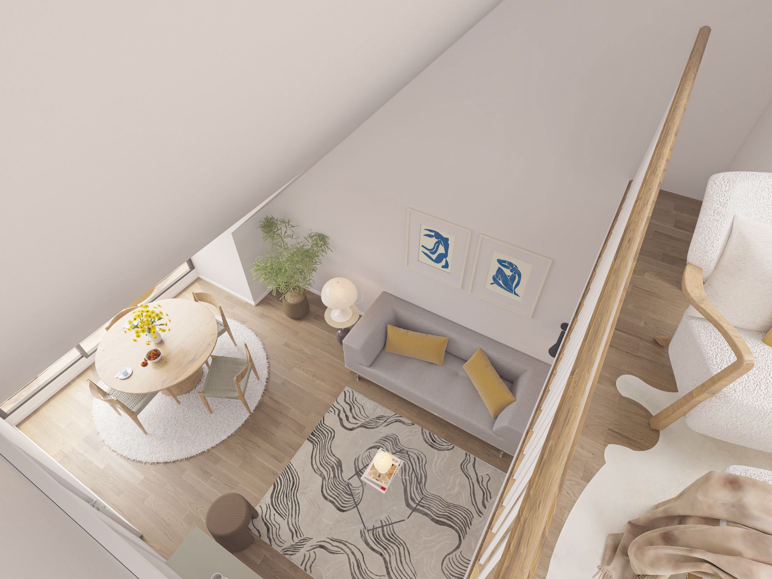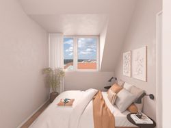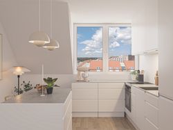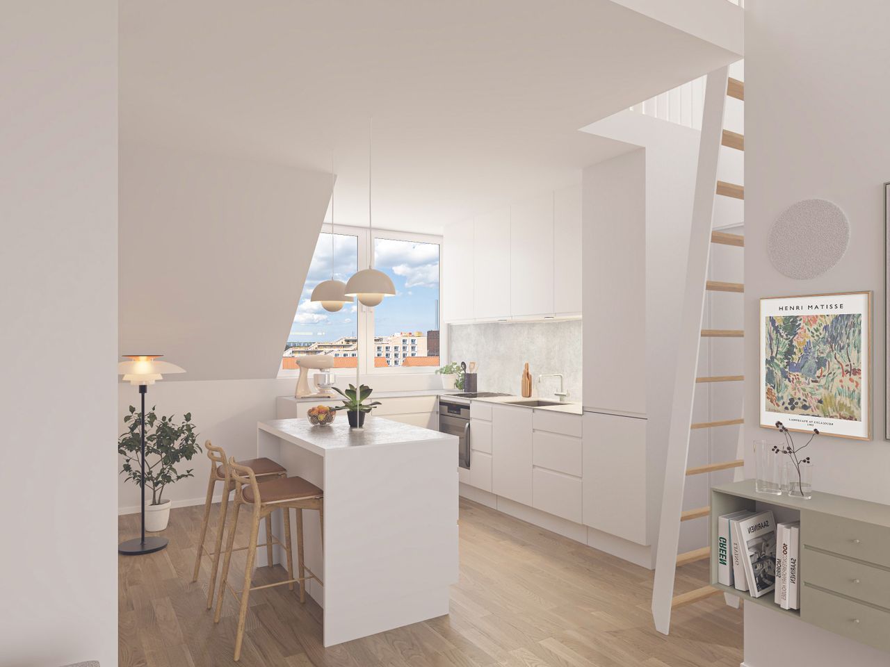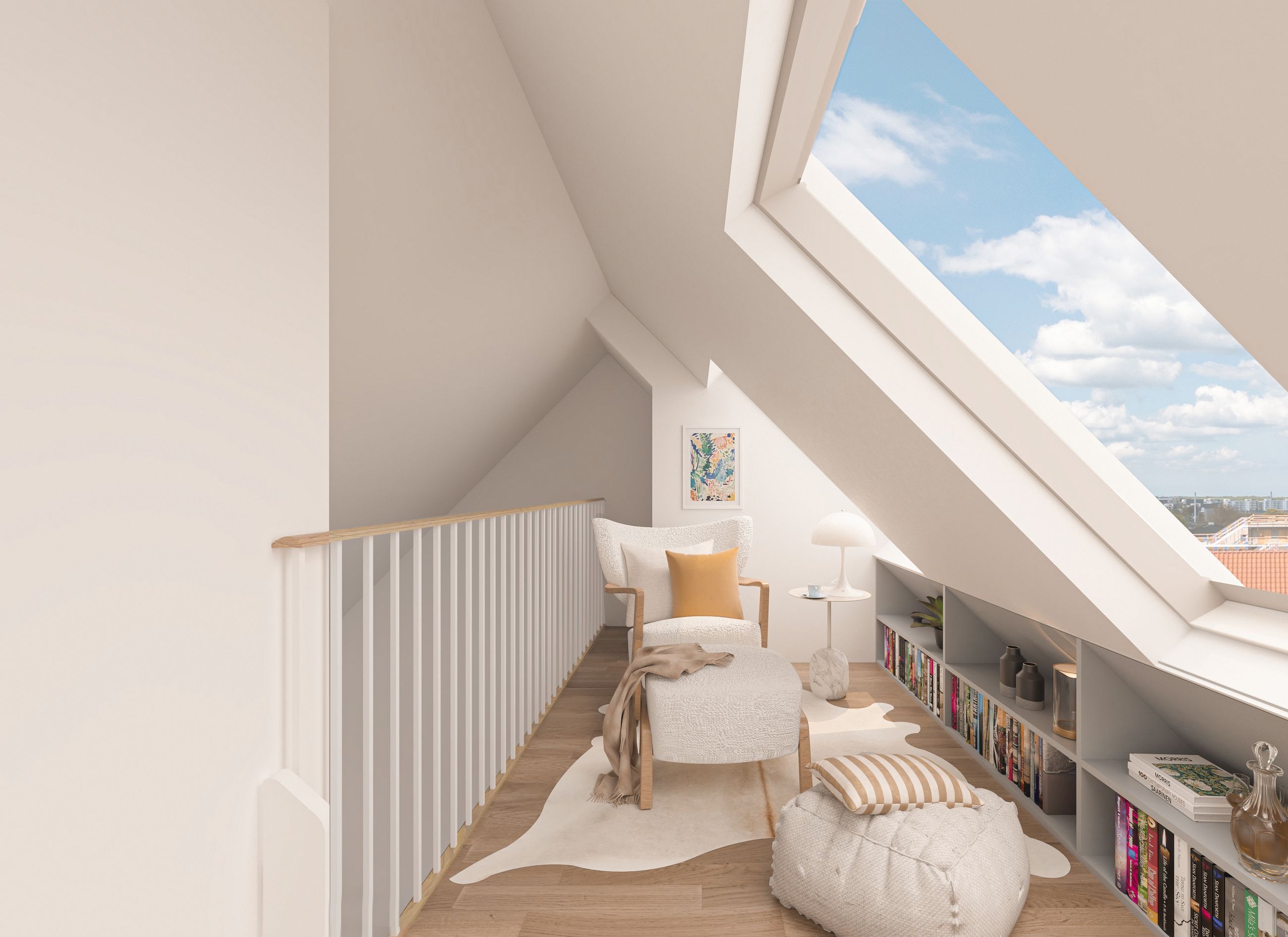 Det er ikke en ombygning. Det er ikke et kompromis. Det er 100 % nybyggeri, designet fra bunden med øje for lys, luft, komfort og æstetik. Hver lejlighed har sin egen unikke karakter, men fælles for dem alle er en generøs loftshøjde med hems, som giver en fantastisk rumfornemmelse og masser af naturligt lys fra både vinduer og ovenlys. Det lyse interiør skaber en behagelig stemning, som får dig til at føle dig hjemme med det samme. Køkkenerne er moderne og gennemtænkt, både æstetisk og funktionelt. De rummelige soveværelser indbyder til ro og velvære, og badeværelserne er udført i nøje udvalgte kvalitetsmaterialer.