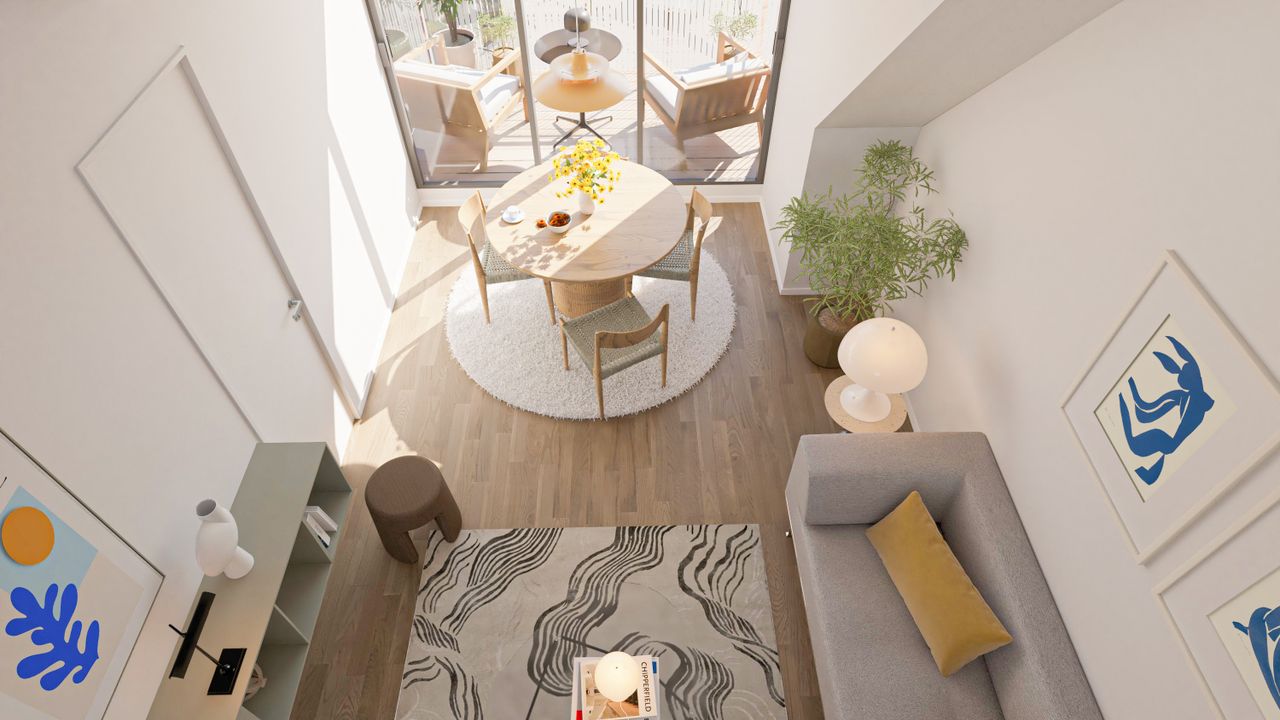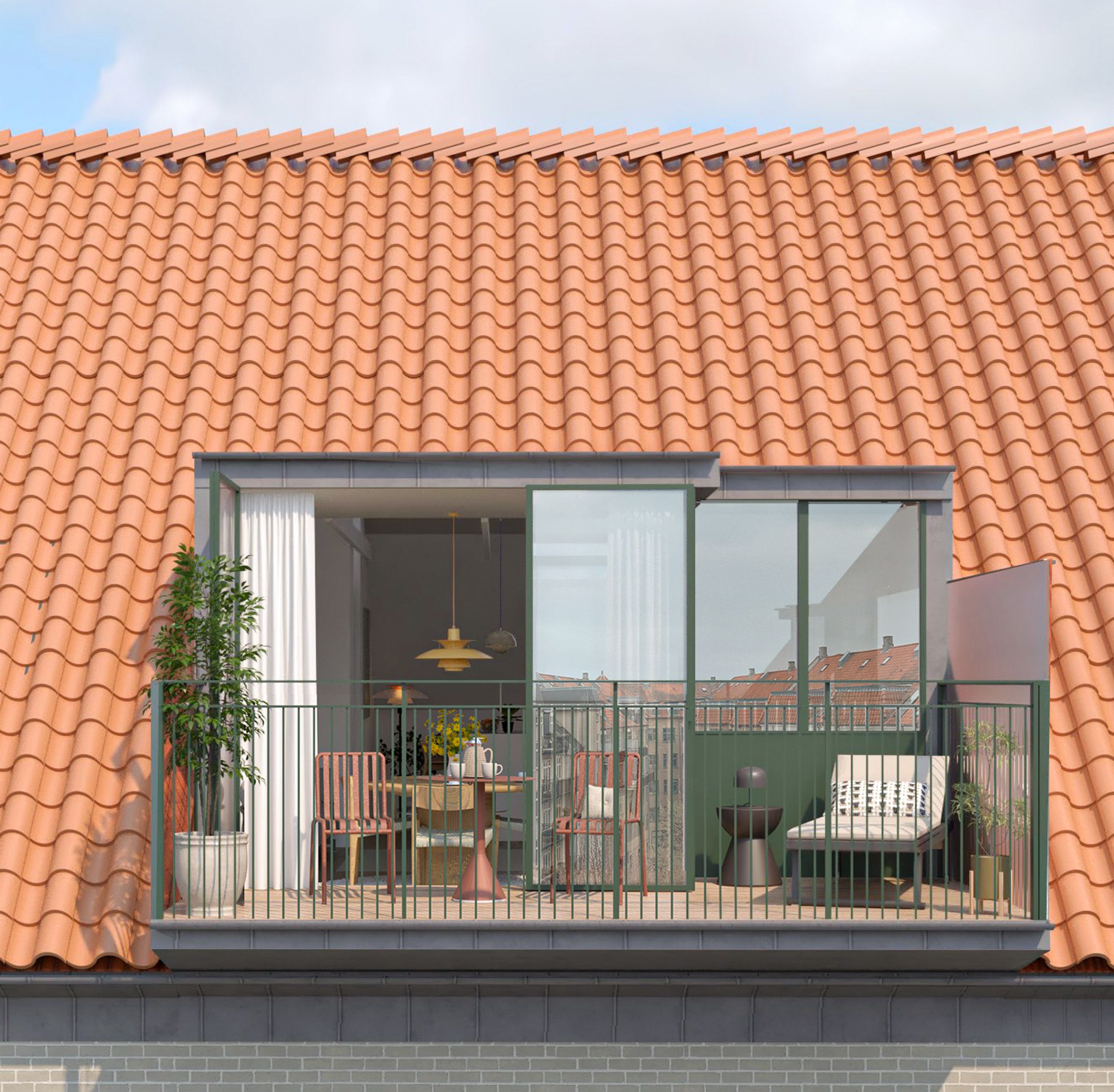 Fra din altan kan du nyde udsigten til den rolige, grønne baggård. Selvom du bor øverst, mærker du stadig en fin forbindelse til omgivelserne. Her får du et fredeligt åndehul – perfekt til kaffe, en god bog eller bare et øjeblik med udsigten.