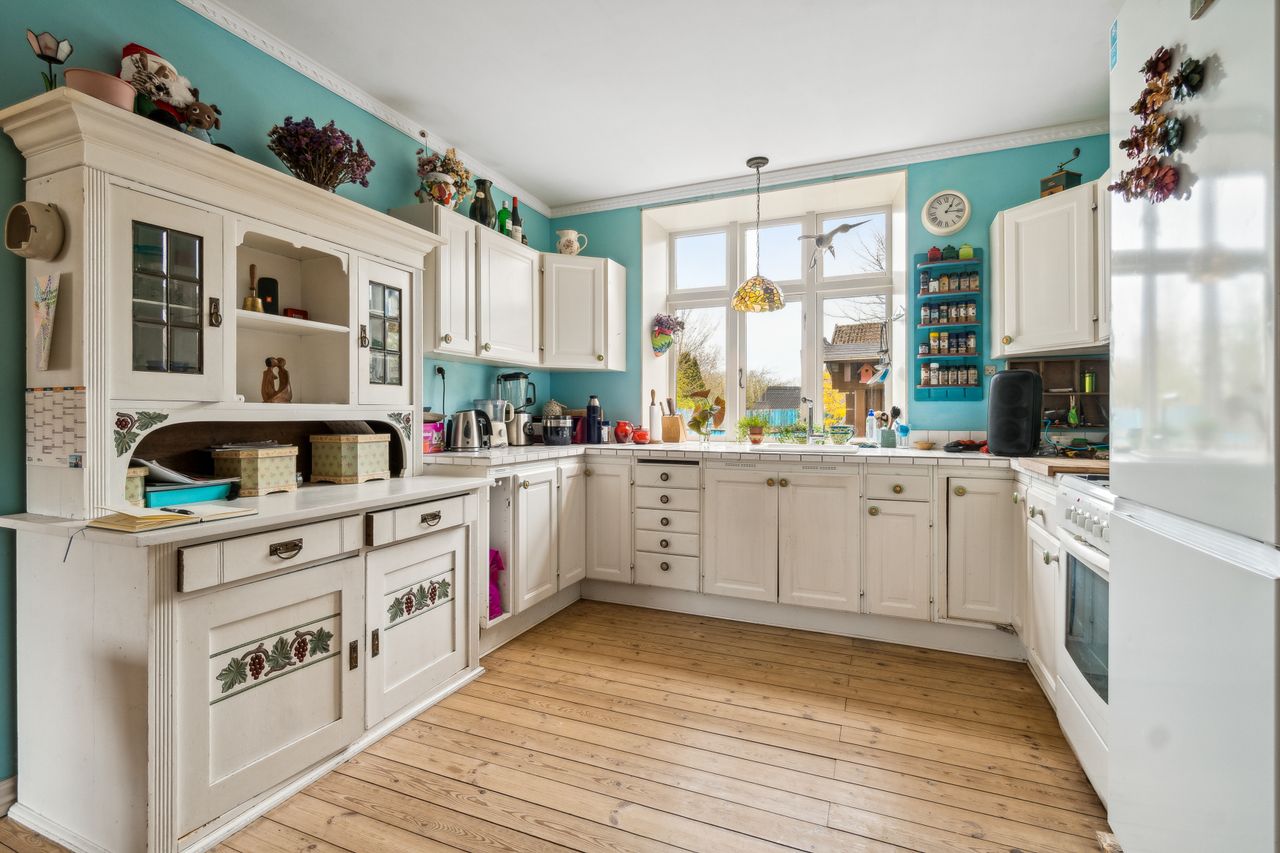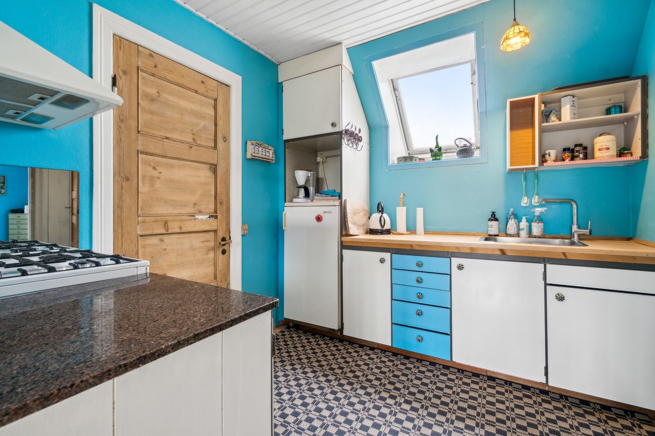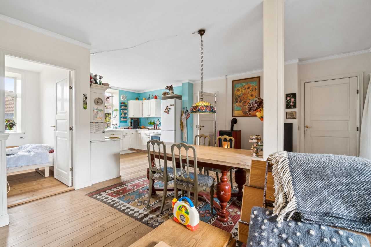 Køkken i åben forbindelse til lys stue m/pillebrændeovn.