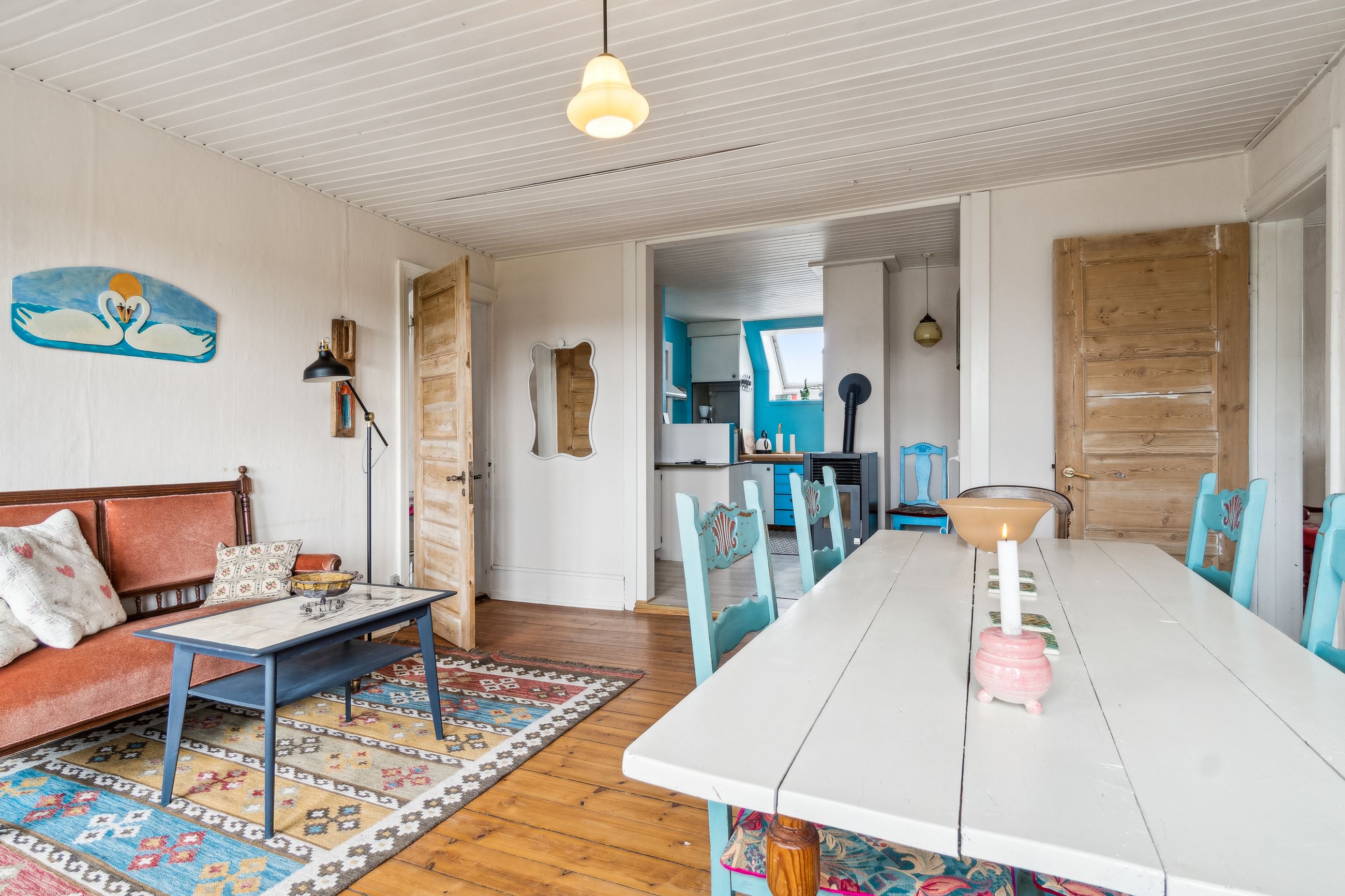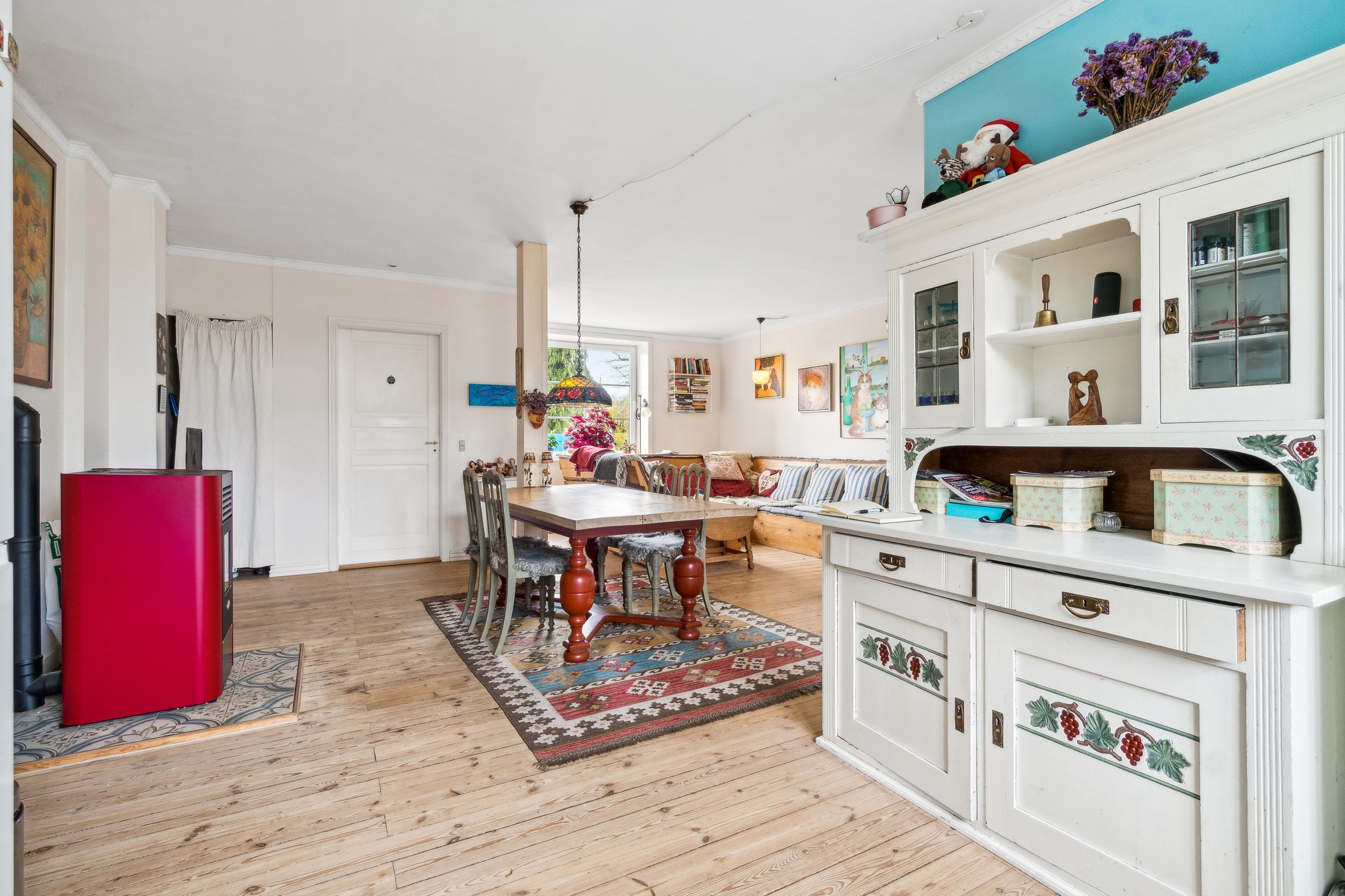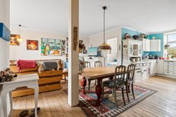 Stor lys stue m/pillebrændeovn i åben forbindelse med køkken.