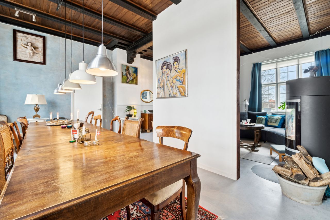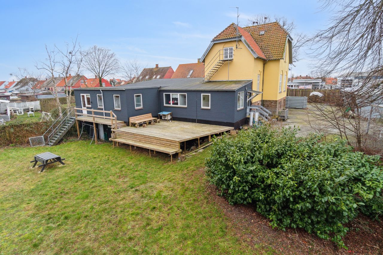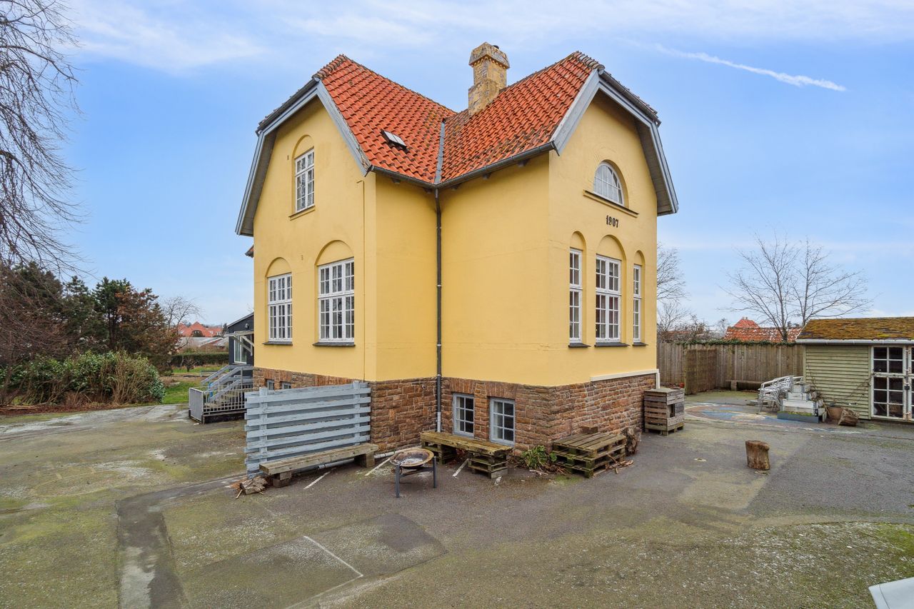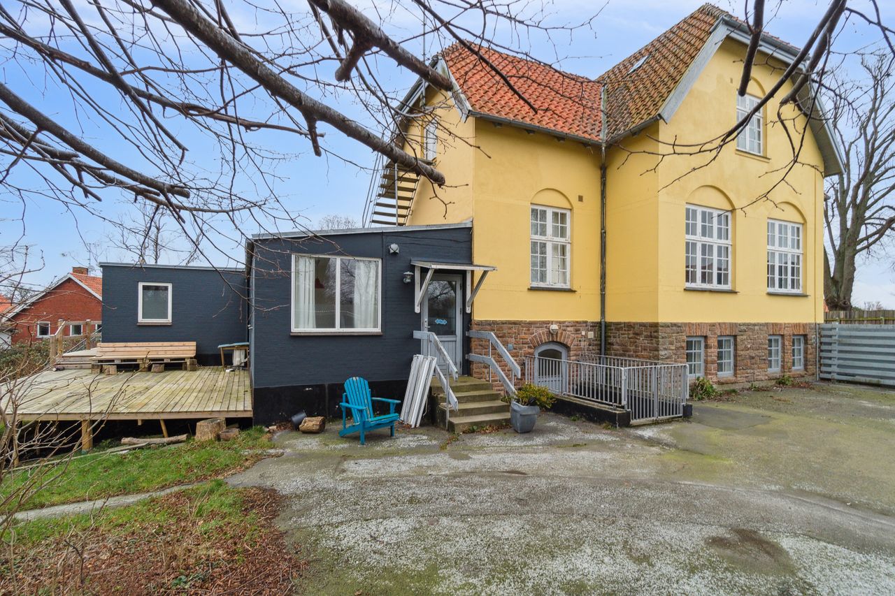 Stor skøn herskabelig villa centralt i Nexø by omkranset af en stor frodig have, hvor der er indrettet flere hyggekroge. En stor træterrasse med udgang fra køkken, placeret så solen kan nydes hele dagen. Orangeriet i gården, som danner rammerne om et aktivt udeliv, er bare en del af hele boligens tilbud. Herskabeligheden afspejler sig også i indretningen, med de skønne robuste loftsbjælker som skaber en hyggelig atmosfære.Institutionslooket fra den tidligere anvendelse som børnehave er udvisket og erstattet af det rustikke udtryk på den fede måde.