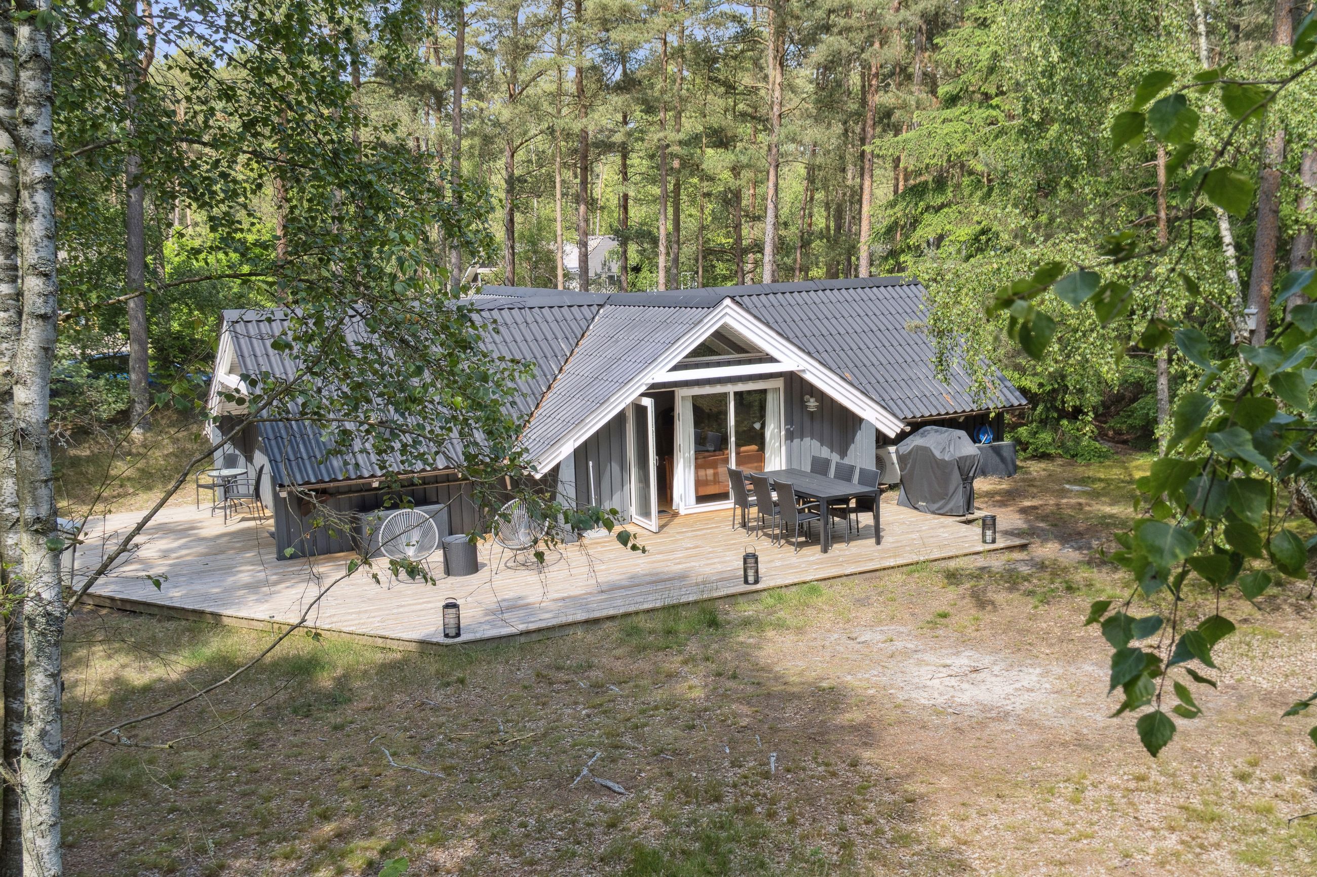 Stor træterrasse, som forlænger de gode sommeraftner og solnedgangen kan følges.