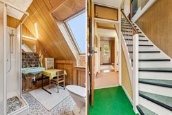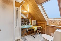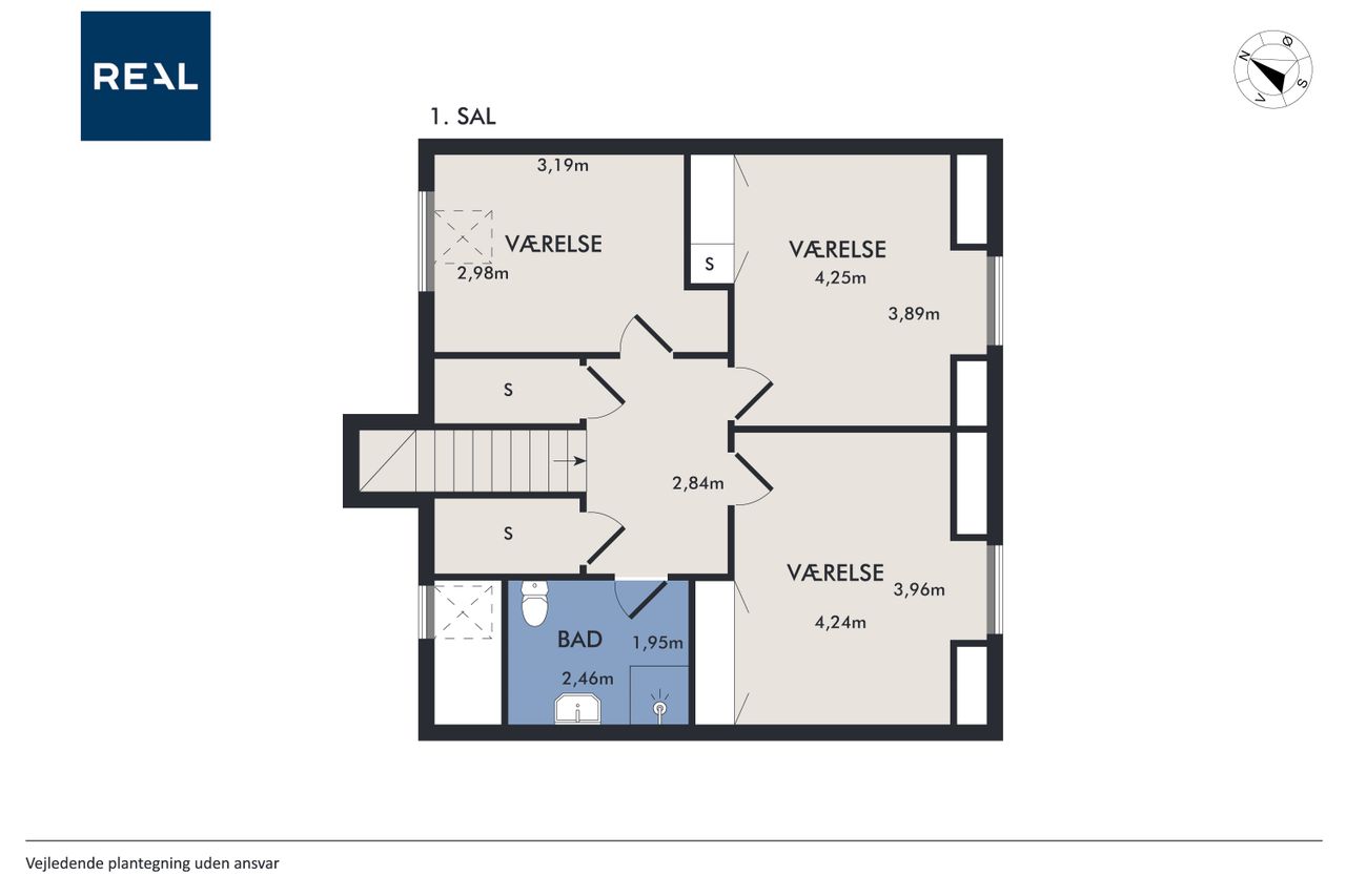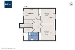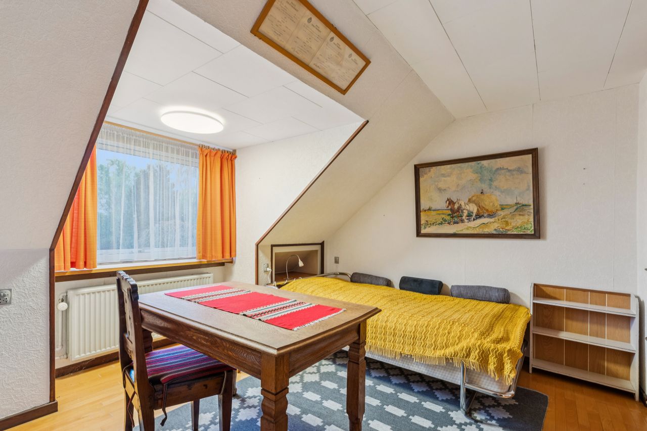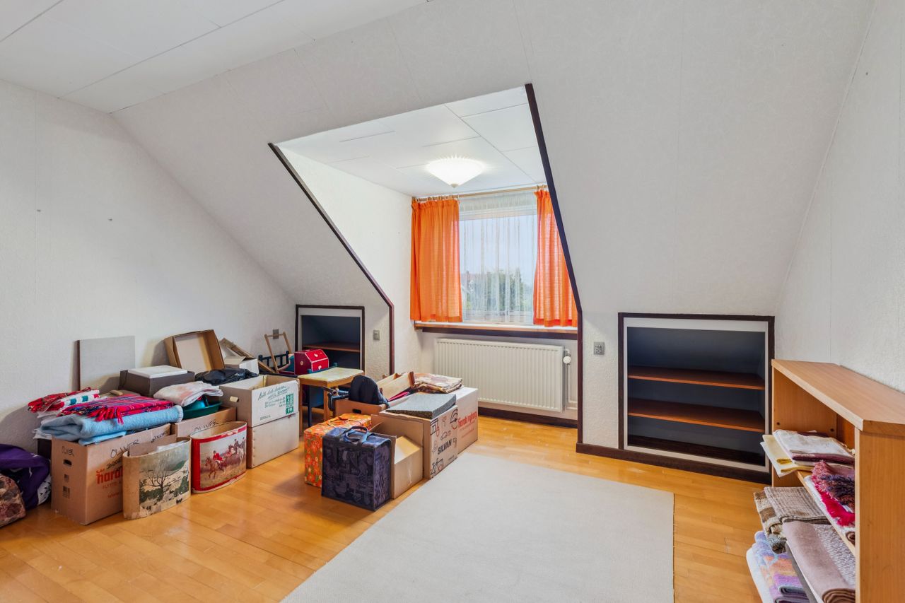 På 1. salen ligger tre gode, regulære værelser og et badeværelse med brusekabine – Værelserne er ideelle til børneafdeling, hjemmekontor eller gæsteværelse.