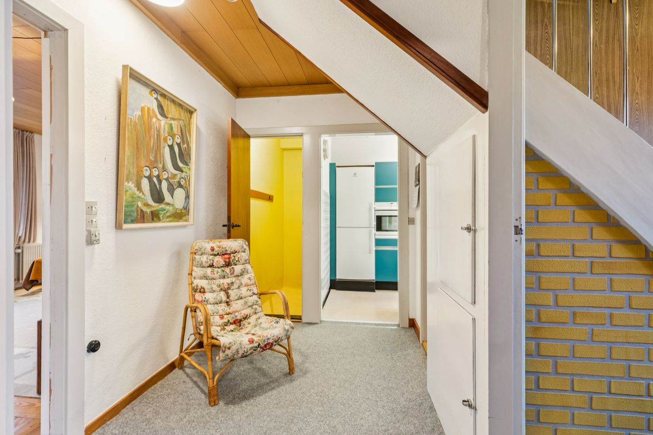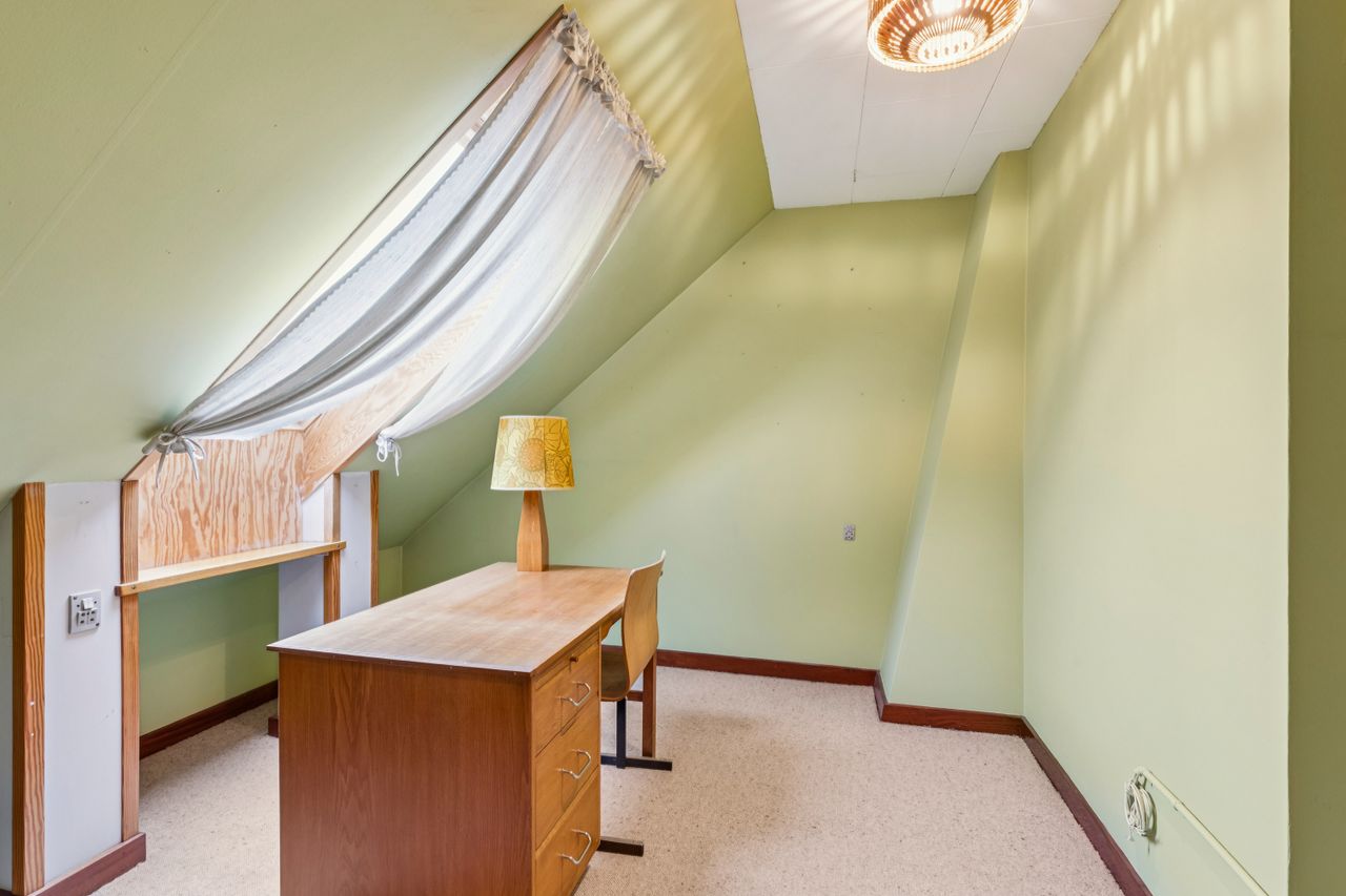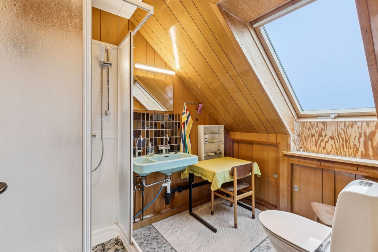 Køkkenet er et kapitel for sig. Et originalt, tysk Poggenpohl-kvalitetskøkken fra 1972 i en skøn petroliumsfarve – et ægte blikfang, der emmer af personlighed og godt håndværk. Herudover finder I et soveværelse og et gæstetoilet i stueplan.