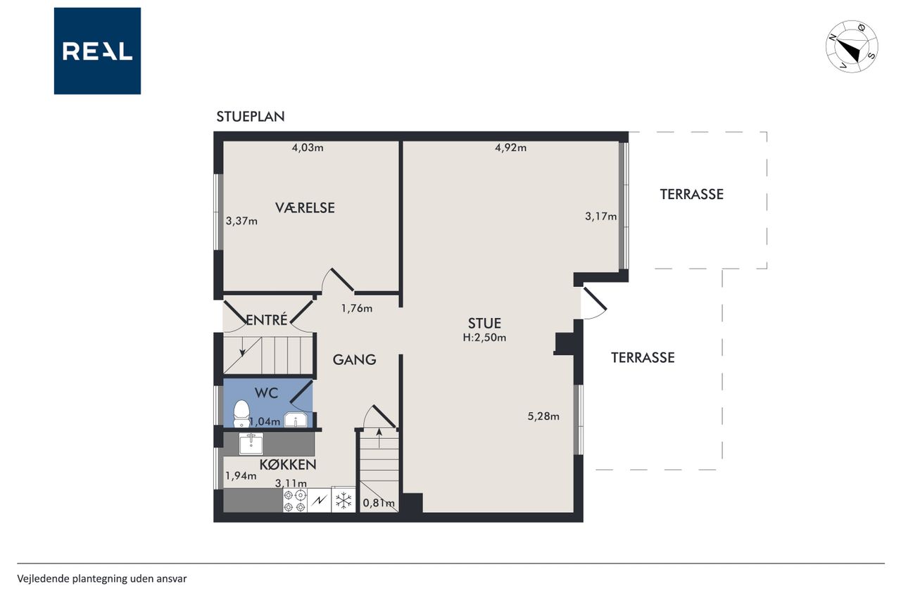 I stueplan bydes I velkommen i et lyst vindfang, der leder videre til fordelingsgangen. Herfra åbner den store, sydvendte stue sig – et naturligt samlingspunkt for både hverdagsliv og gæster. Den fine karnap og udgangen til terrassen giver et dejligt lysindfald, og den lukkede baghave inviterer til både leg, grill og rolige eftermiddage i solen.