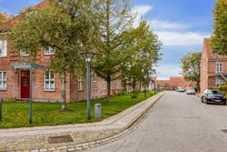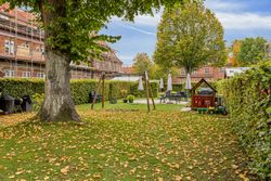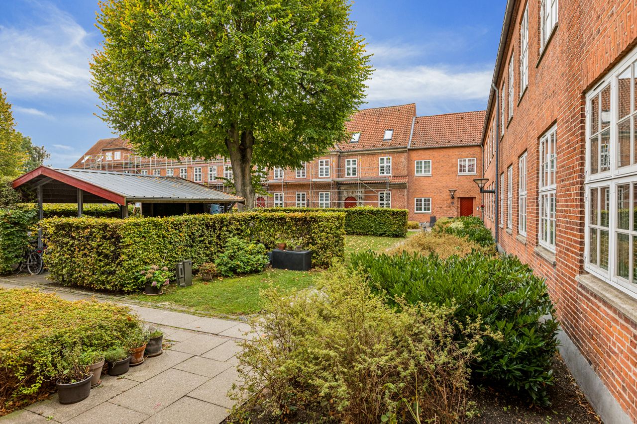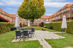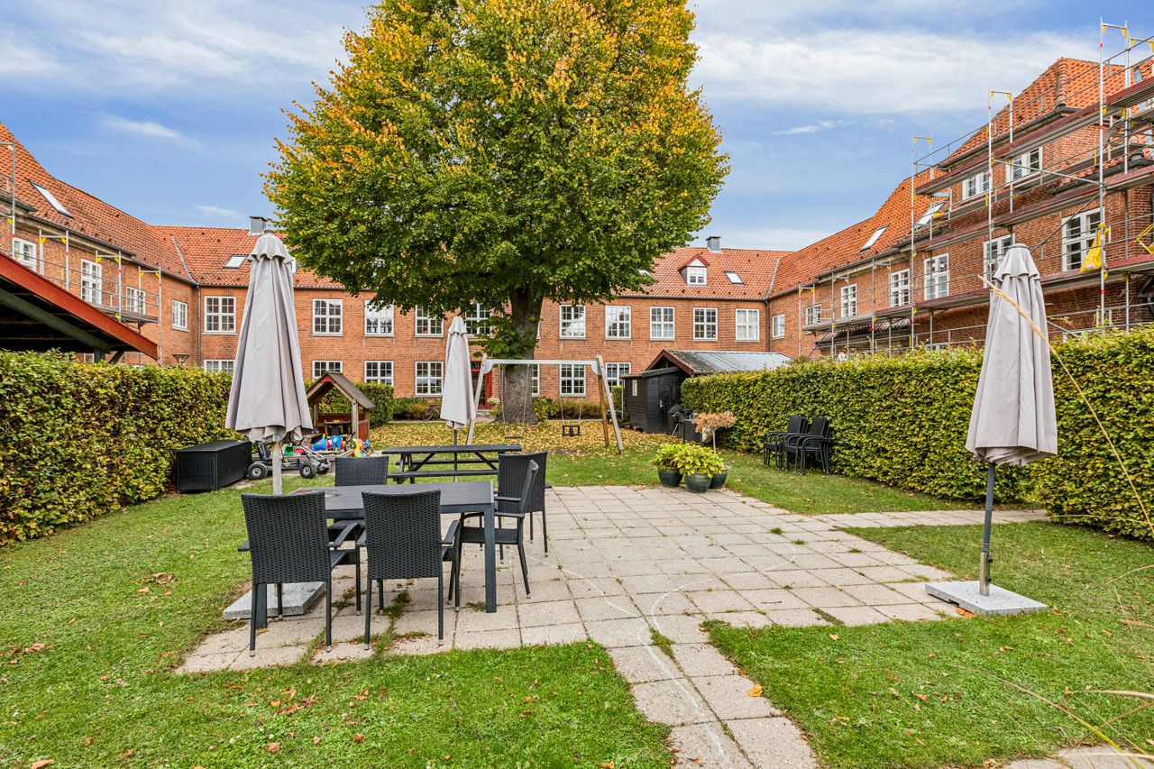 Uden for døren findes et pragtfuldt og grønt gårdmiljø, der indbyder til hyggelige grillaftener, samvær og ro under åben himmel