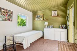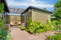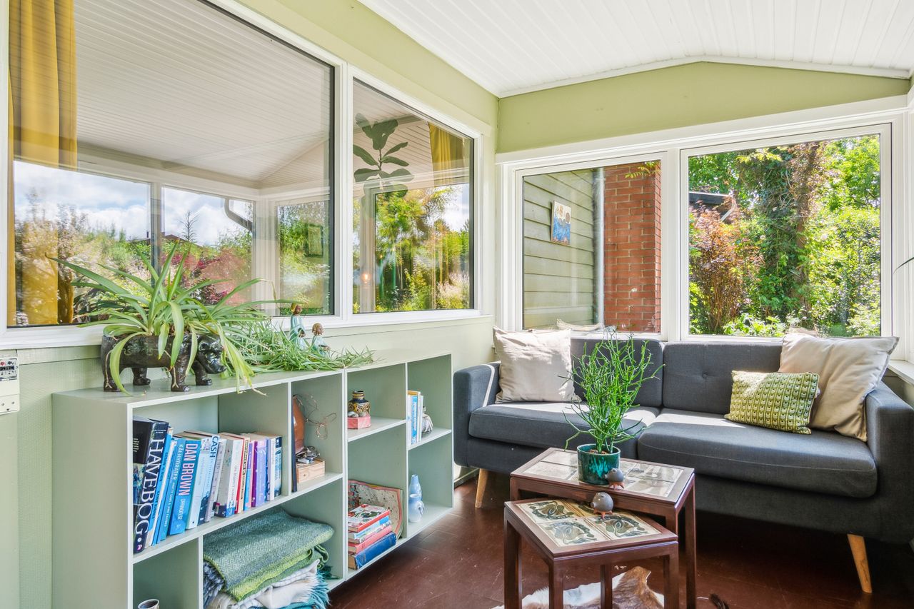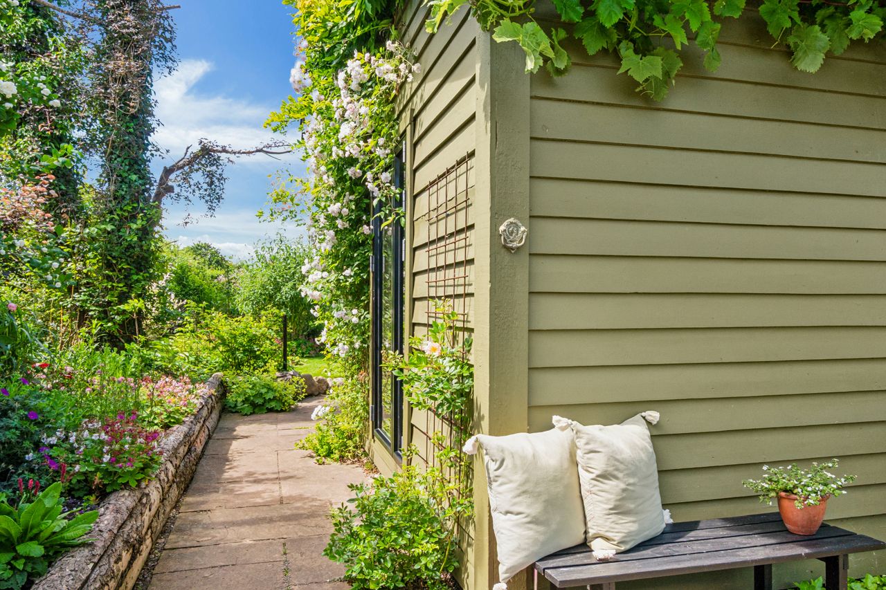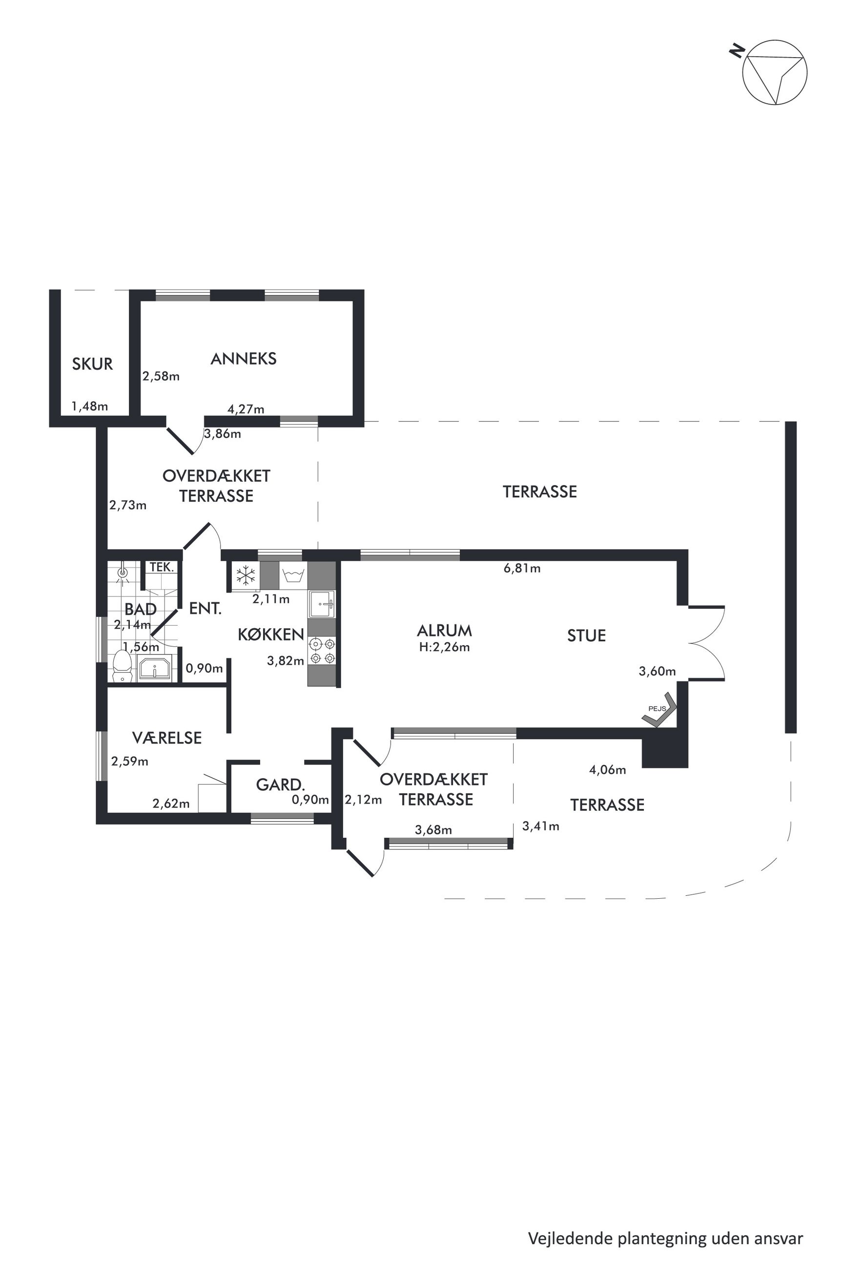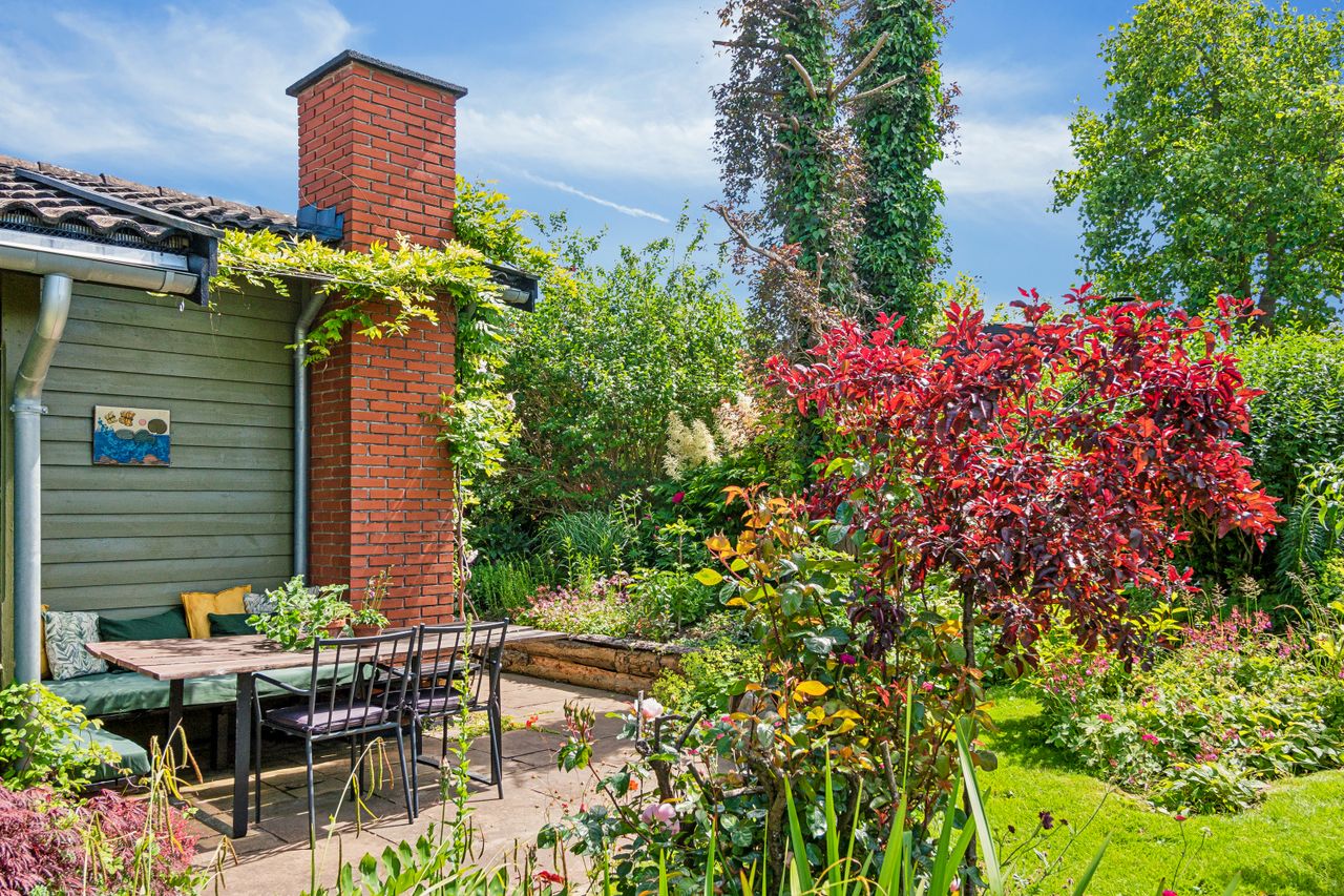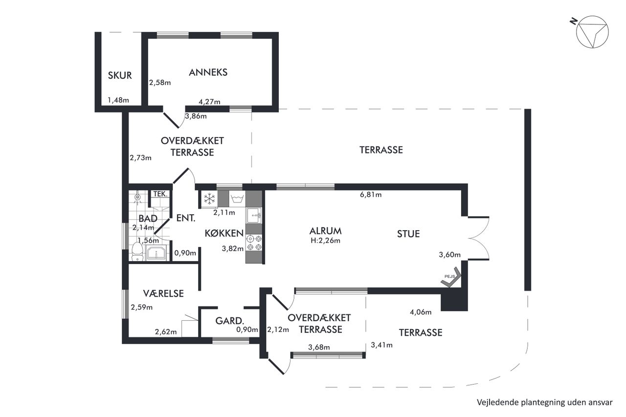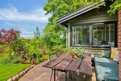 Udenfor finder du en overdækket terrasse og et isoleret udhus, der i dag fungerer som kontor – perfekt