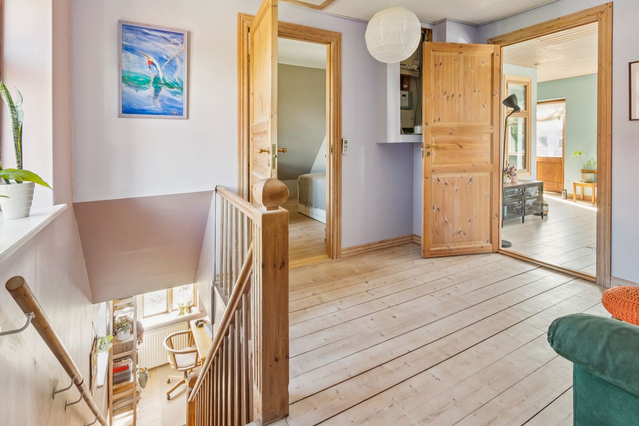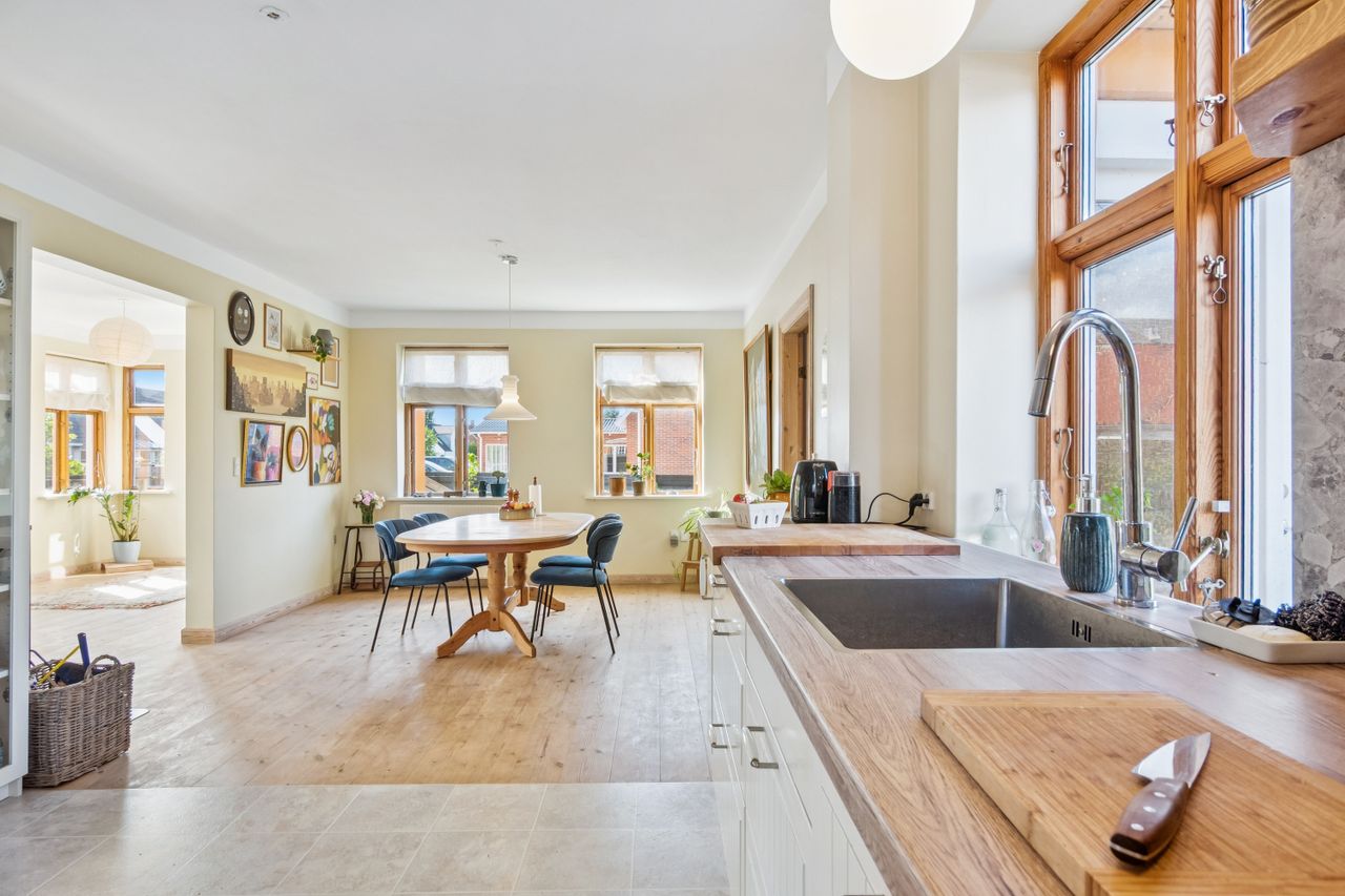 Ejendommens 144 m2 bolig er ideelt opdelt med rummelige værelser, et lyst køkken og et stort opholdsrum, Stort nyt badeværelse med brus, der skaber en hjemlig og indbydende atmosfære. Her er både plads til hyggelige familiebegivenheder og afslapning. De funktionelle rammer gør det nemt at tilpasse boligen til jeres behov, hvad enten I har små børn eller teenagere, der ønsker privatliv og plads til aktiviteter.