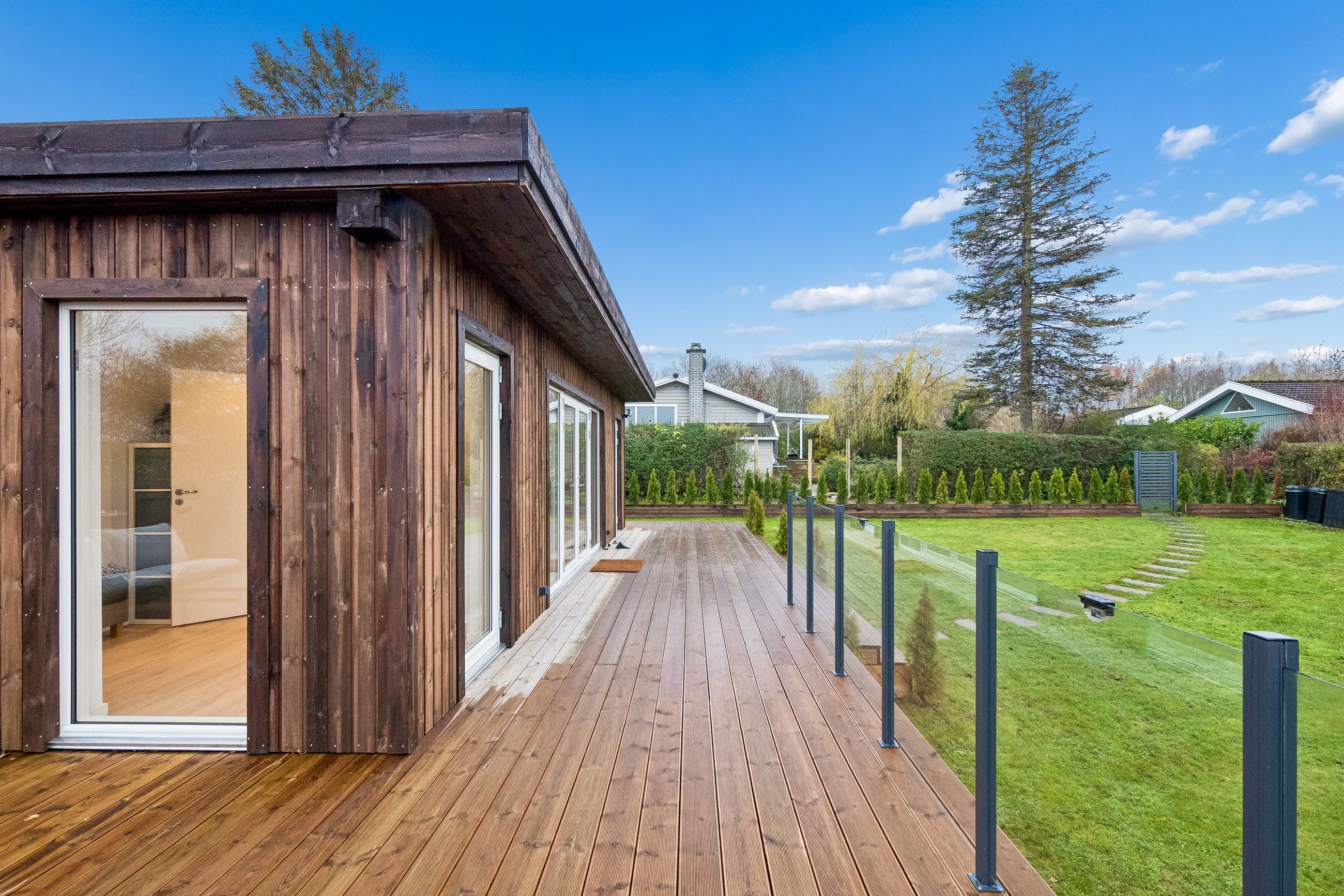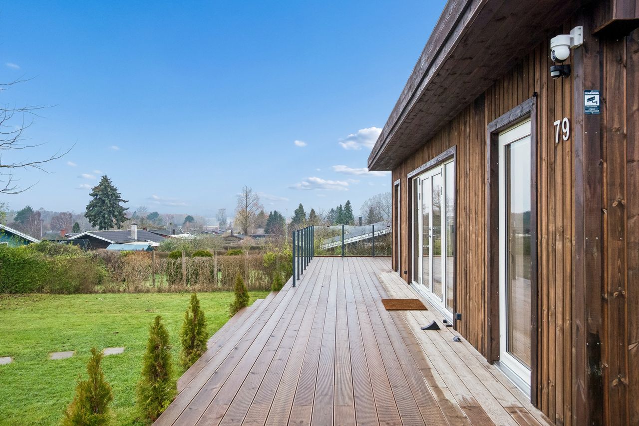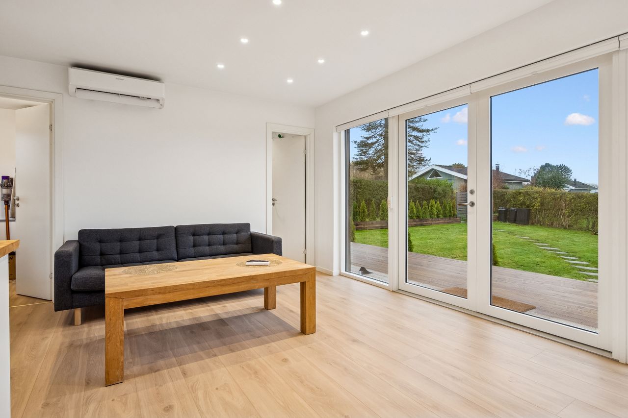 Boligens naturlige samlingspunkt er det lyse opholdsrum, hvor køkken, spiseplads og stue smelter sammen og skaber en behagelig og rummelig atmosfære. Herfra er der direkte adgang til husets absolutte highlight: den store vestvendte træterrasse. Terrassen er perfekt til både afslapning, grillaftener og gæster – og byder på en skøn udsigt hen over hustagene i området, så du virkelig kan nyde aftensolen og den fredfyldte stemning.