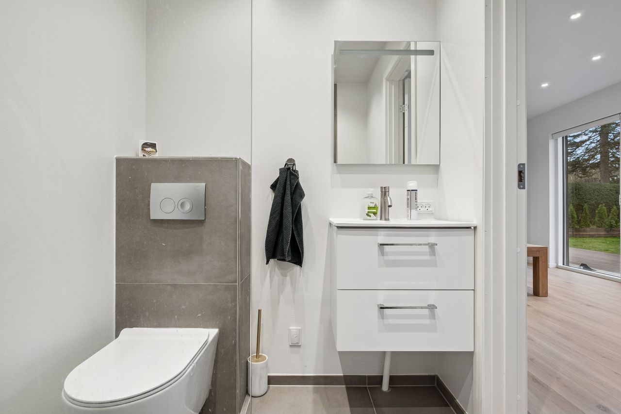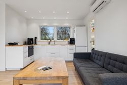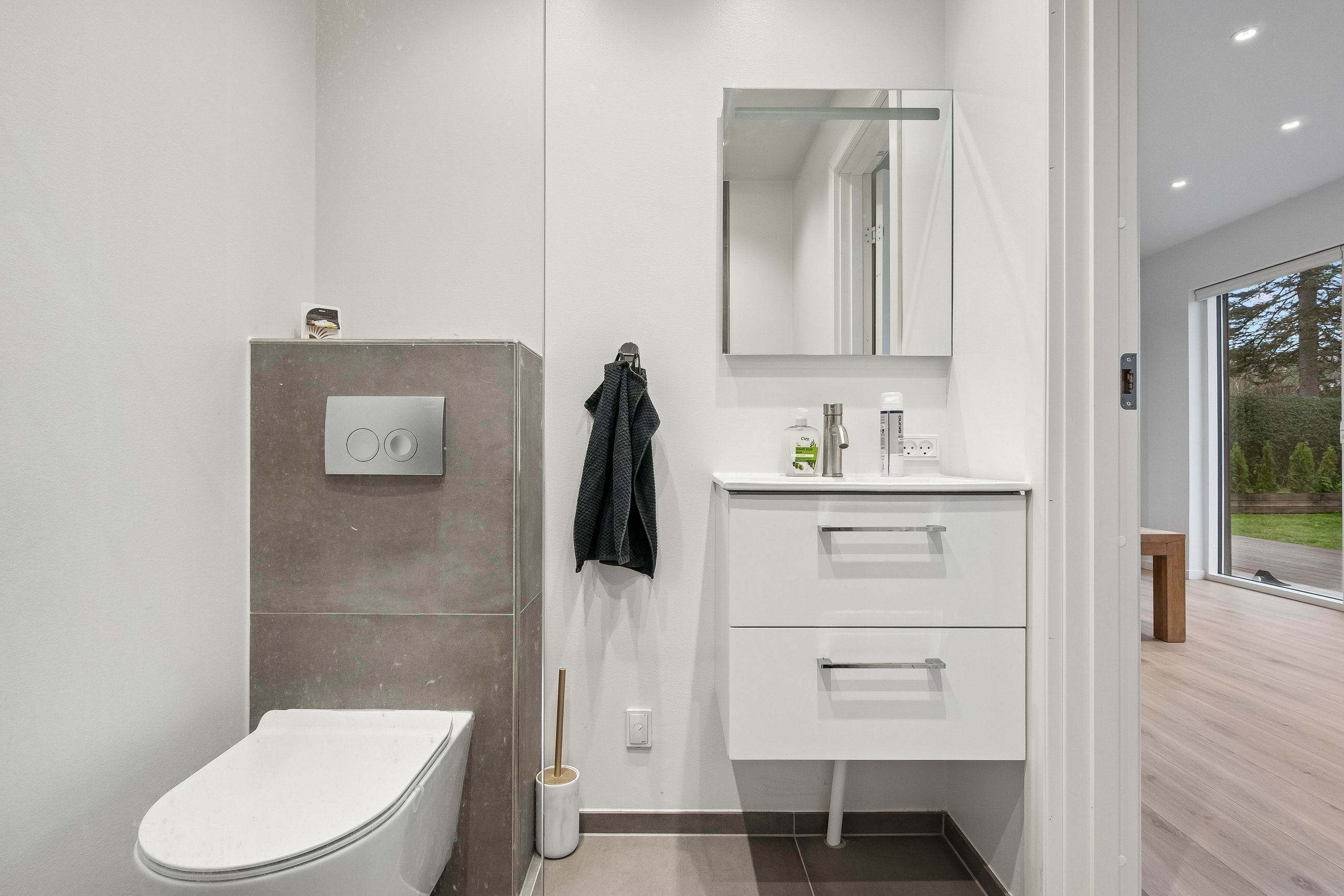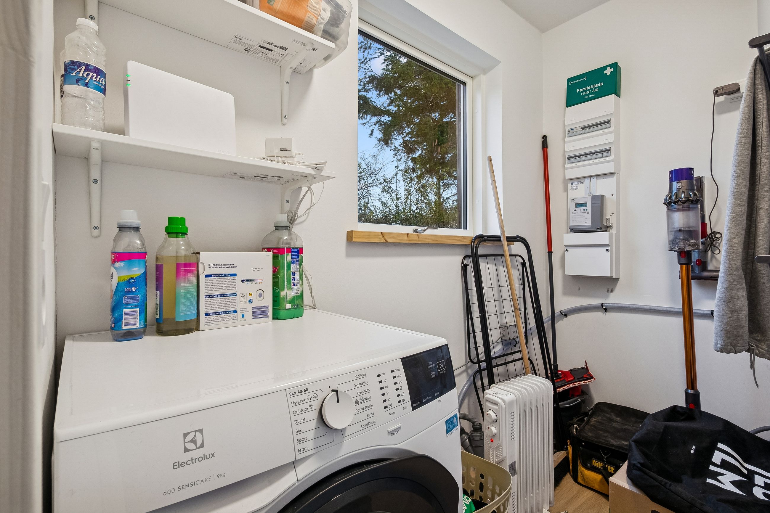Boligens naturlige samlingspunkt er det lyse opholdsrum, hvor køkken, spiseplads og stue smelter sammen og skaber en behagelig og rummelig atmosfære. Herfra er der direkte adgang til husets absolutte highlight: den store vestvendte træterrasse. Terrassen er perfekt til både afslapning, grillaftener og gæster – og byder på en skøn udsigt hen over hustagene i området, så du virkelig kan nyde aftensolen og den fredfyldte stemning.