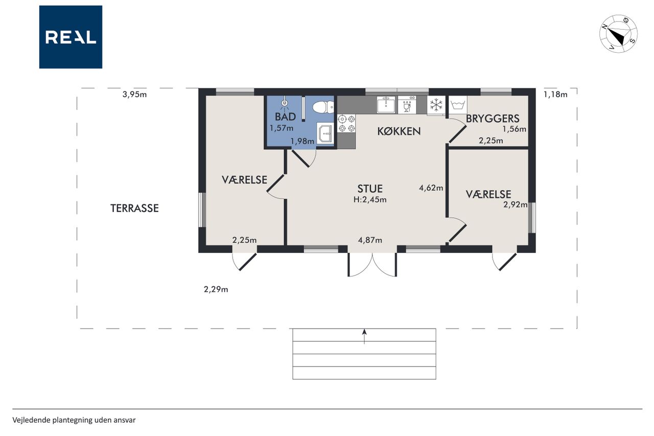 Huset fremstår indbydende med sin varme træfacade og store vinduespartier, der lader lyset strømme ind og giver en flot visuel forbindelse mellem inde- og udeliv. Indenfor venter en veludnyttet planløsning bestående af to gode værelser, et hyggeligt og åbent køkken-alrum i forbindelse med stuen, et lille men praktisk bryggers samt et moderne badeværelsesmiljø.