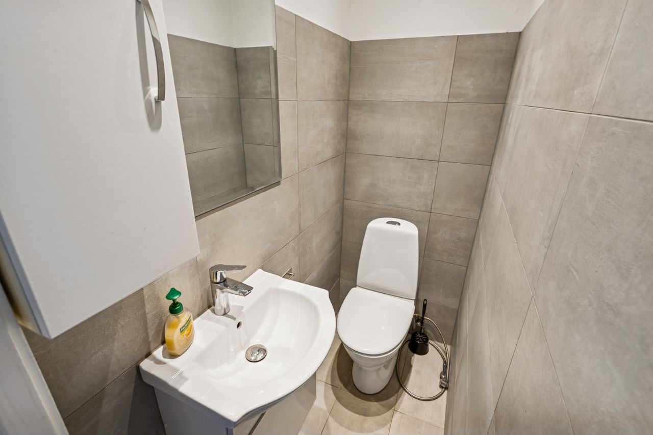 Når du træder ind i stueplanen, mødes du af en indbydende entré med praktisk skabsplads. Herfra ledes du videre til det funktionelle køkken, hvor madlavning bliver en leg. Det tilstødende toilet er ideelt placeret for gæster og dagligt brug. Den rummelige stue inviterer til hyggelige stunder med familien eller afslapning foran fjernsynet. Fra stuen er der direkte adgang til den overdækkede terrasse – perfekt til udendørs middage eller morgenkaffe i solen.