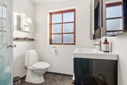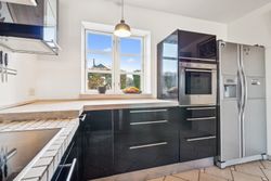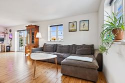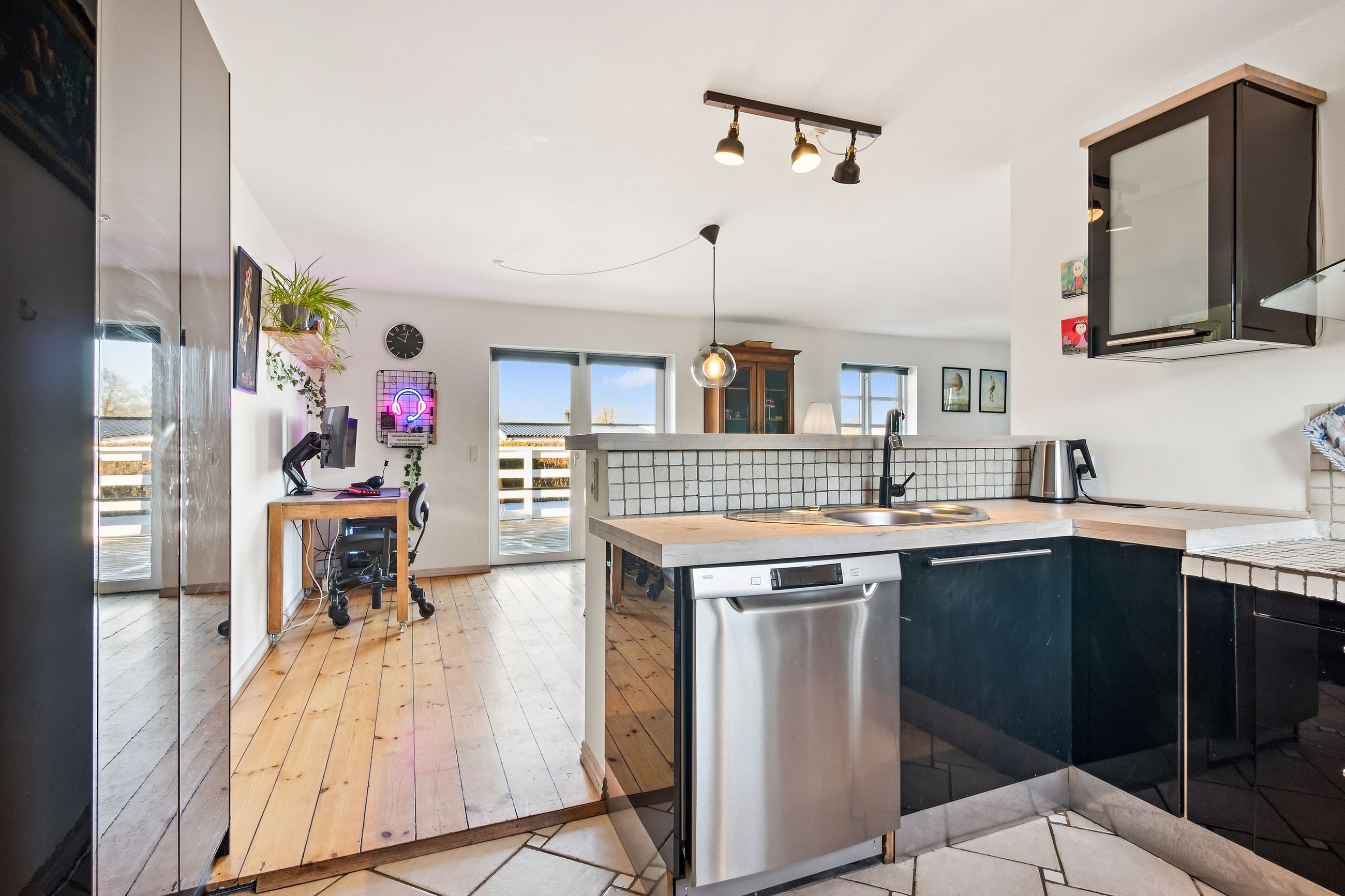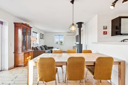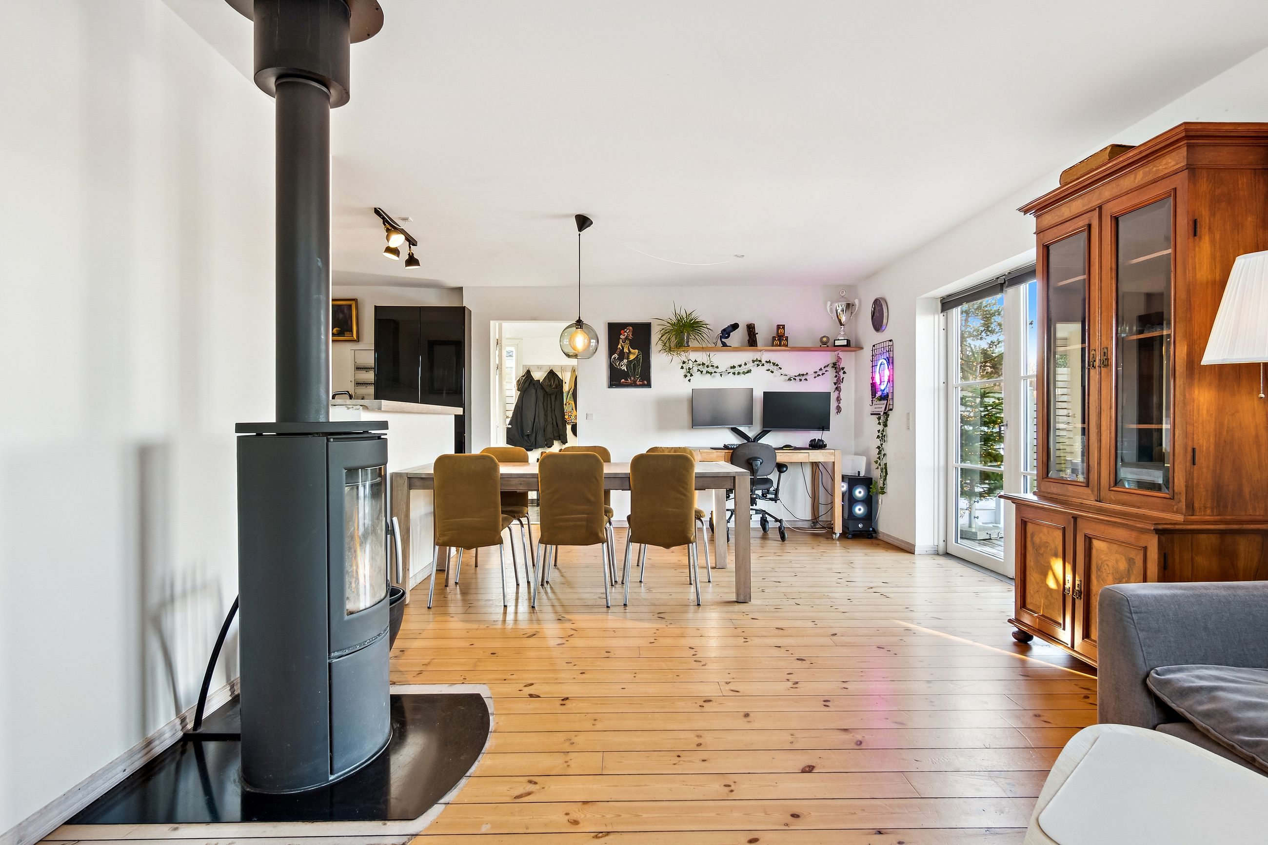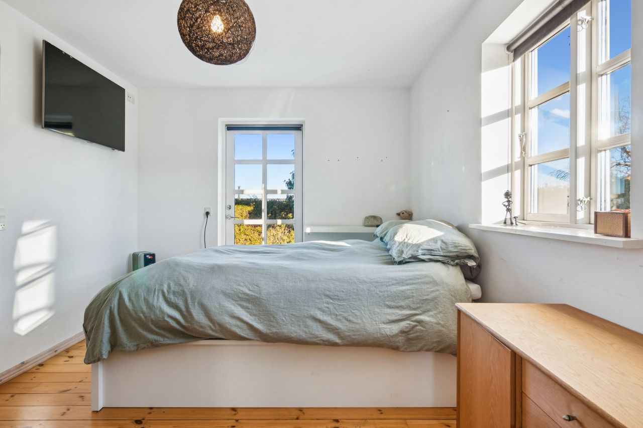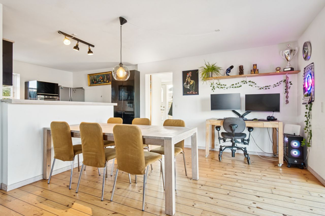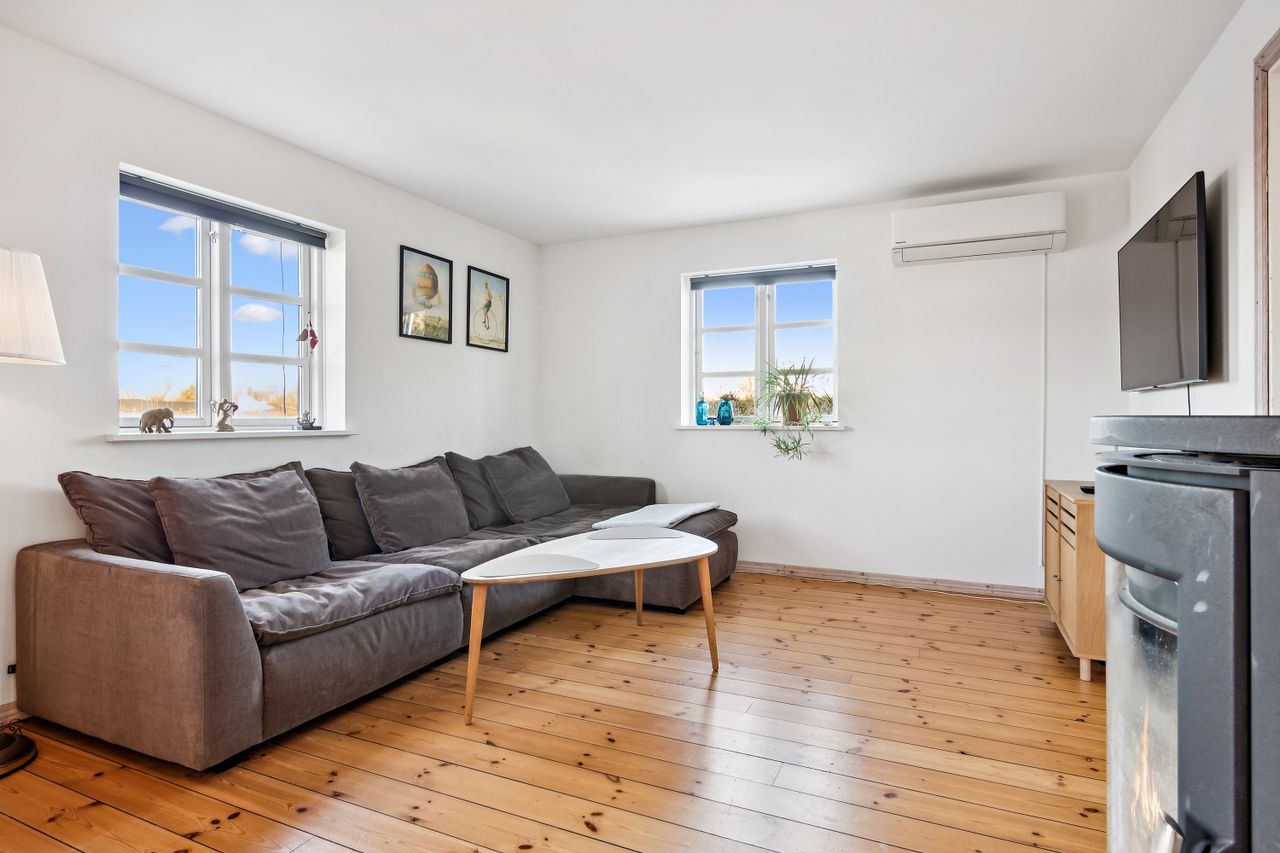 Boligen byder på et stort, lyst og åbent køkken-alrum og stue i ét, hvor brændeovn og luft-til-luft varmepumpe sikrer både hygge og komfort uanset årstid. Her er god plads til samvær, afslapning og gæster. Dertil kommer to regulære værelser samt et opdateret badeværelse og køkken i tidssvarende stil.