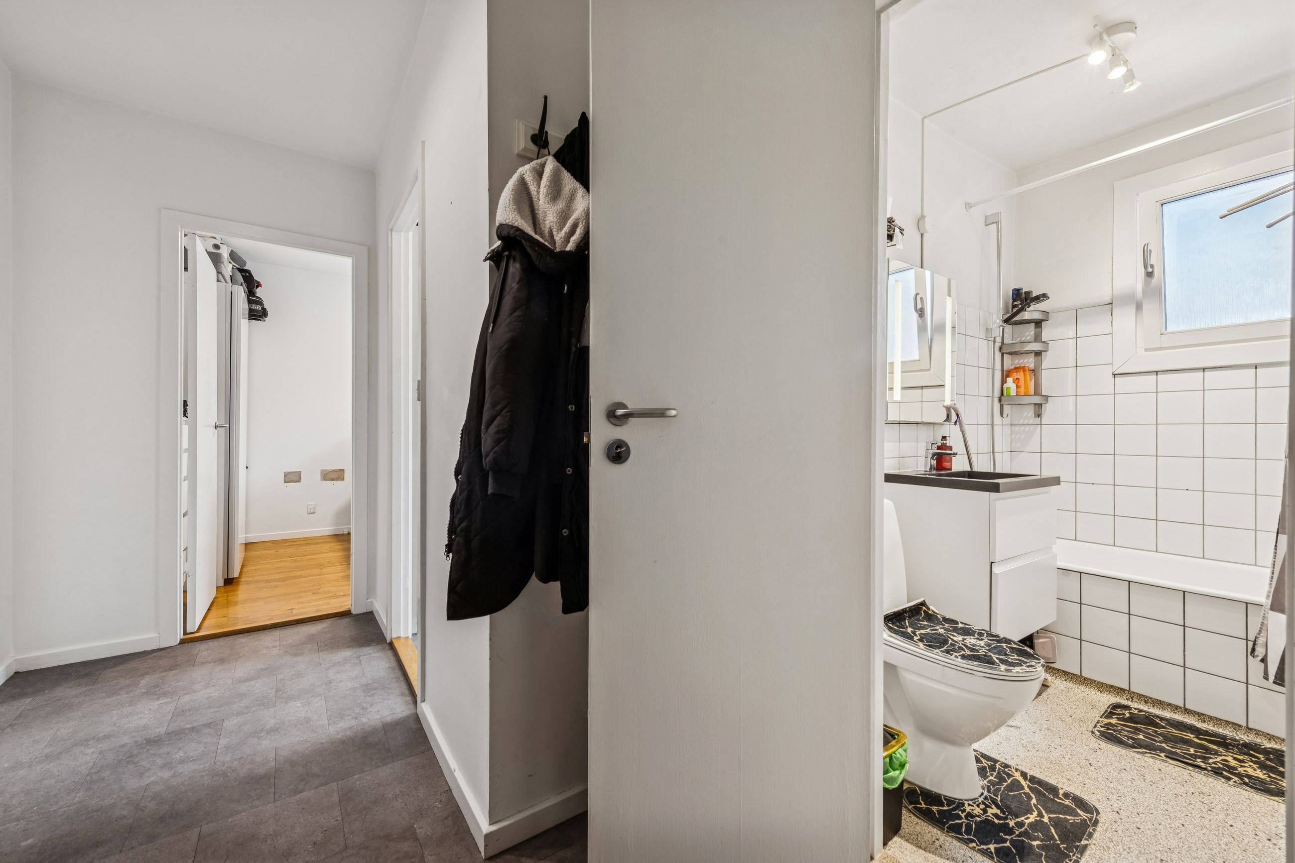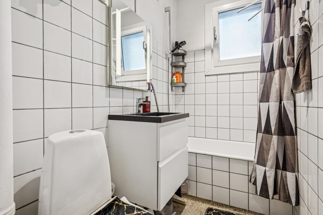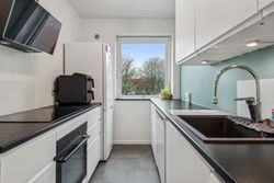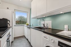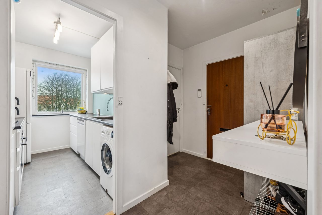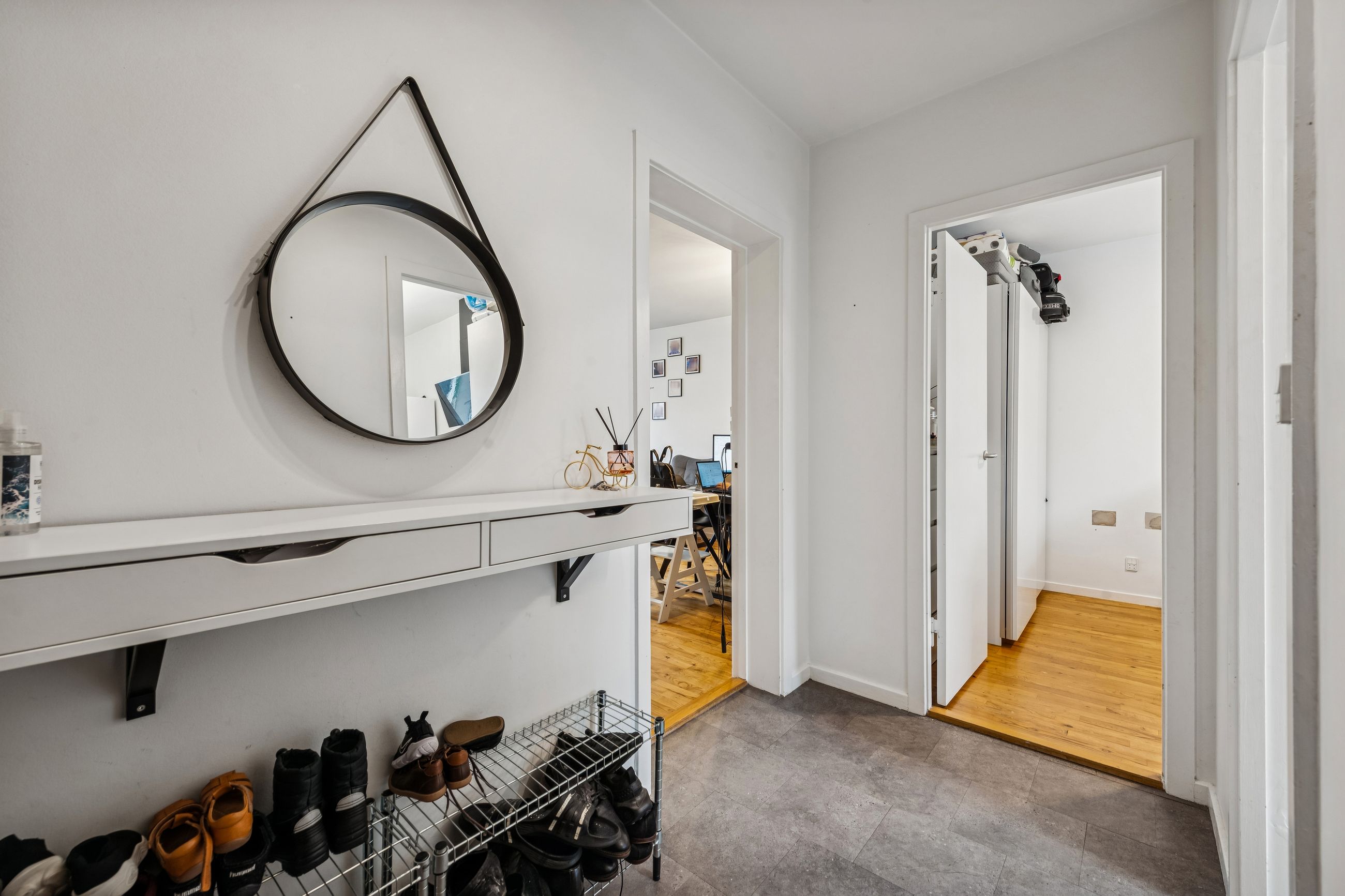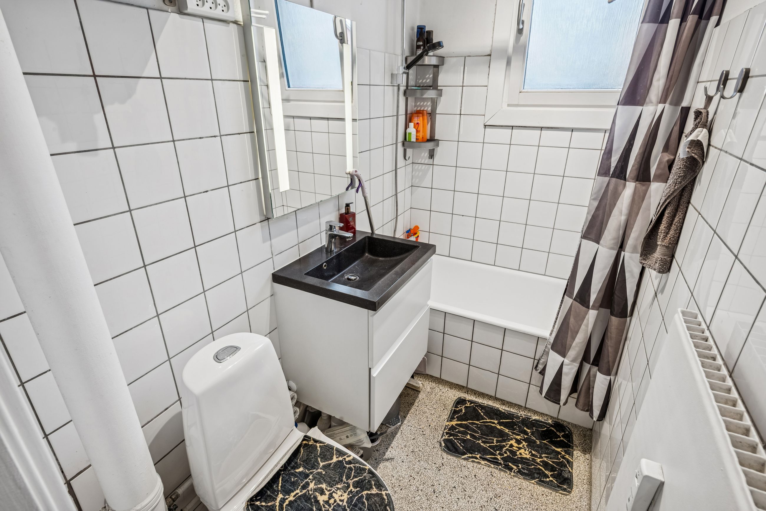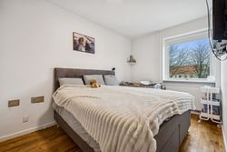 Når du træder ind i lejligheden, mødes du af en praktisk entré med indbygget skab, der giver god opbevaringsplads til overtøj og sko. Herfra ledes du videre til det lyse soveværelse, som er perfekt dimensioneret til at skabe et afslappende fristed efter en lang dag. Det moderniserede badeværelse imponerer med sine stilrene linjer og den gode plads.