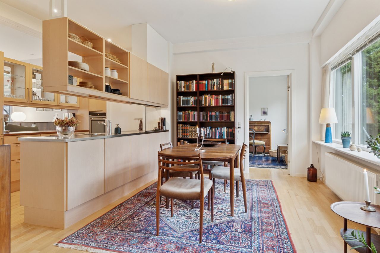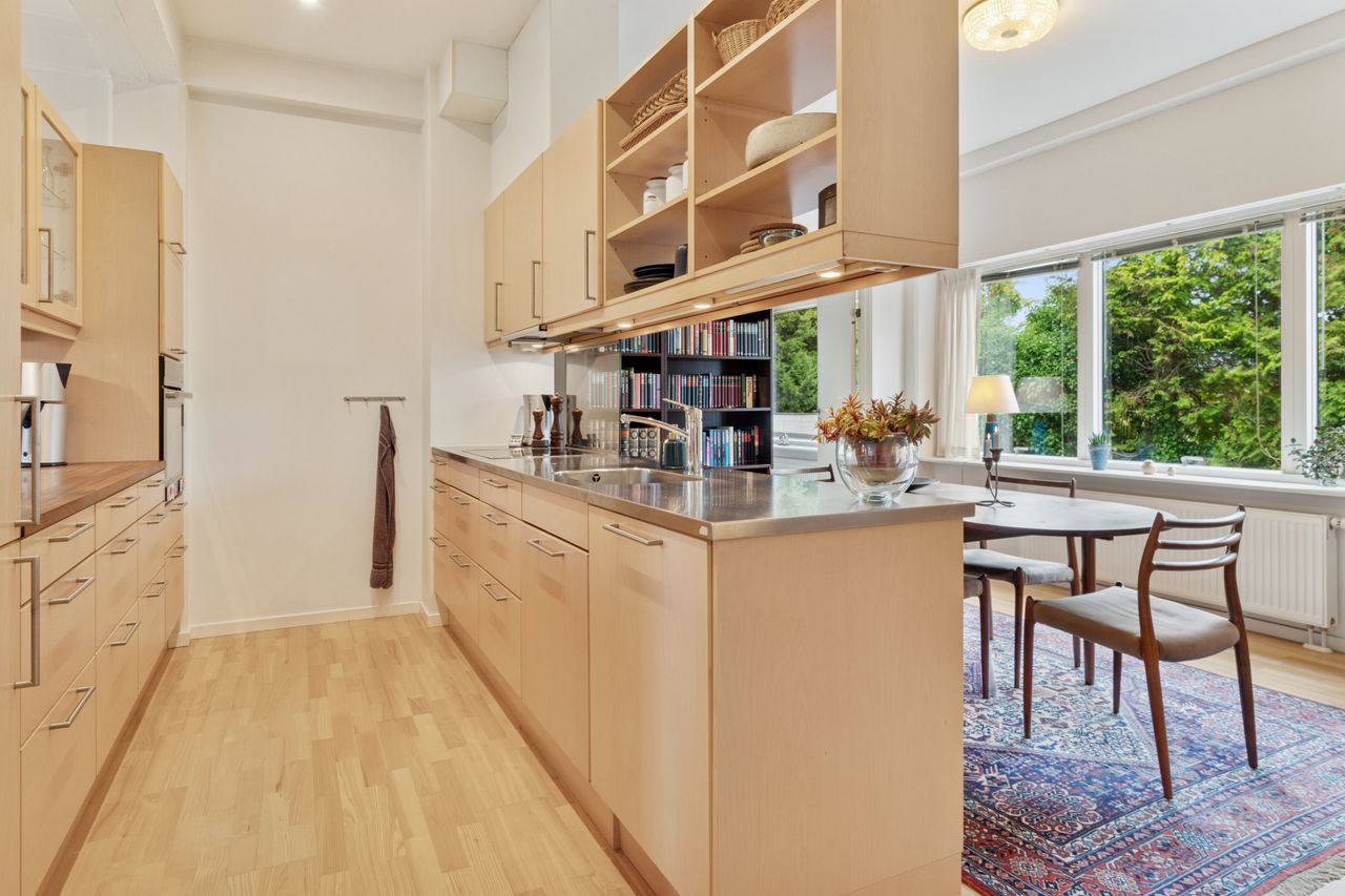 Lejligheden er kendetegnet ved et godt lysindfald hele dagen og en gennemtænkt planløsning, der gør det nemt at indrette sig. Det funktionelle og moderne køkken er centrum for lejligheden og deler på en elegant måde lejligheden op.