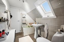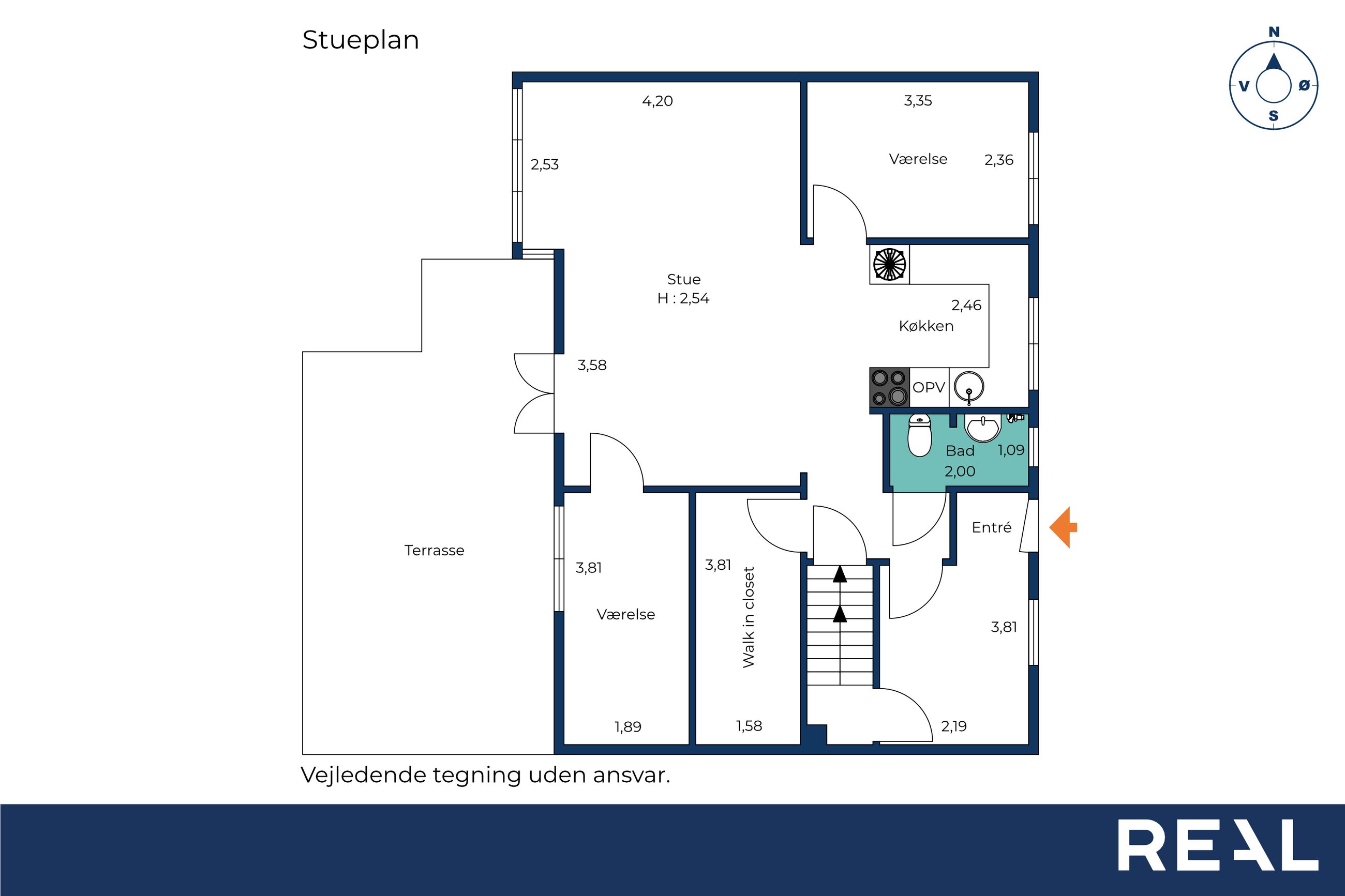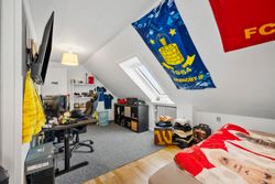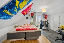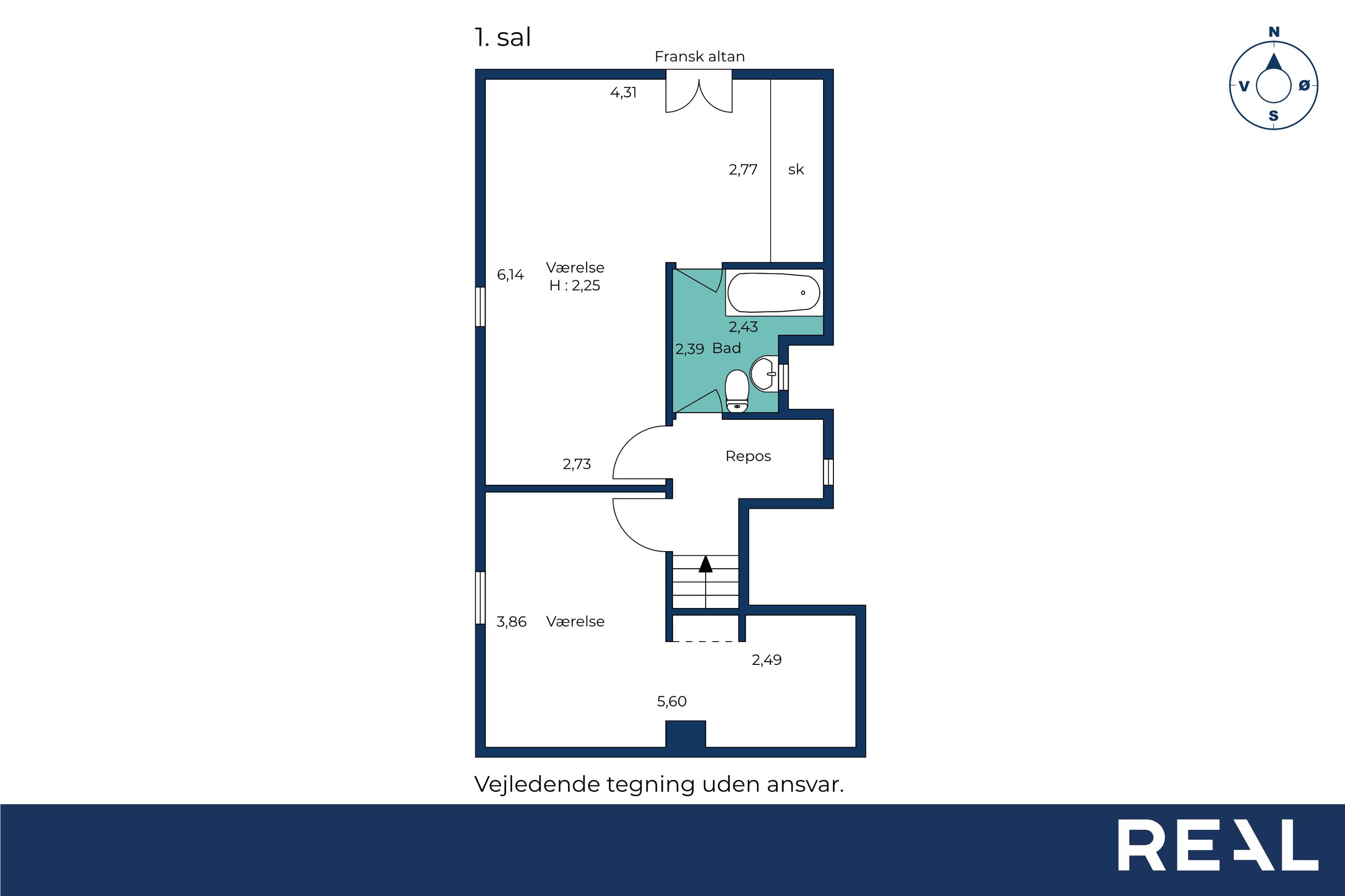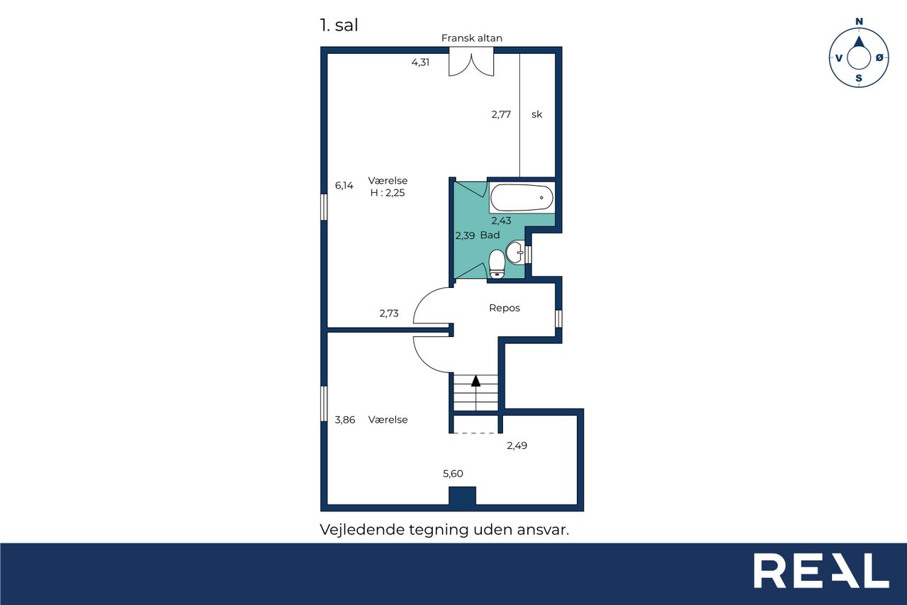 På 1. sal findes to værelser samt badeværelse. Planløsningen giver en klar opdeling mellem opholdsrum og værelsesafdeling og understøtter en praktisk hverdag.